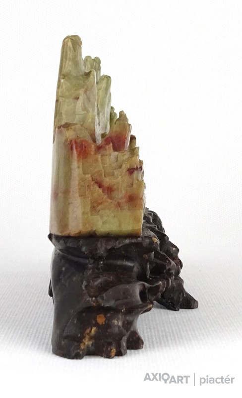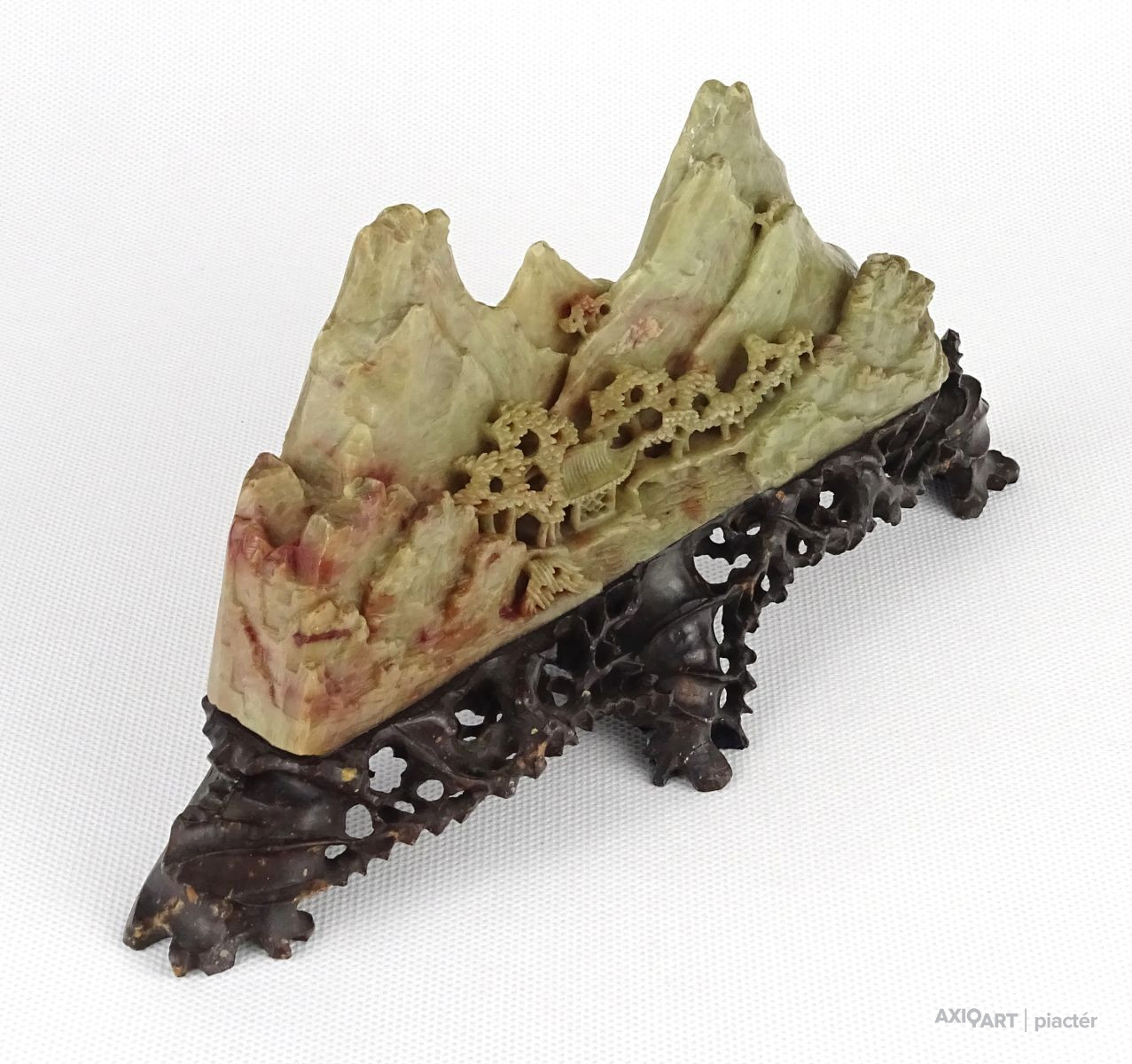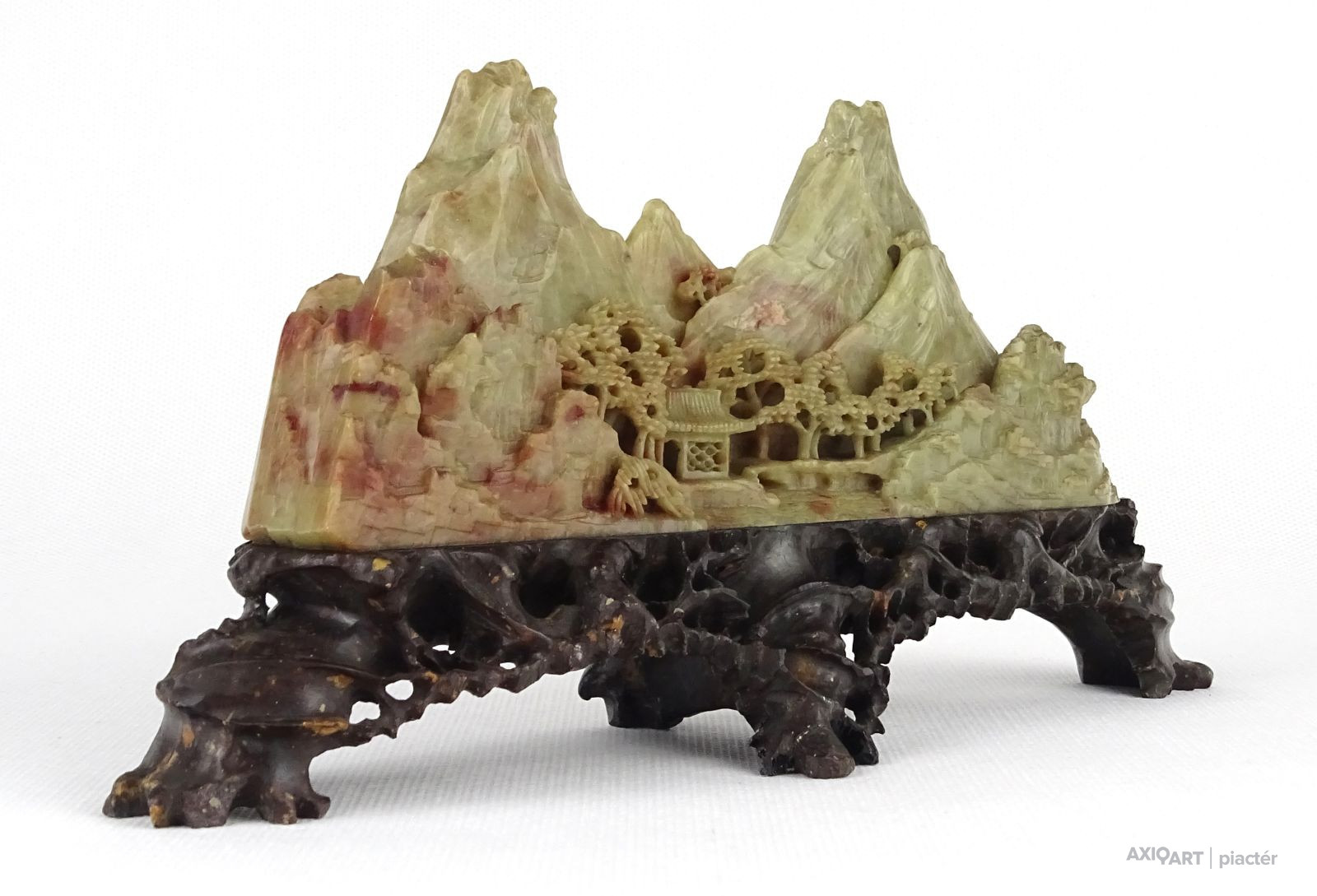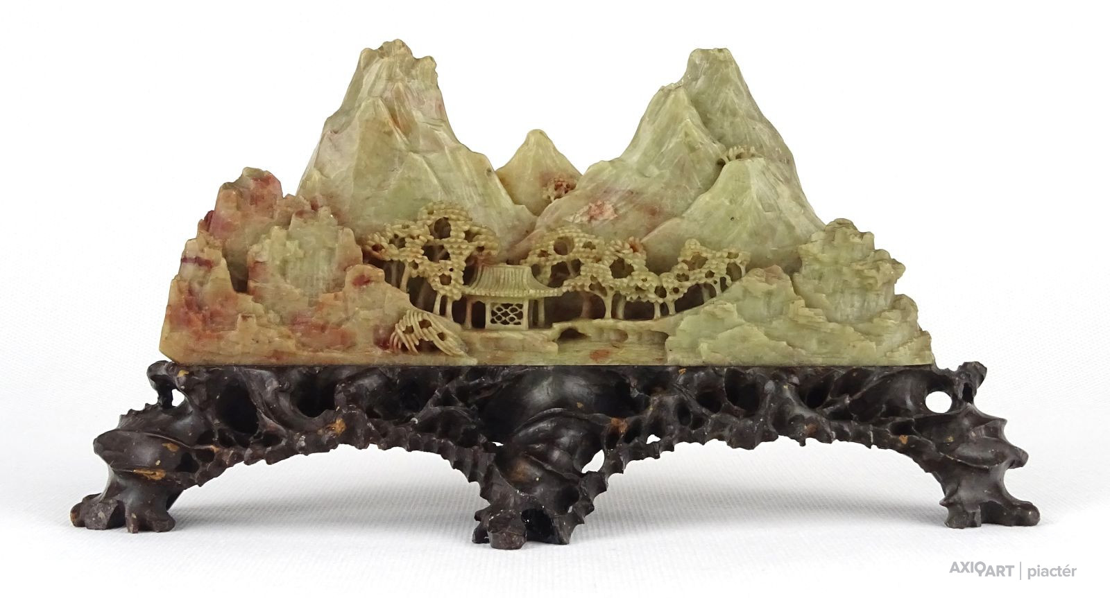 Kézi faragású, régi zsírkő dísztárgy, szintén faragott kőzet talapzaton. Hegyvidéki tájat, hegyeket, fákat és egy házat ábrázoló faragás. Gyönyörű keleti dísztárgy.