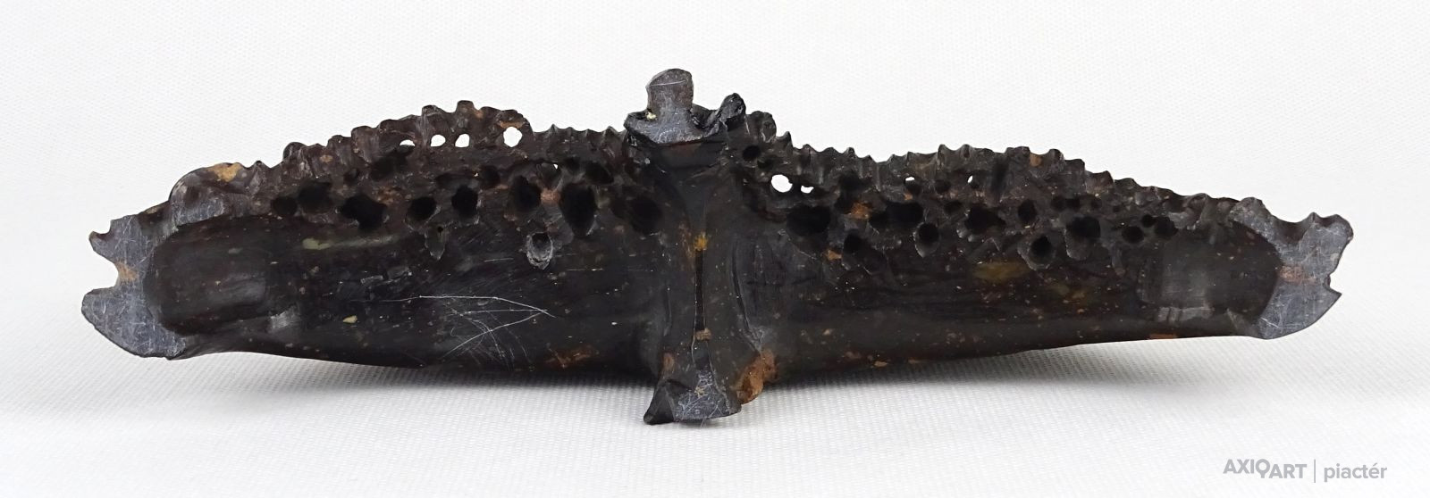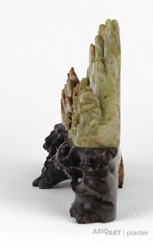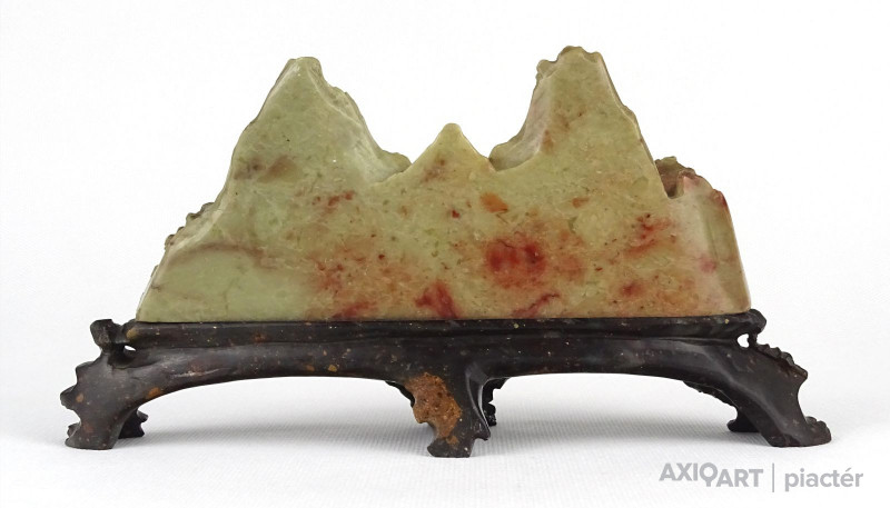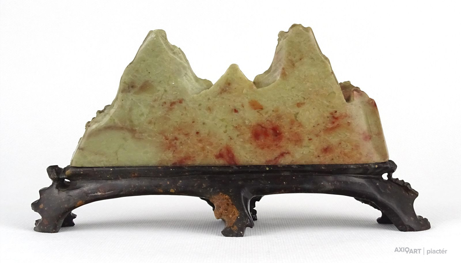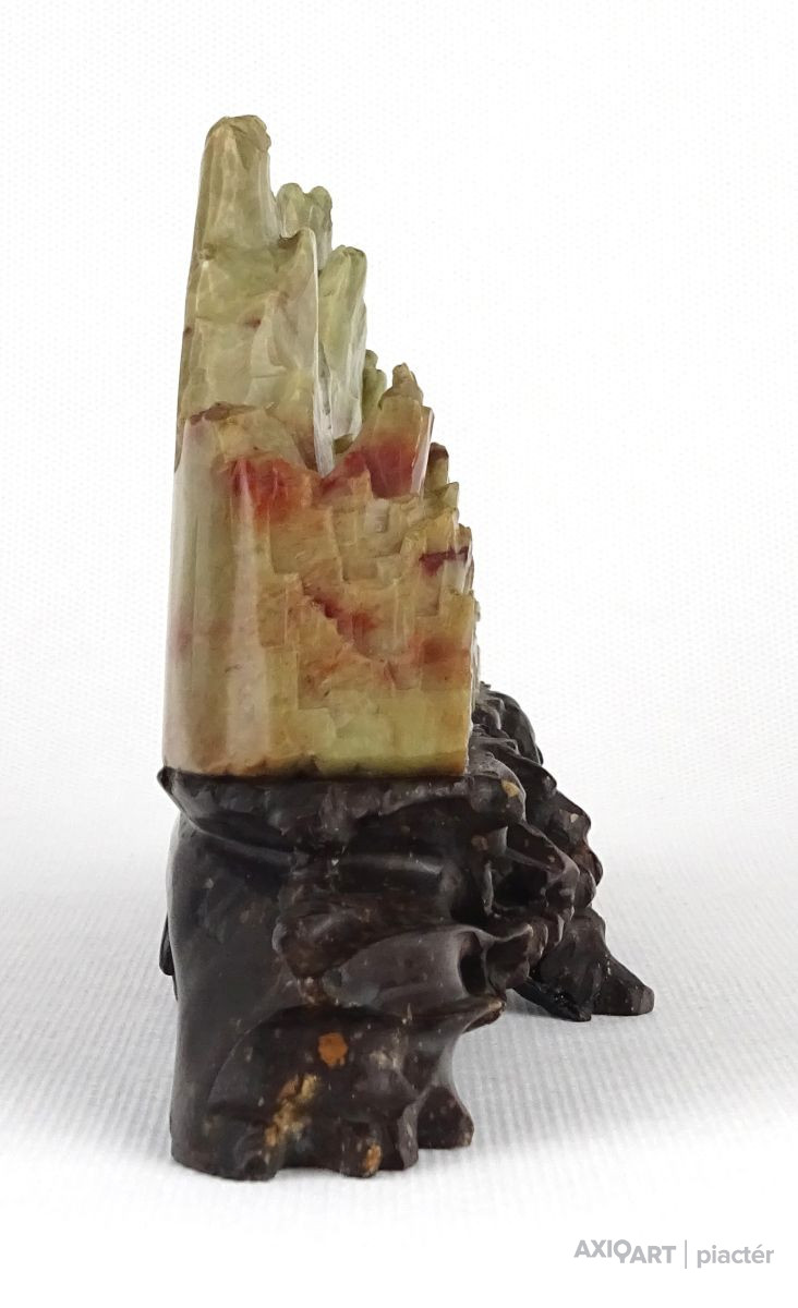 Kézi faragású, régi zsírkő dísztárgy, szintén faragott kőzet talapzaton. Hegyvidéki tájat, hegyeket, fákat és egy házat ábrázoló faragás. Gyönyörű keleti dísztárgy.