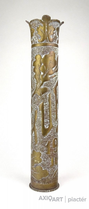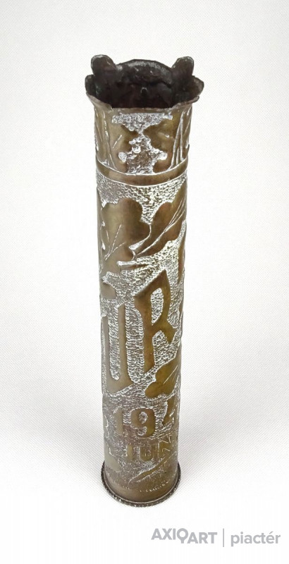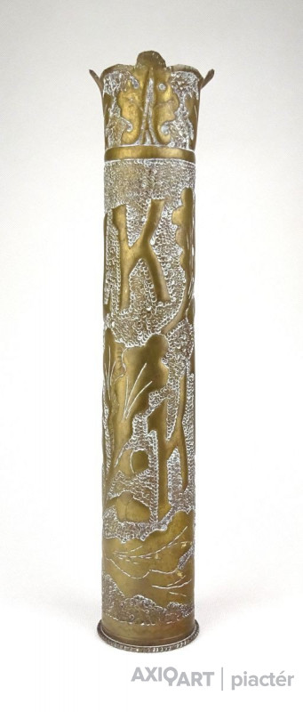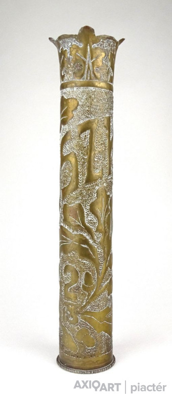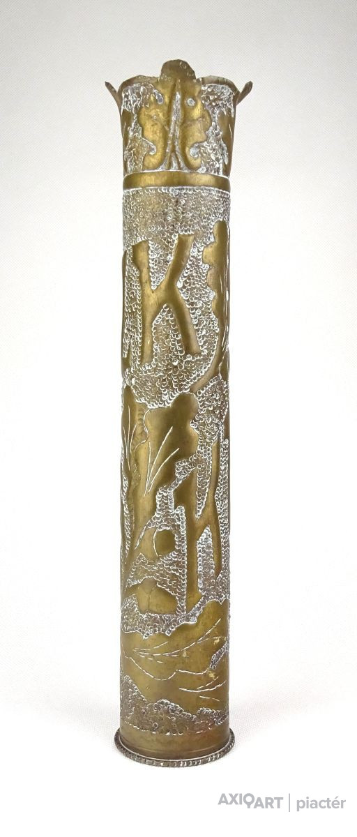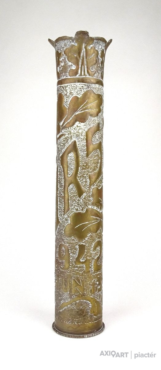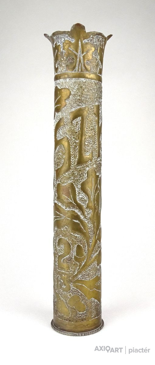 Régi hadi relikvia, hadi emlék. Lövegből készített, szépen megmunkált, hadifogoly munka, hadi emlék, díszváza.