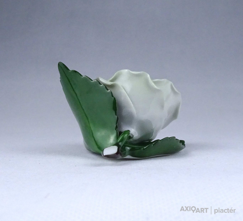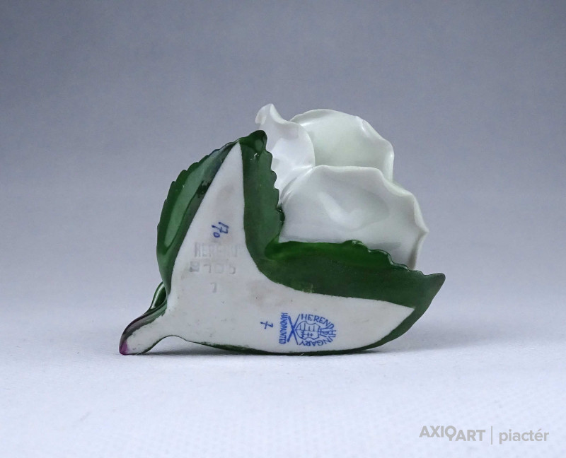 [1Z826/Z022] Régi, hibátlan állapotú, halványzöld Herendi porcelán rózsa. Az egyik levél széle restaurátor által szakszerűen javított. Alján kék Herendi márkajelzés: HEREND HUNGARY HANDPAINTED Mélynyomással: HEREND Formaszám: 9105 Magasság: 4.9 cm Szélesség: 6.5 cm Hosszúság: 7.5 cm Súly: 0.09 kg