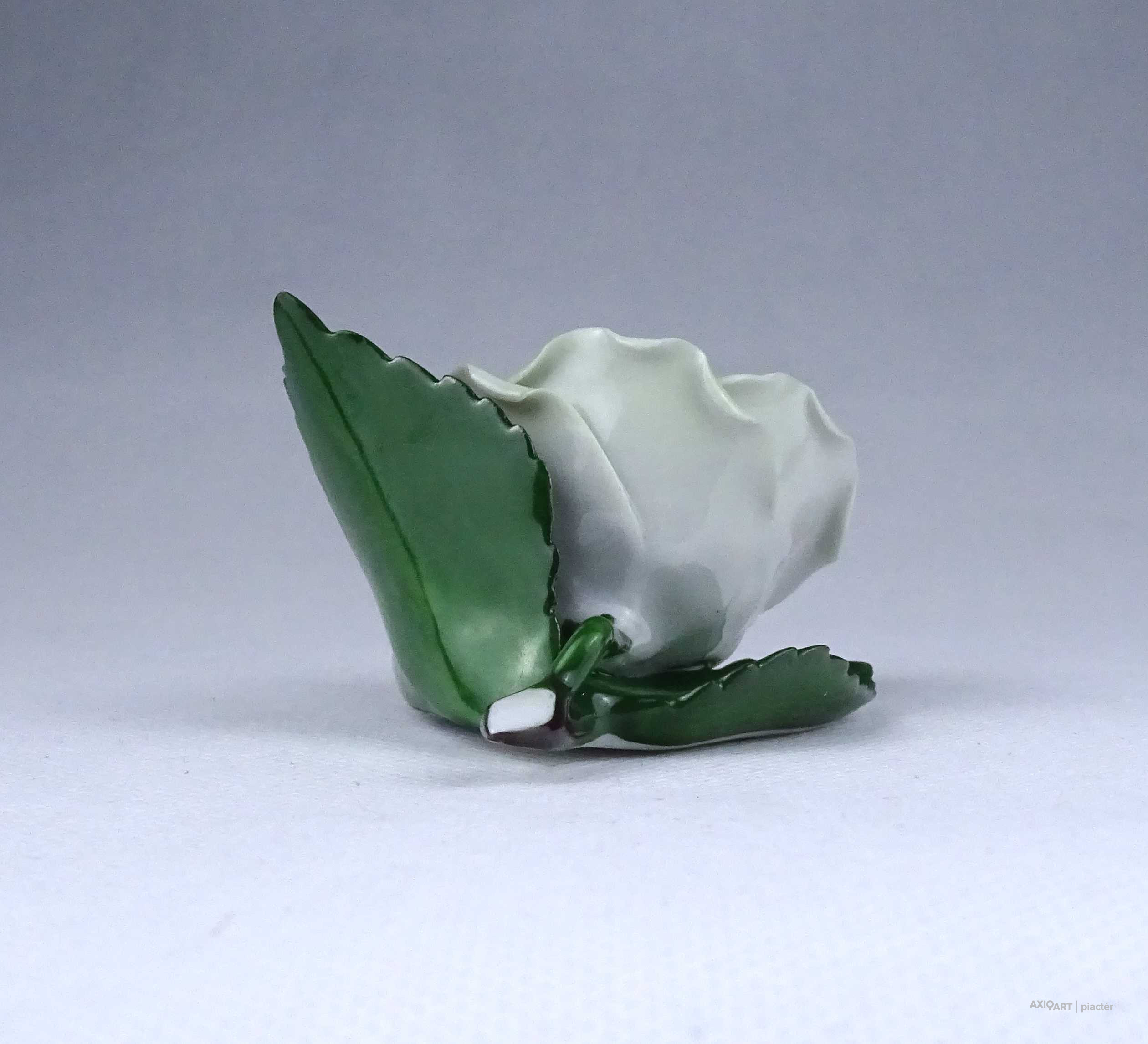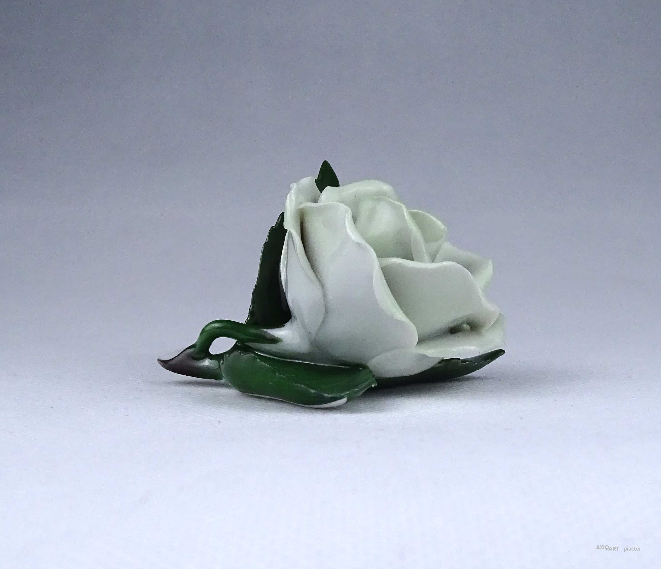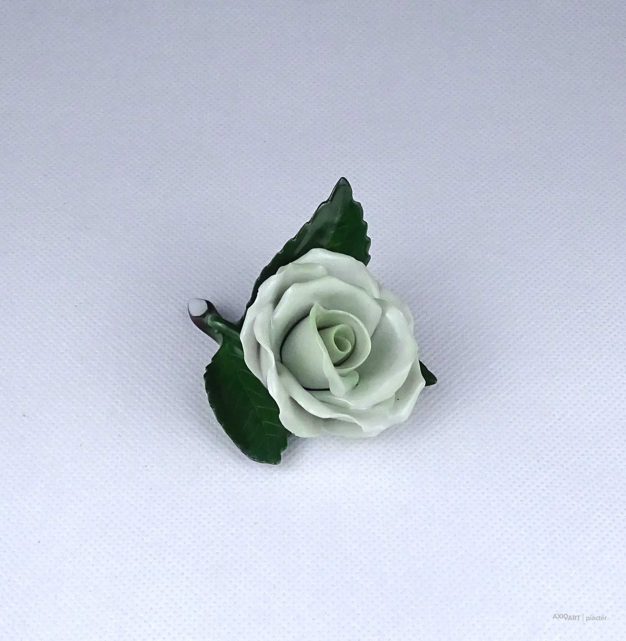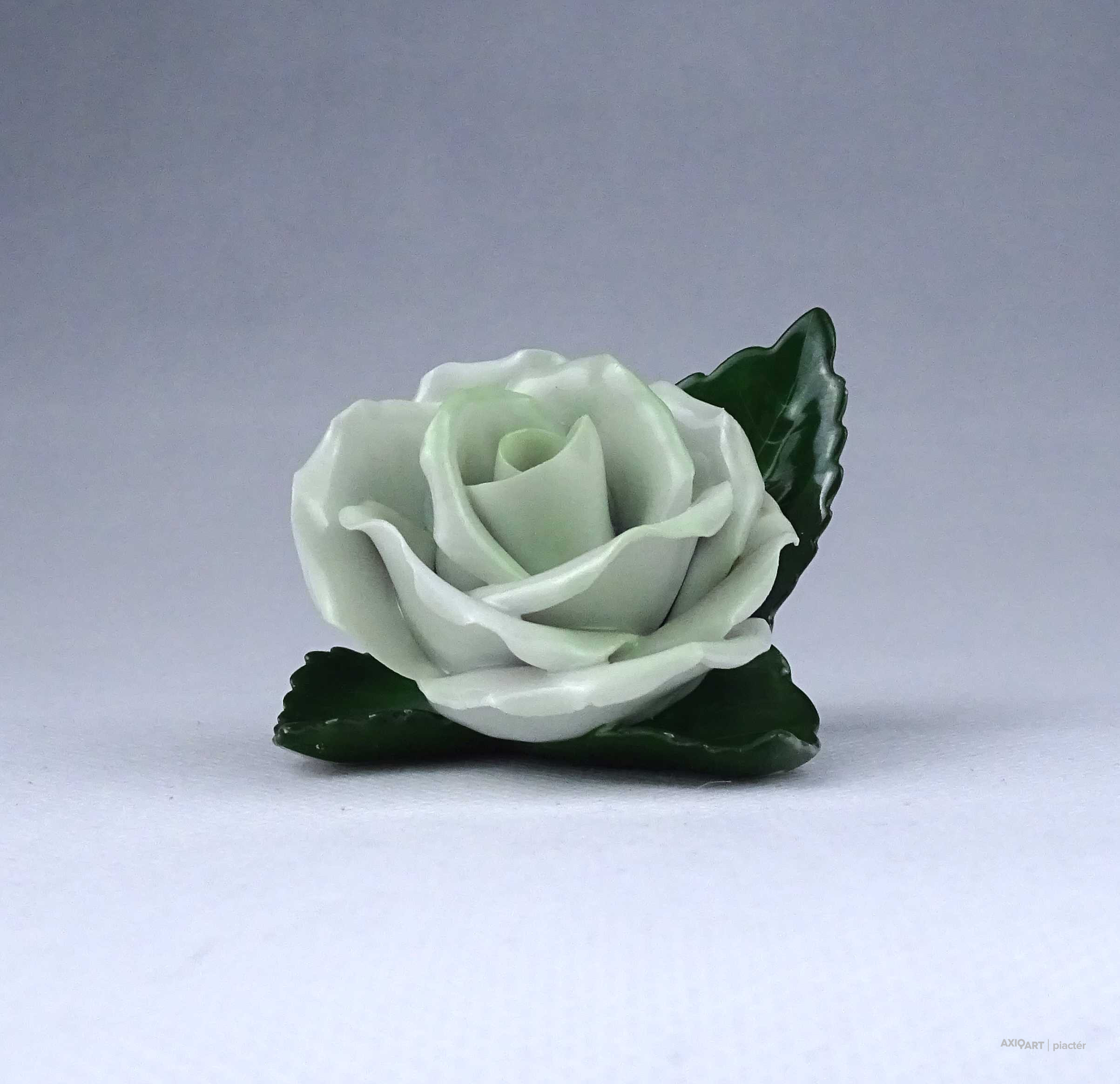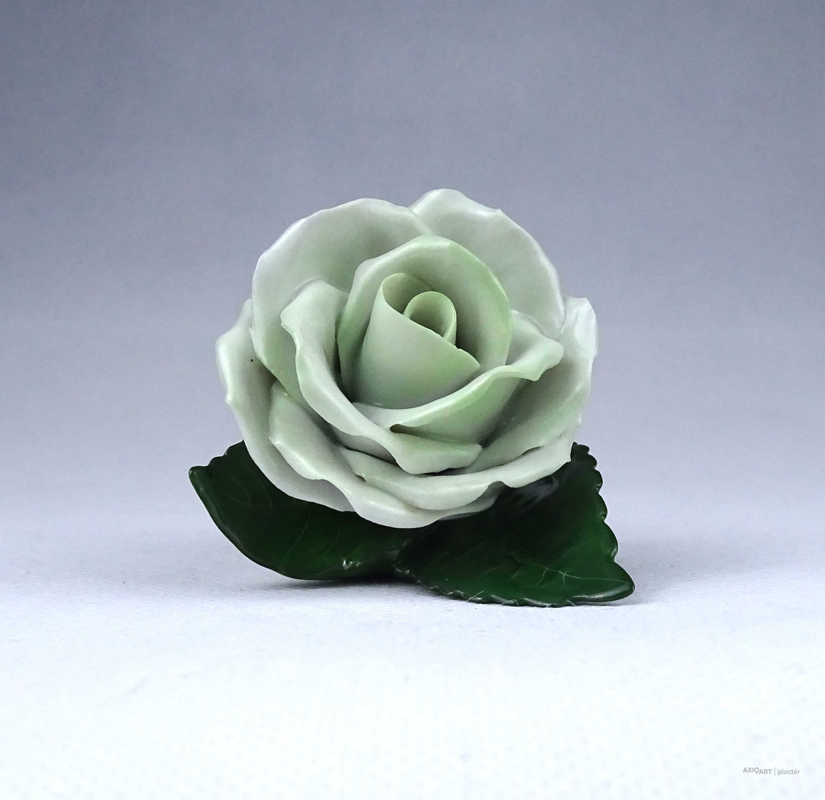 Régi, hibátlan állapotú, halványzöld Herendi porcelán rózsa. Az egyik levél széle restaurátor által szakszerűen javított.