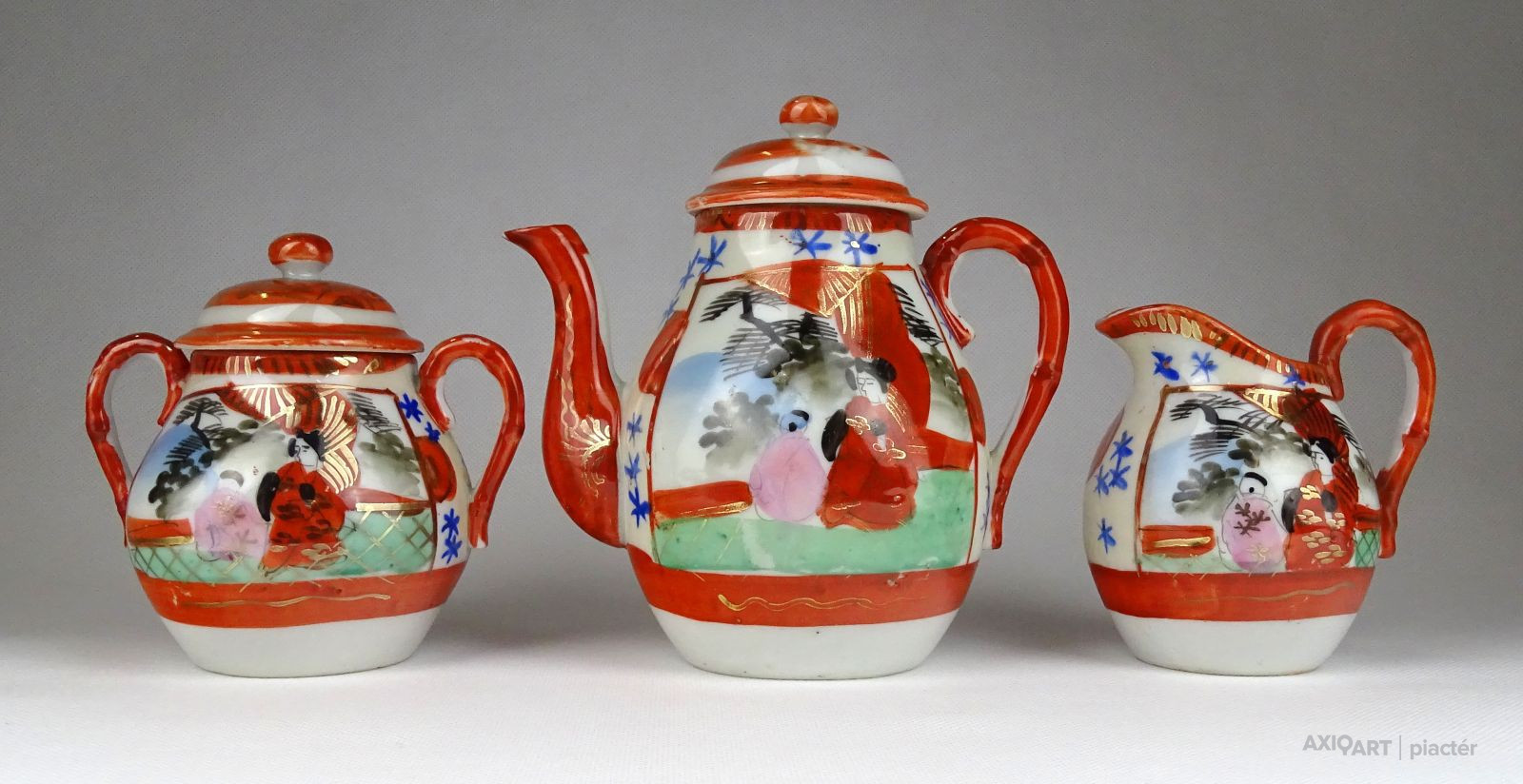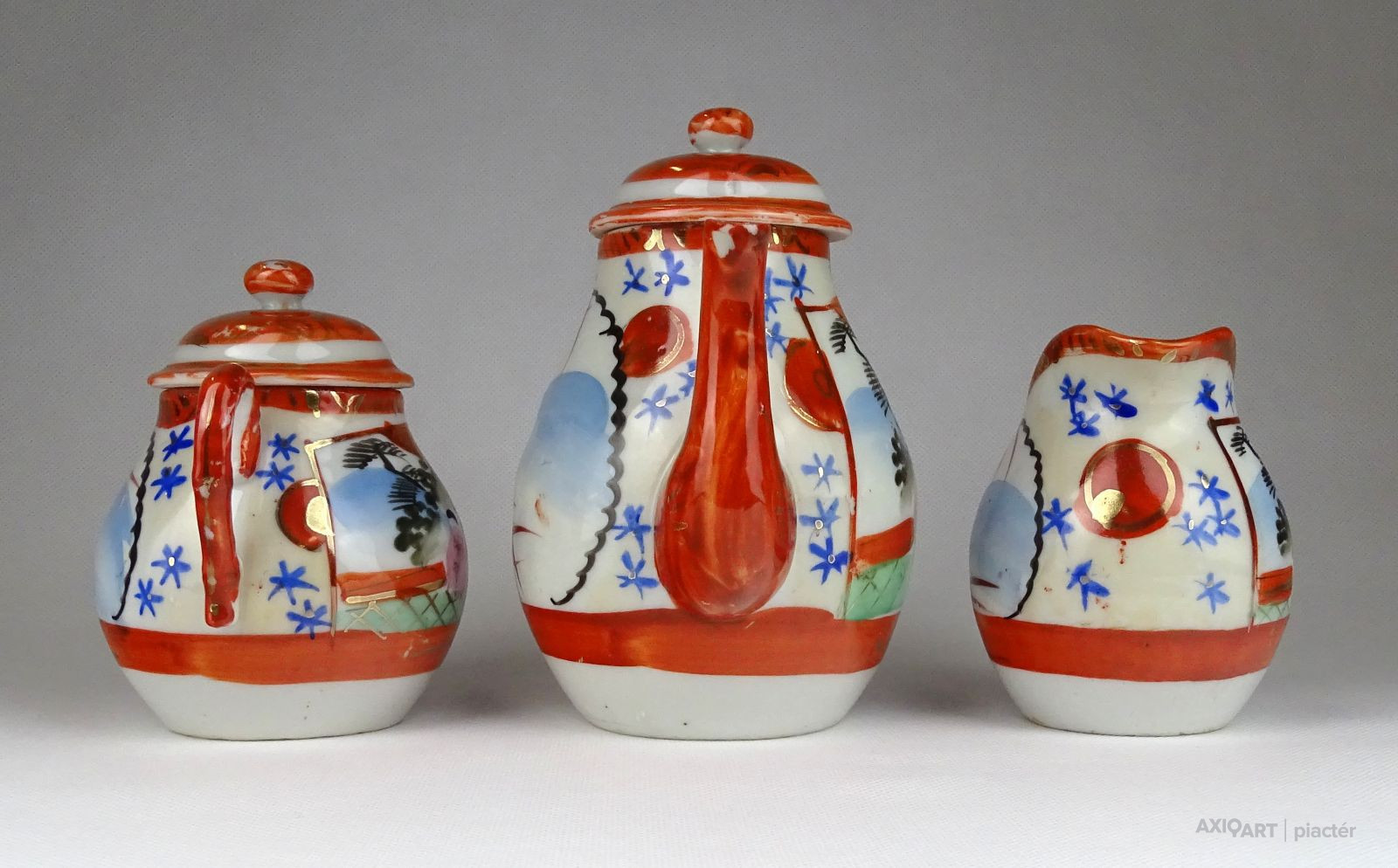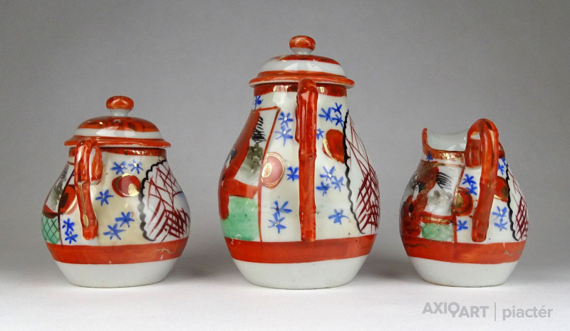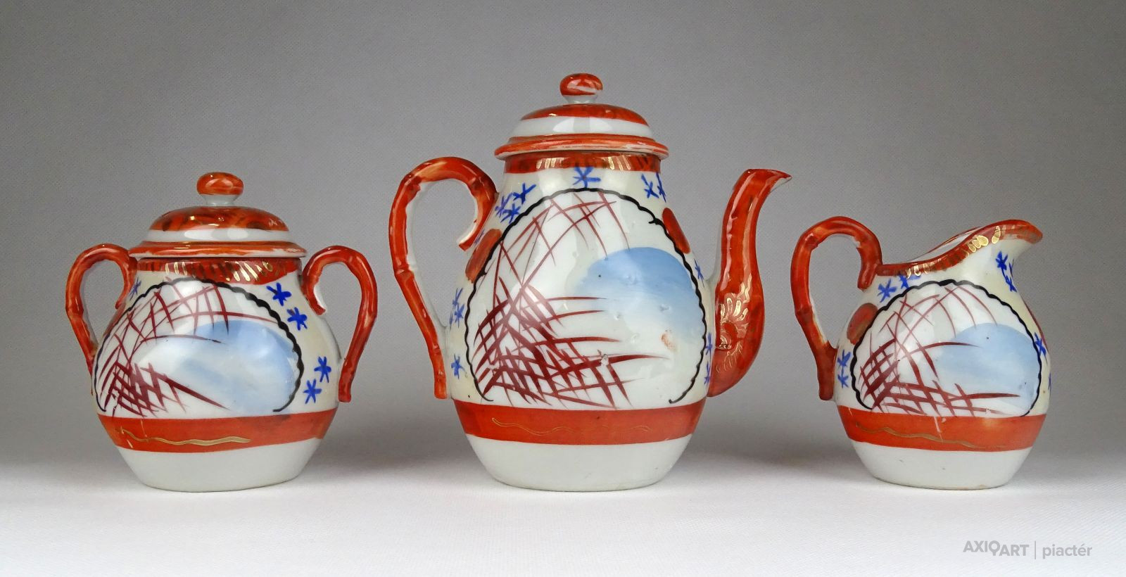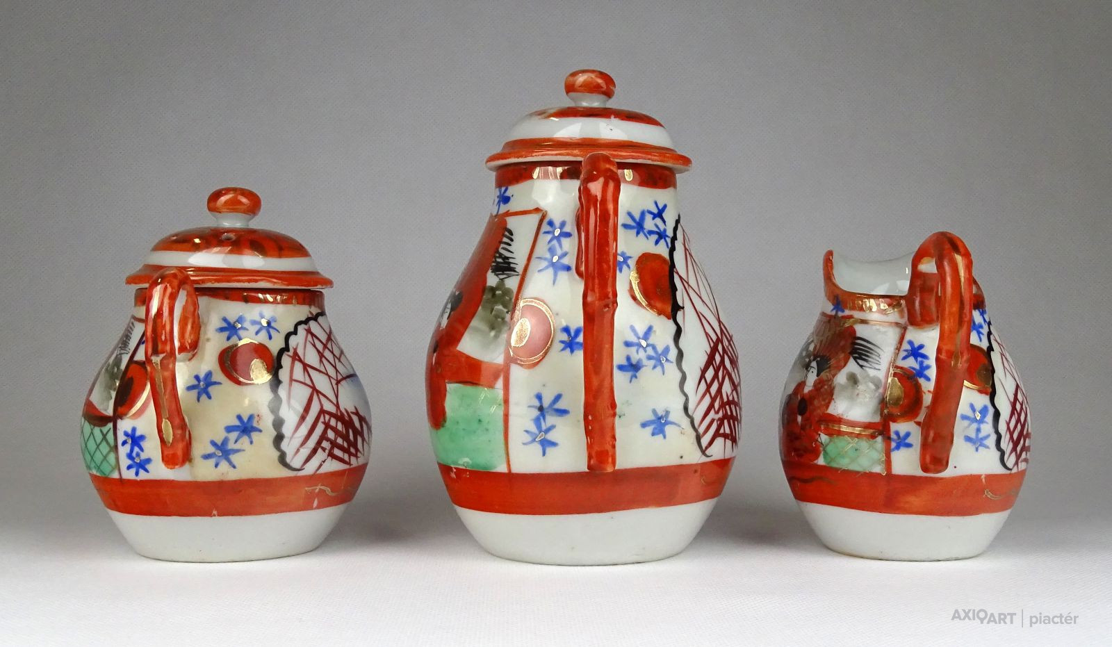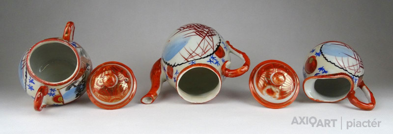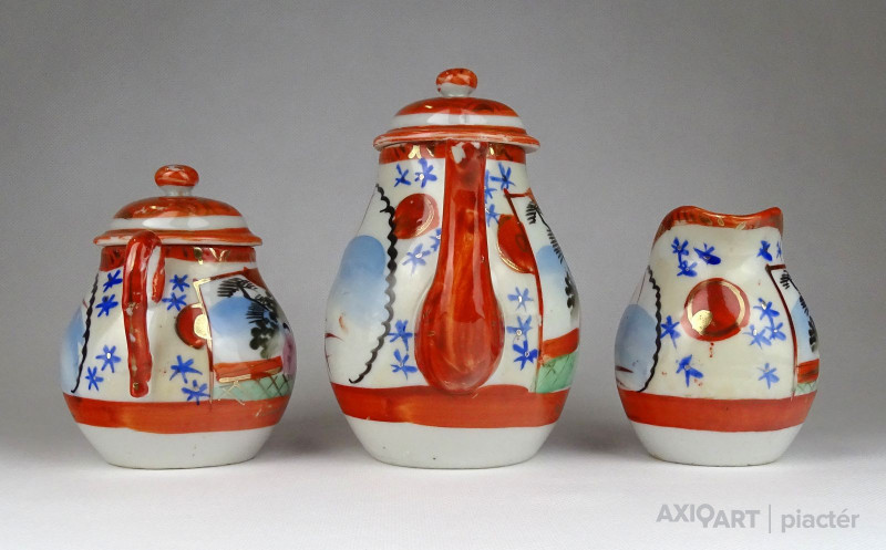 [0X451/X060] Kínai porcelán teás vagy kávés készlet gazdag kézi festésű díszítéssel. A készlet darabjai: - 1 darab kiöntő (14.5 x 9.3 x 14.3 cm) - 1 darab cukortartó (11 x 8.2 x 11 cm) - 1 darab tejszínes kiöntő (9.2 x 7.2 x 9 cm) A füle restaurált. Súly: 0.735 kg