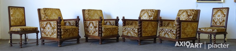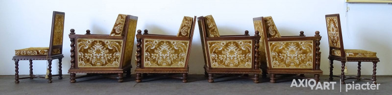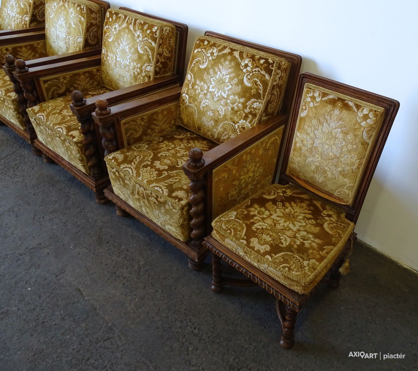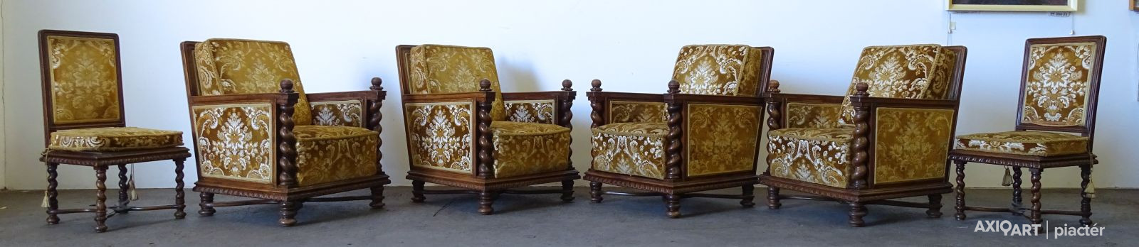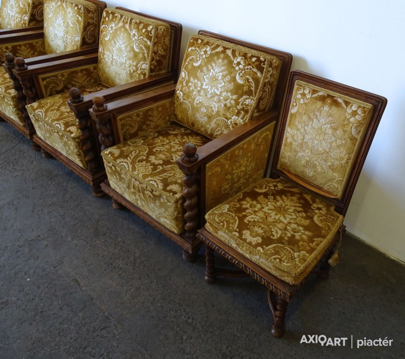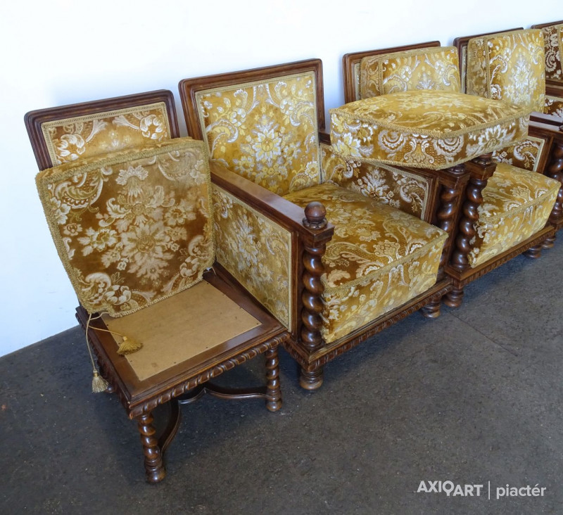 Régi, hat darabos csavart oszlopos szalon garnitúra, fotón látható szép állapotban. Ülőfelületük kényelmes rugósak, egységesen kárpitozottak. Azonnal enteriőrbe helyezhető állapotban vannak.