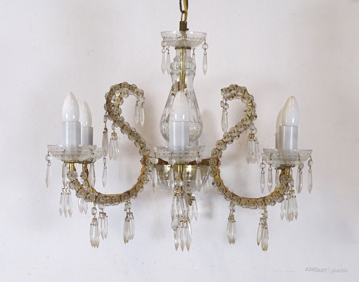 Szép, ép állapotú, csiszolt üveg elemekkel díszített középméretű csillár. Hat darab kisméretű (E14) égővel rendelkezik. Egy-két kisebb dísz hiány előfordulhat rajta.