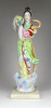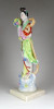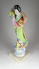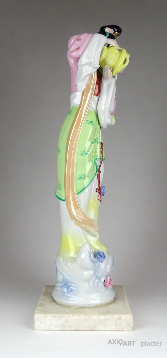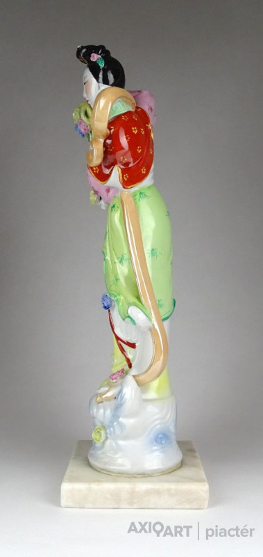 Régi, nagy méretű, márvány talapzaton álló, kézzel festéssel díszített porcelán nő figura. Fekete haja kontyban, kezében virágkosár. Tavaszt hozó nagy méretű szobor.
