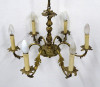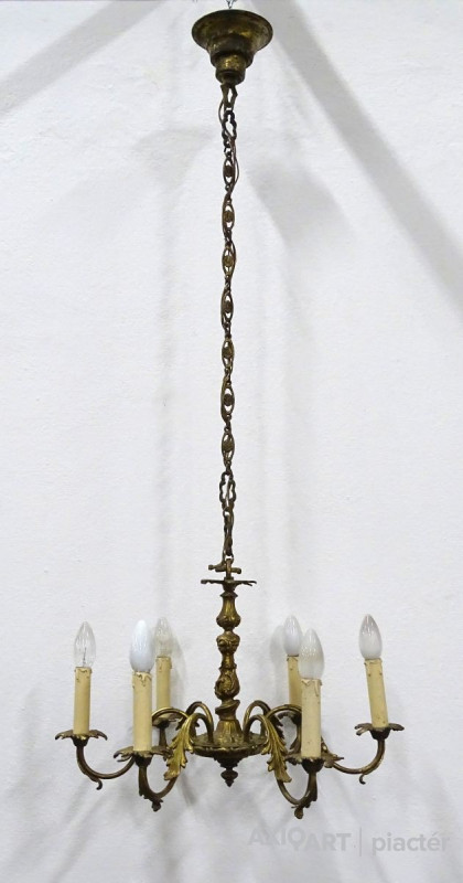 Régi, szép állapotú, hatkarú mennyezeti lámpa, csillár. A test barokkos formavilágú, karokon gyönyörű levél díszítés. A karok papírmasé gyertyákban végződnek, kisméretű izzó való bele.
