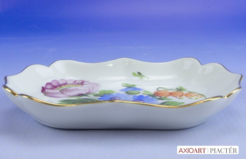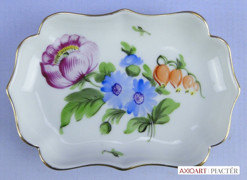 [0E049/VTR-15] Hibátlan állapotú, virág mintás Herendi porcelán tálka, hamutál, hamus, hamuzó. Alján kék Herendi ecsetes jelzés: HEREND Mélynyomással: HEREND Formaszám: 7758 Szélesség: 7.5 cm Hosszúság: 11 cm Súly: 0.067 kg