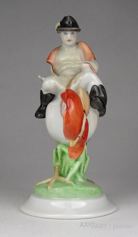 Hibátlan állapotú, régi, kézi festéssel díszített Kakas Marci porcelán figura.