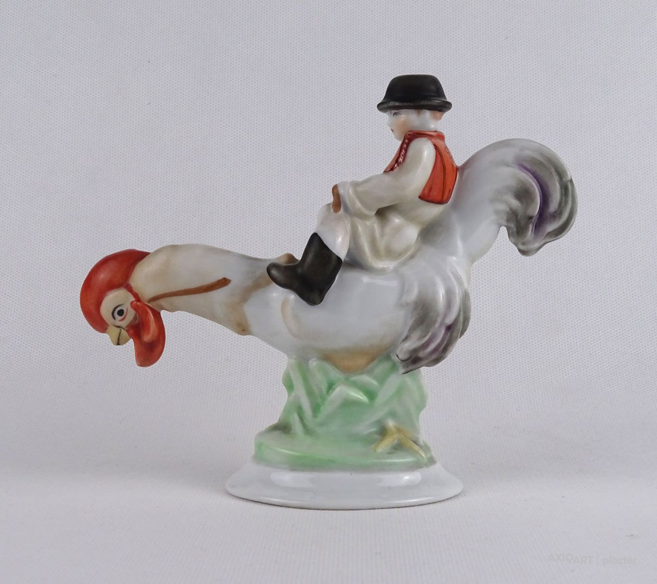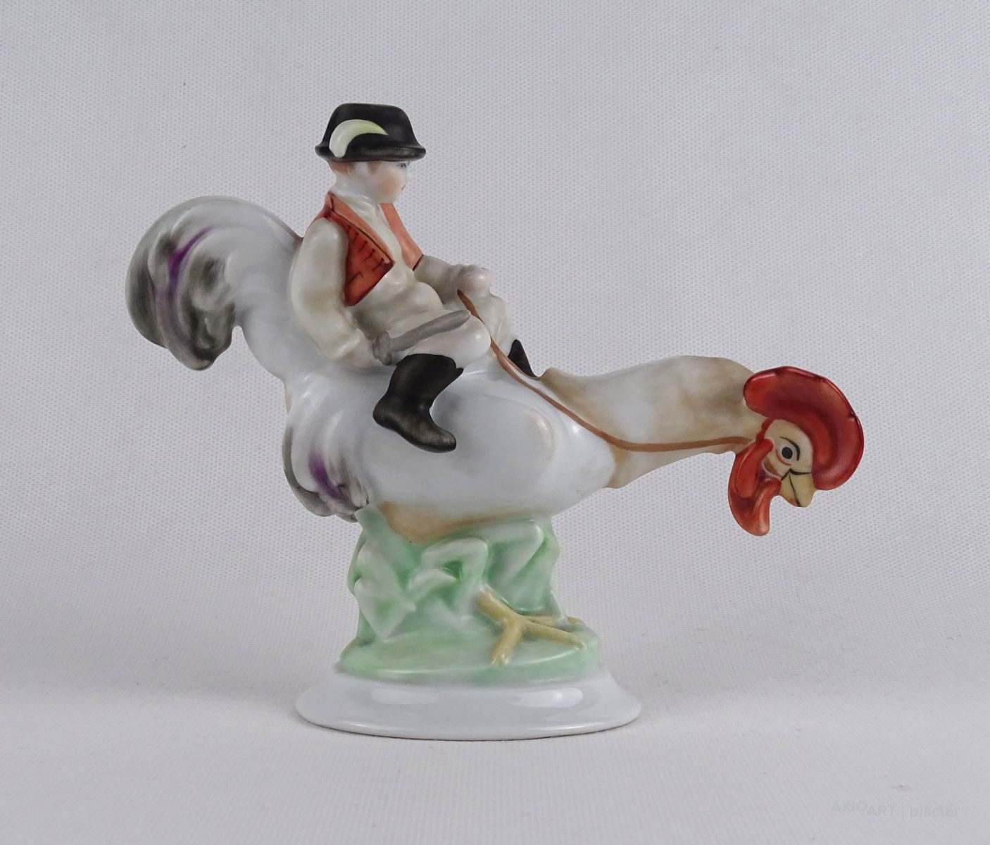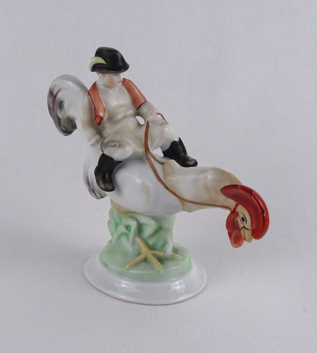 Hibátlan állapotú, régi, kézi festéssel díszített Kakas Marci porcelán figura.