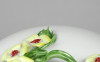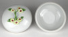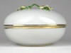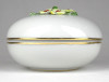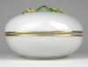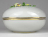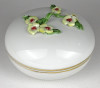[1S416/Z009] Régi szép állapotú Herendi porcelán bonbonier. Tetején plasztikus virág díszítéseken (1 szirom, 2 levél) kisebb sérülés található, lásd fotó. Alján kék Herendi jelzés: HEREND HUNGARY Mélynyomással: HEREND Formaszám: 6174 Magasság: 8.2 cm Szélesség: 12 cm Súly: 0.365 kg