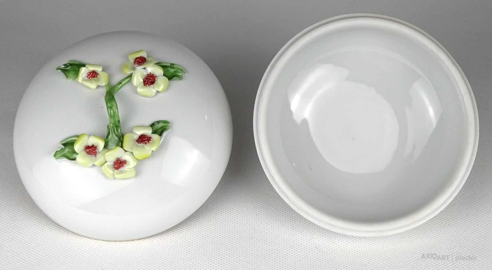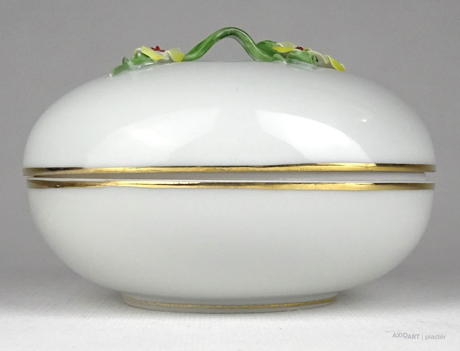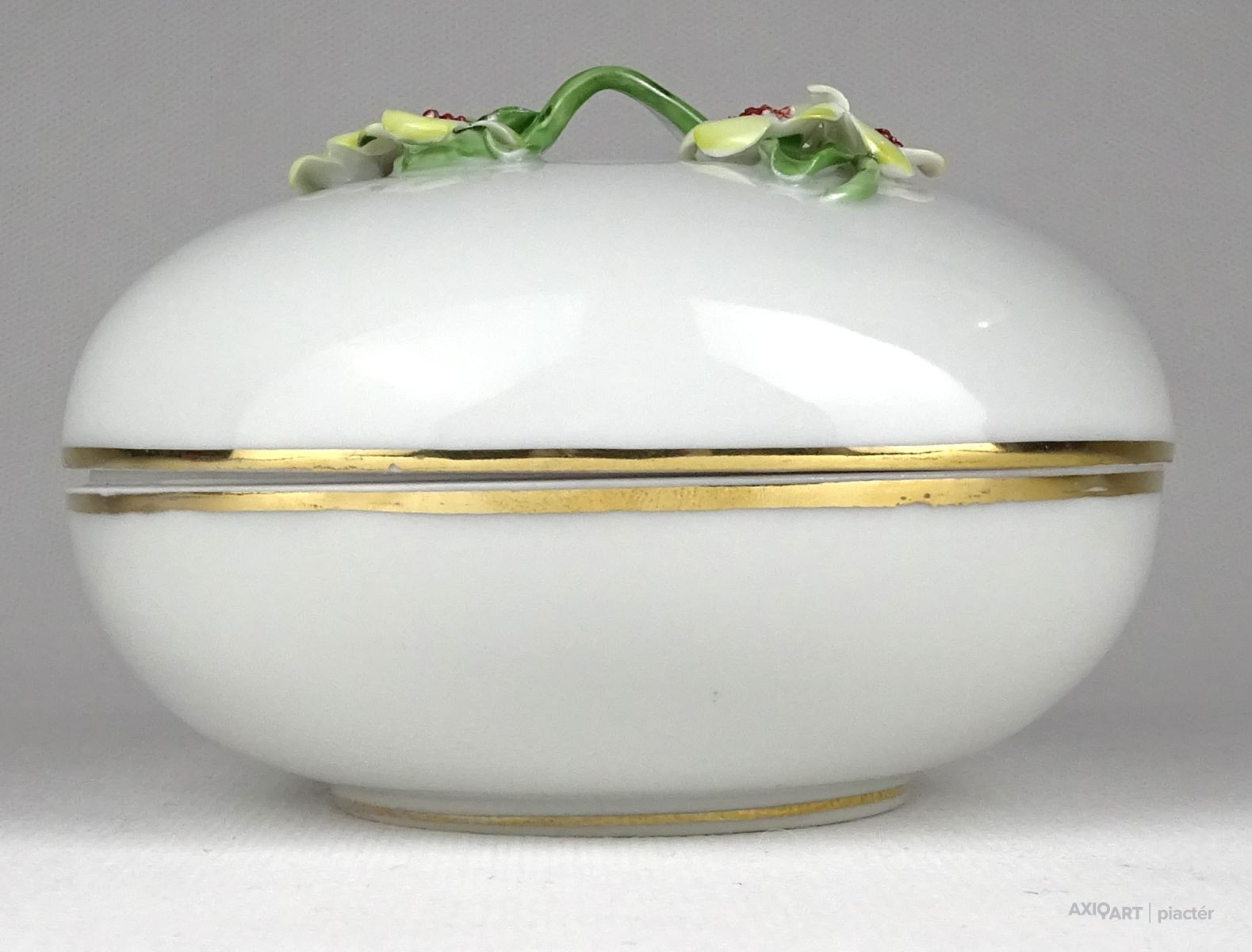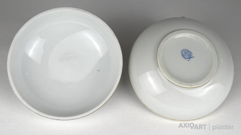 Régi szép állapotú Herendi porcelán bonbonier. Tetején plasztikus virág díszítéseken (1 szirom, 2 levél) kisebb sérülés található, lásd fotó.