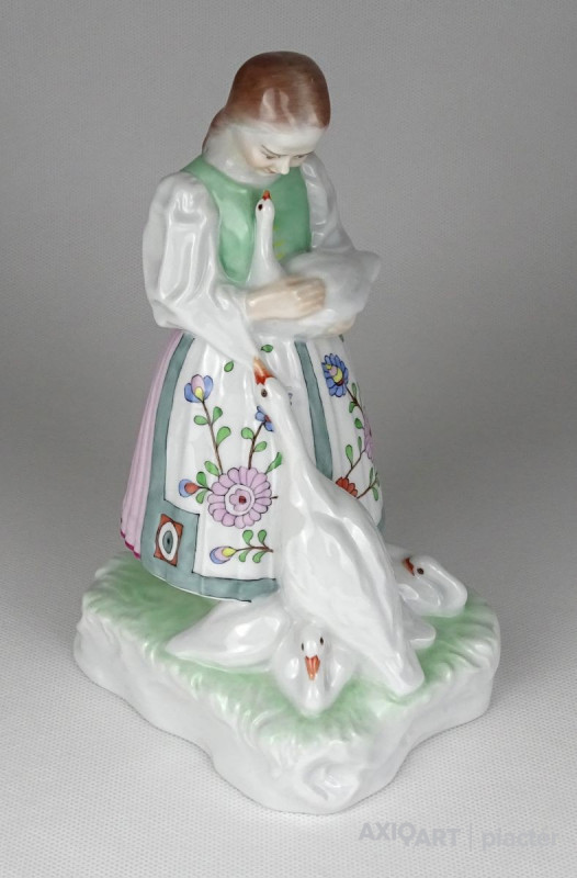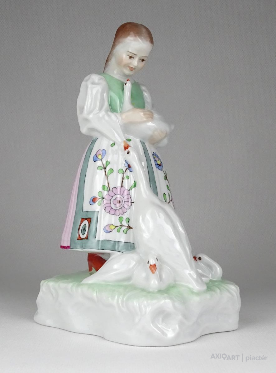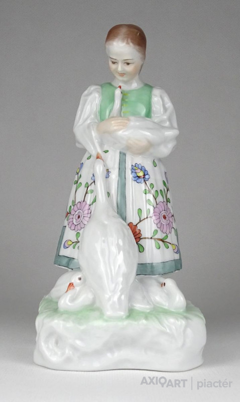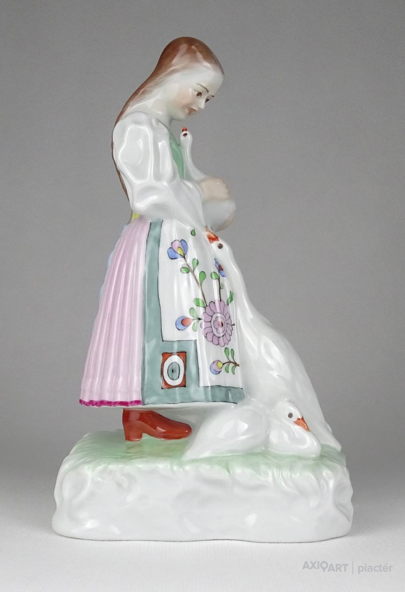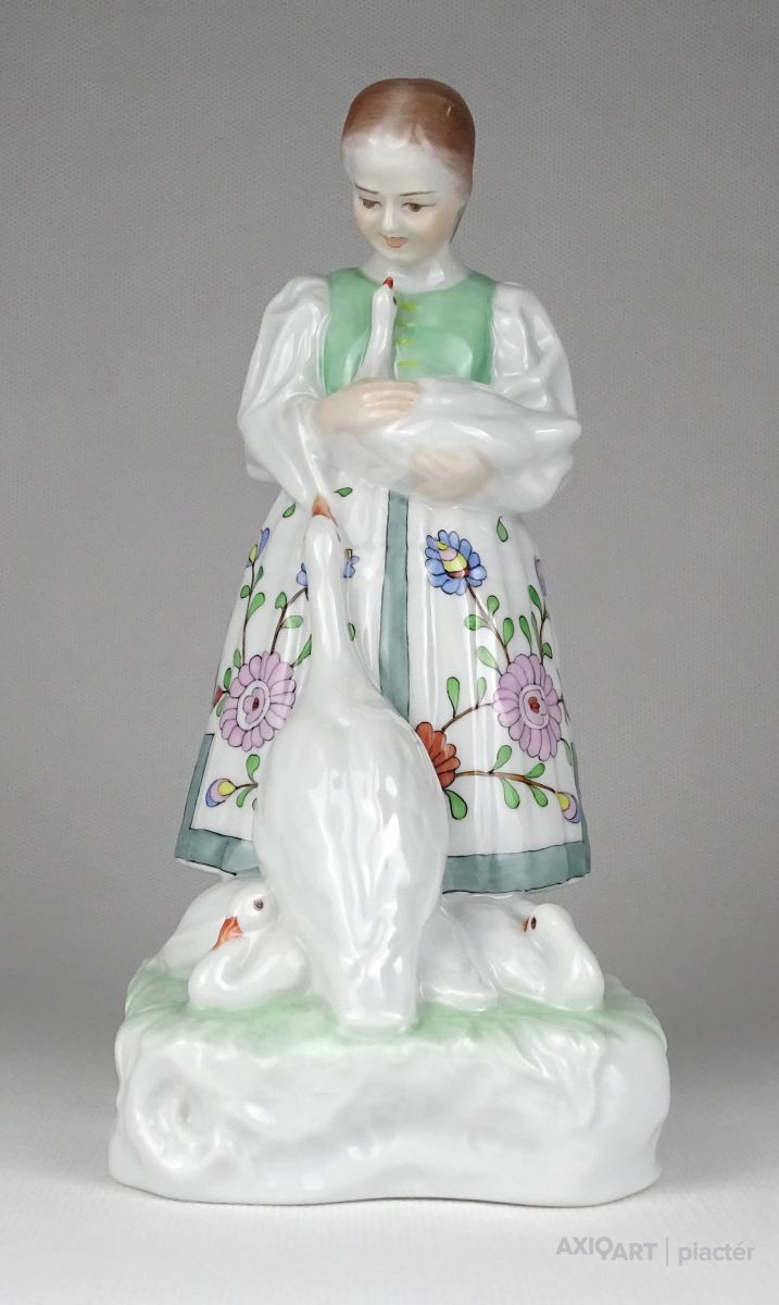 Régi hibátlan állapotú, kézi festéssel díszített, talapzaton álló Herendi porcelán kislány szobor libákkal.