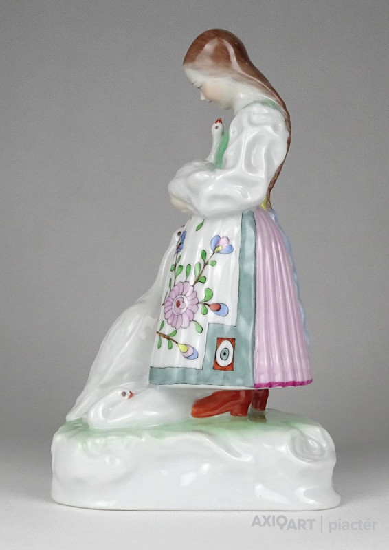 [1L859/BX-8] Régi hibátlan állapotú, kézi festéssel díszített, talapzaton álló Herendi porcelán kislány szobor libákkal. Alján kék Herendi márkajelzés: HEREND HUNGARY HANDPAINTED Alatta mélynyomással: HEREND Formaszám: 5555 Magasság: 19.5 cm Szélesség: 9.5 cm Hosszúság: 11.5 cm Súly: 0.565 kg