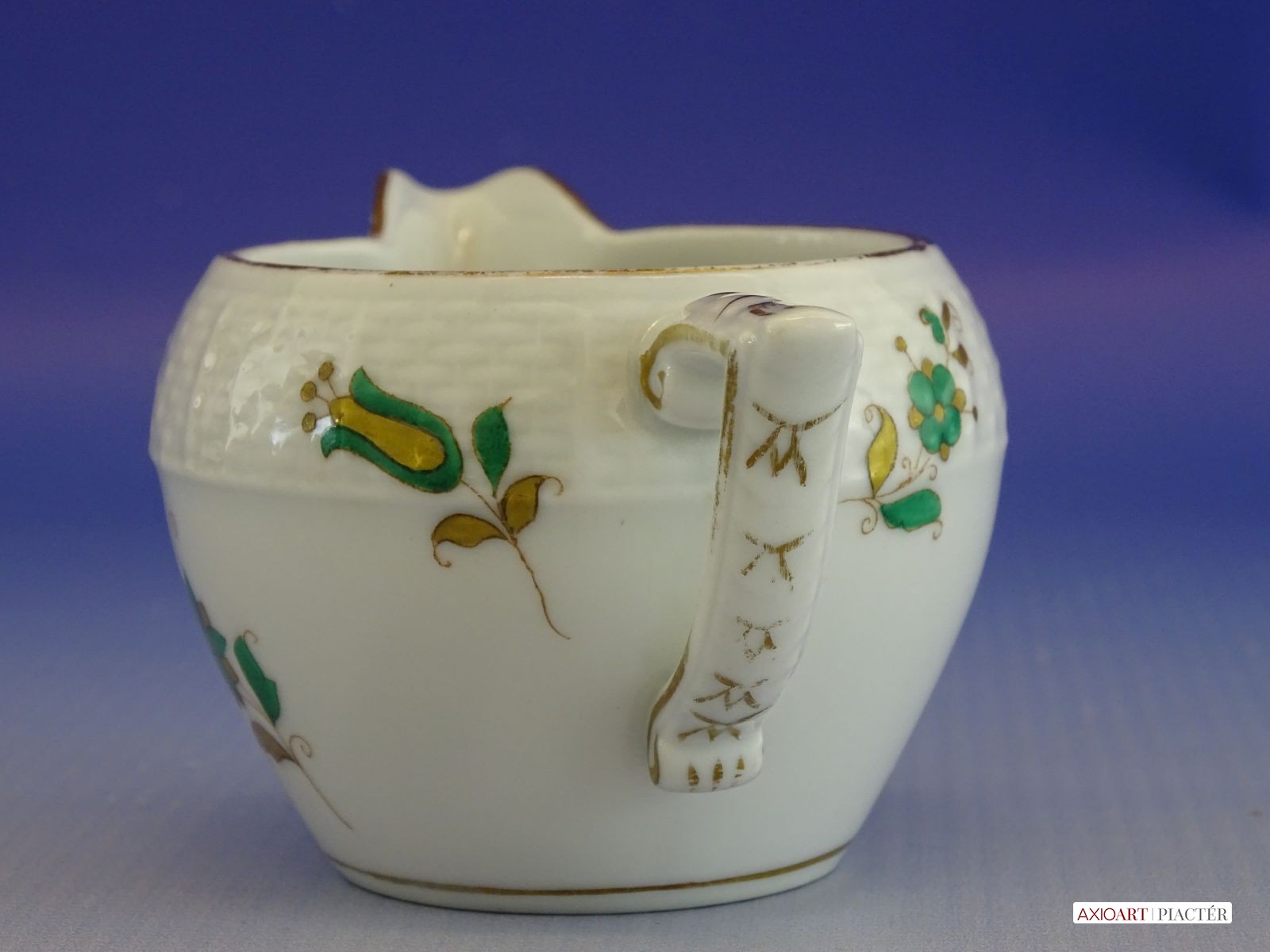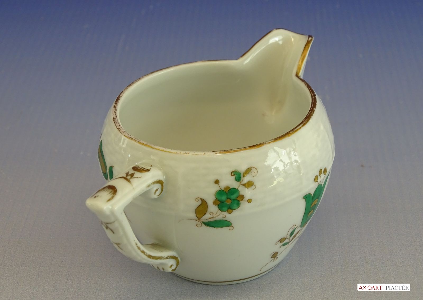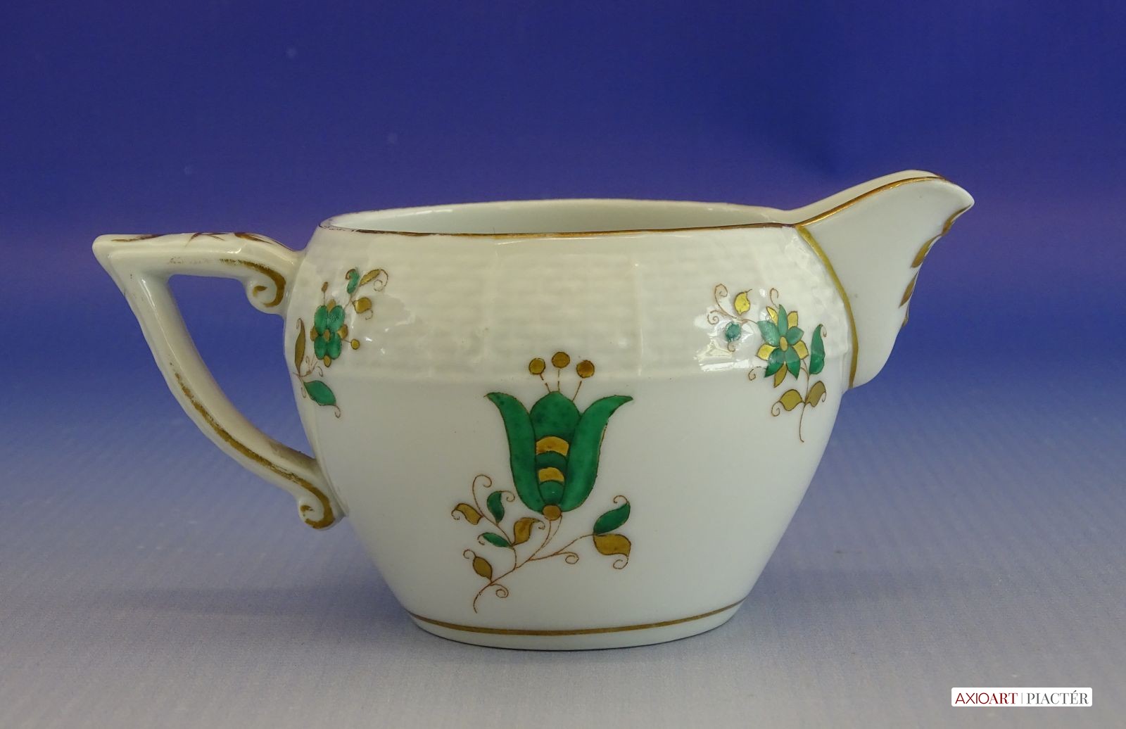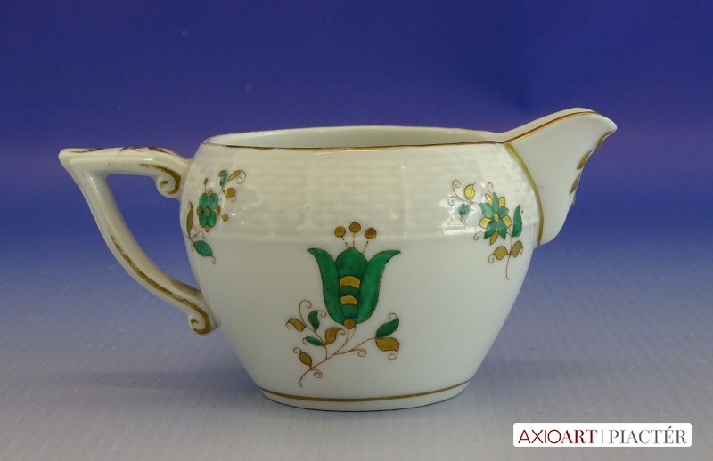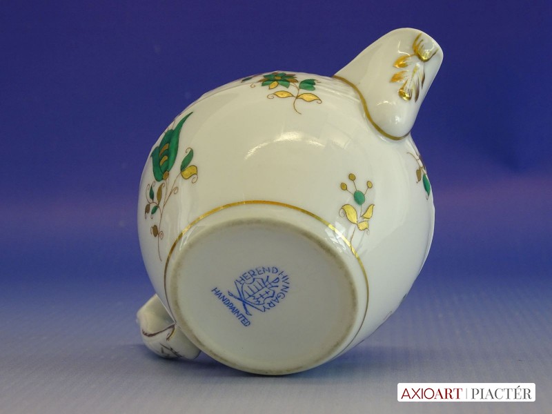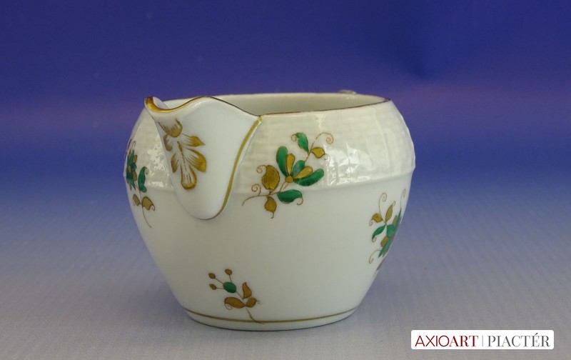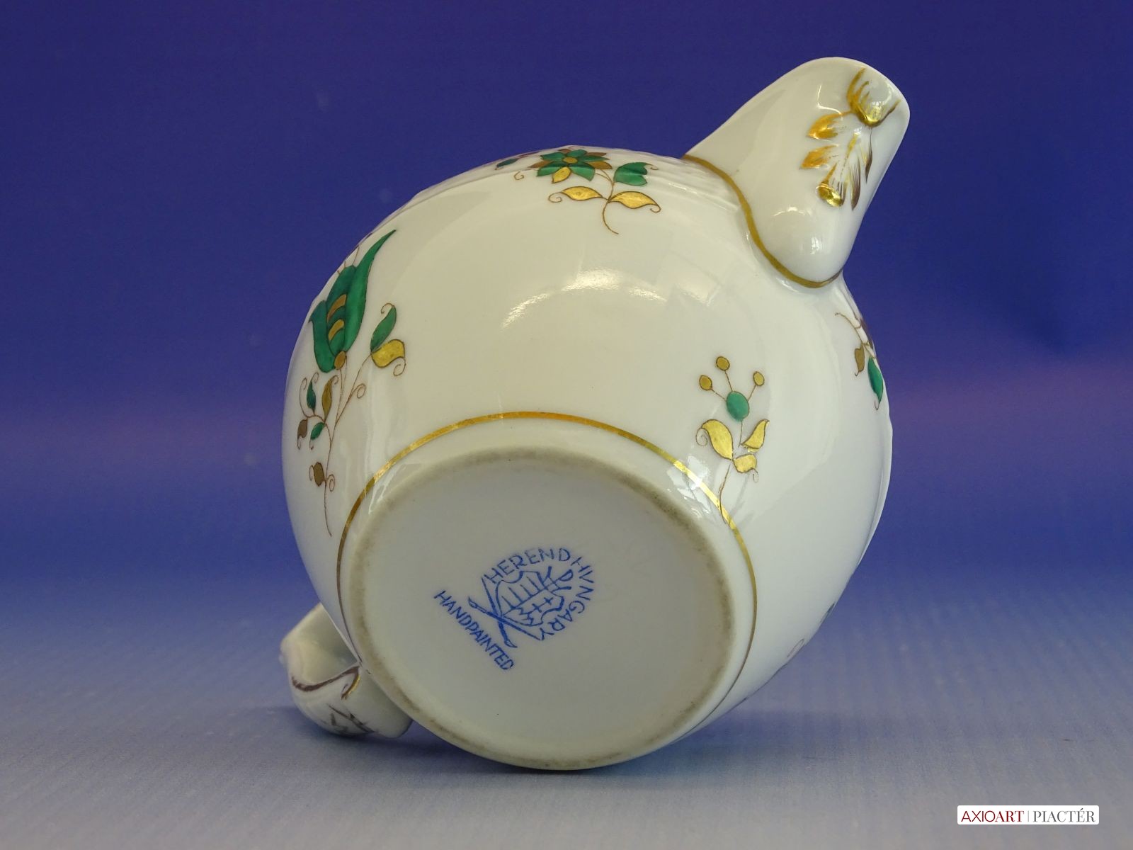 Régi, szép állapotú, Herendi porcelán tejszín kínáló. Oldalán apró arany és zöld színekkel virágmotívumok láthatóak.