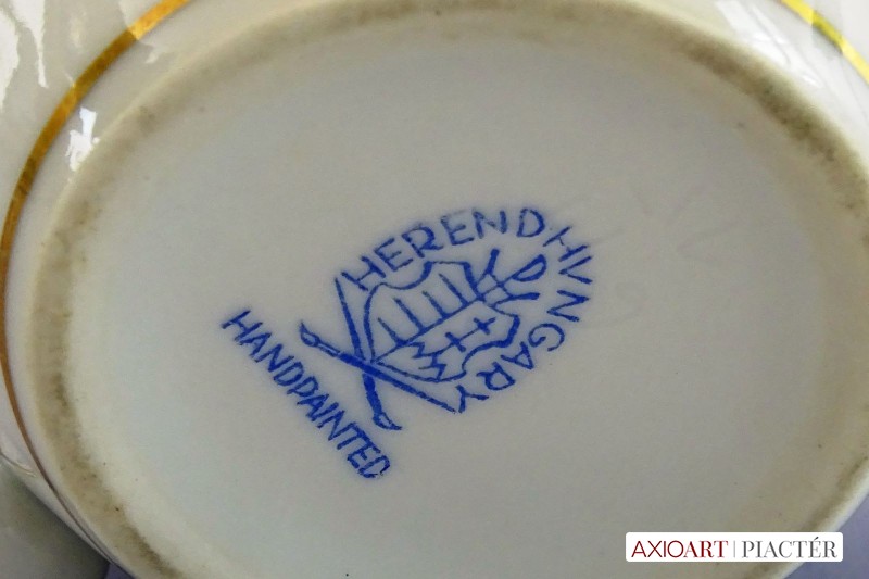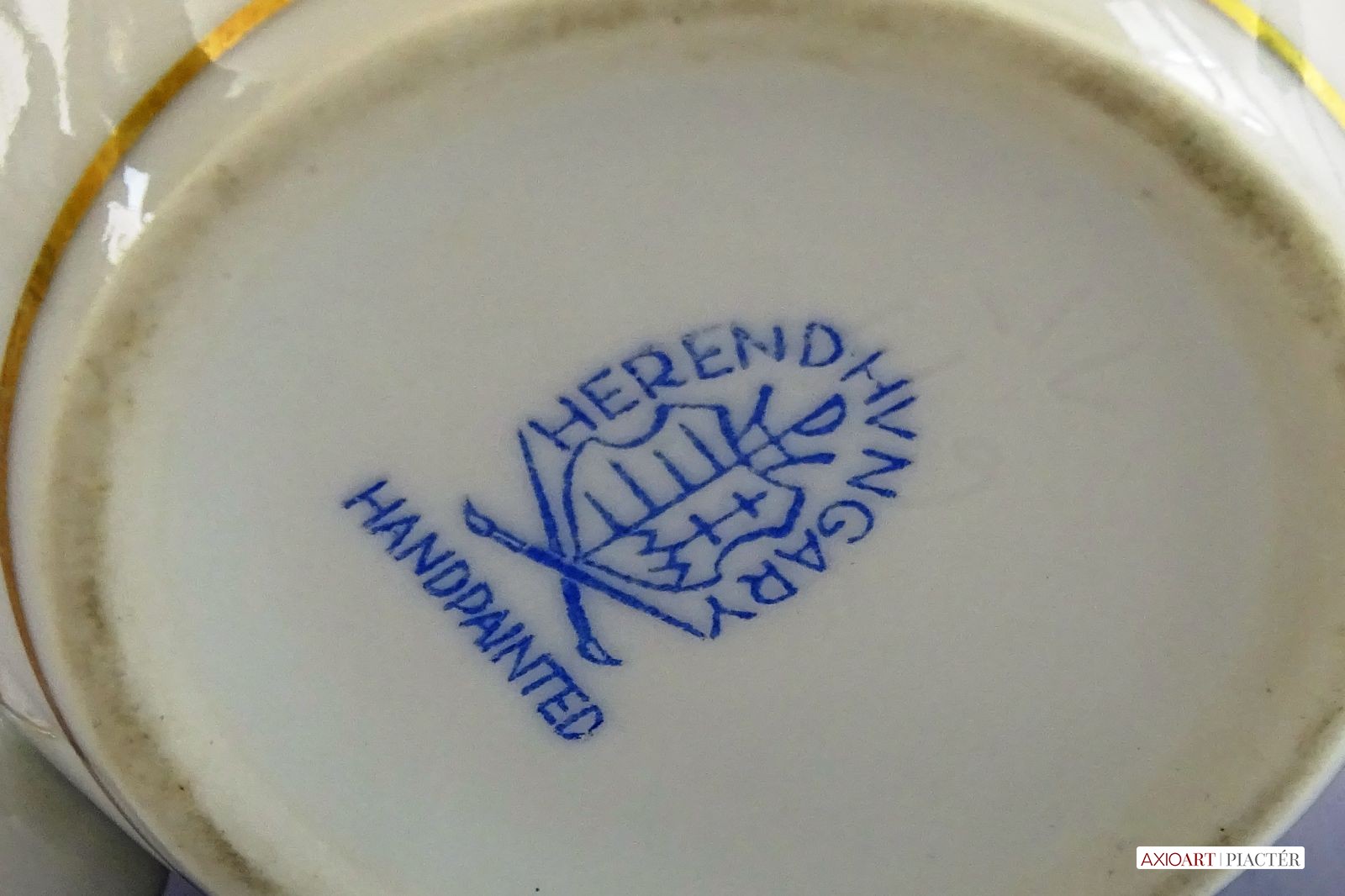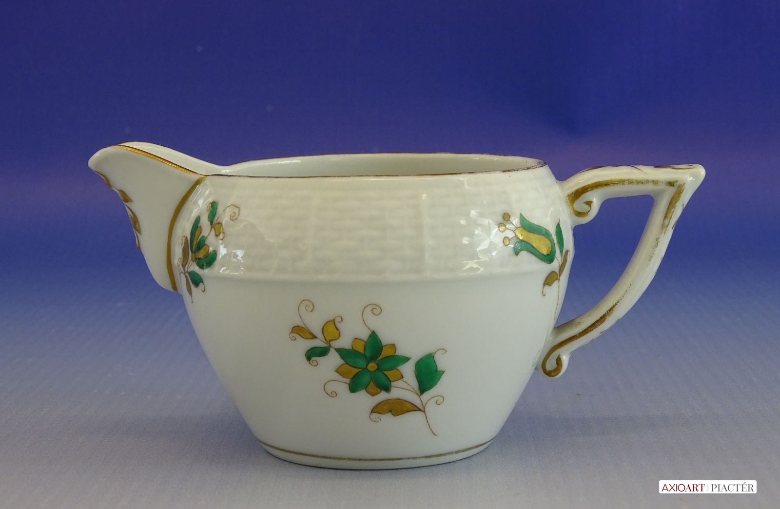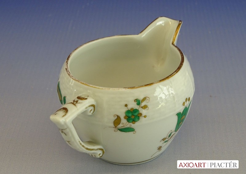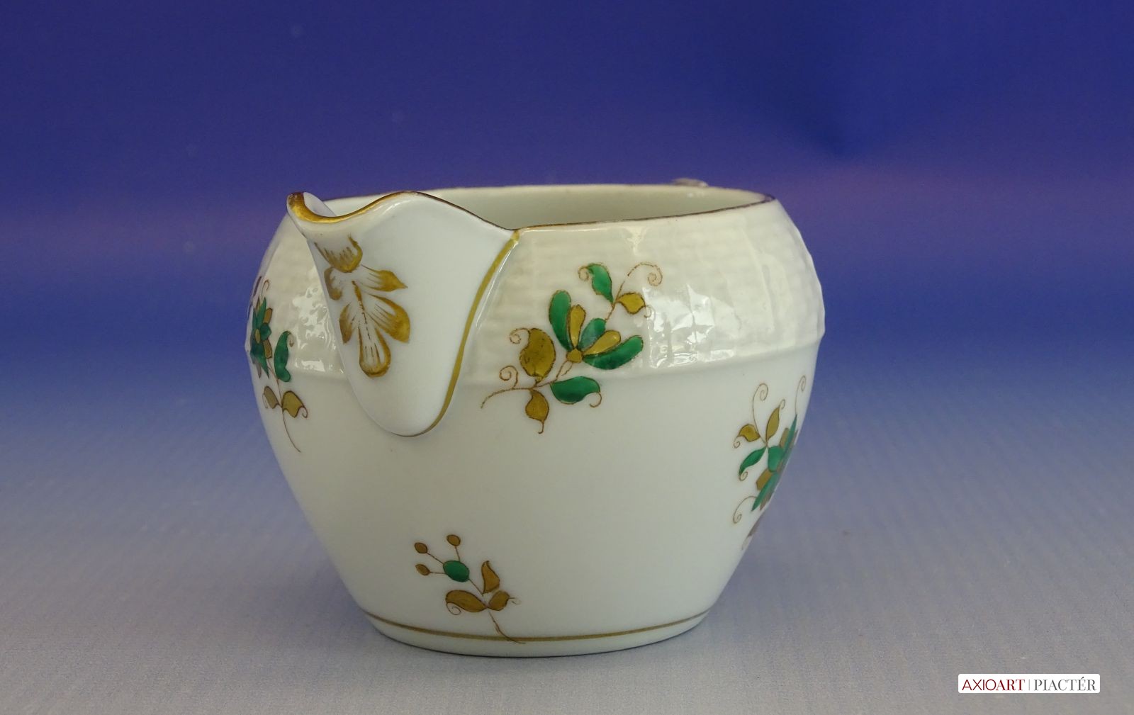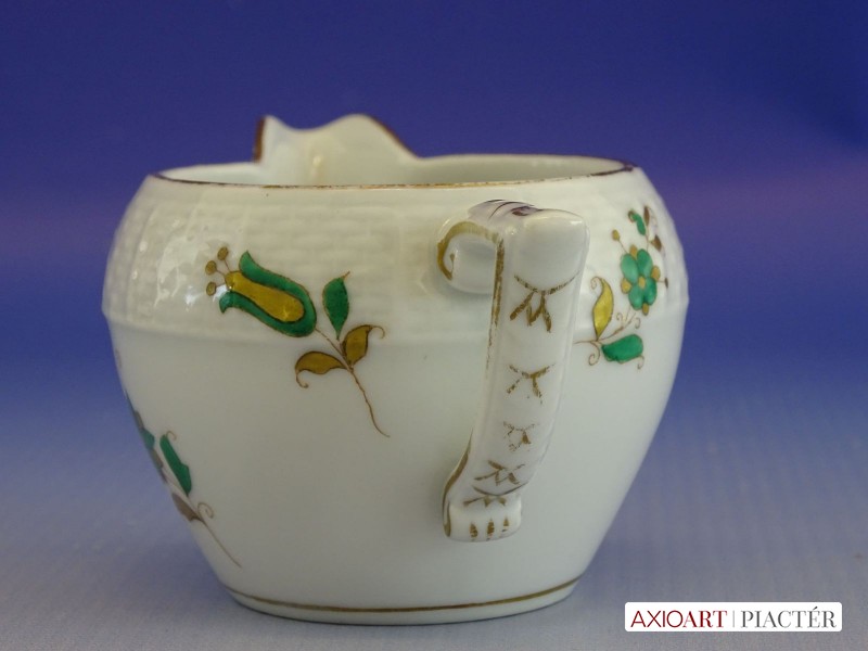 Régi, szép állapotú, Herendi porcelán tejszín kínáló. Oldalán apró arany és zöld színekkel virágmotívumok láthatóak.