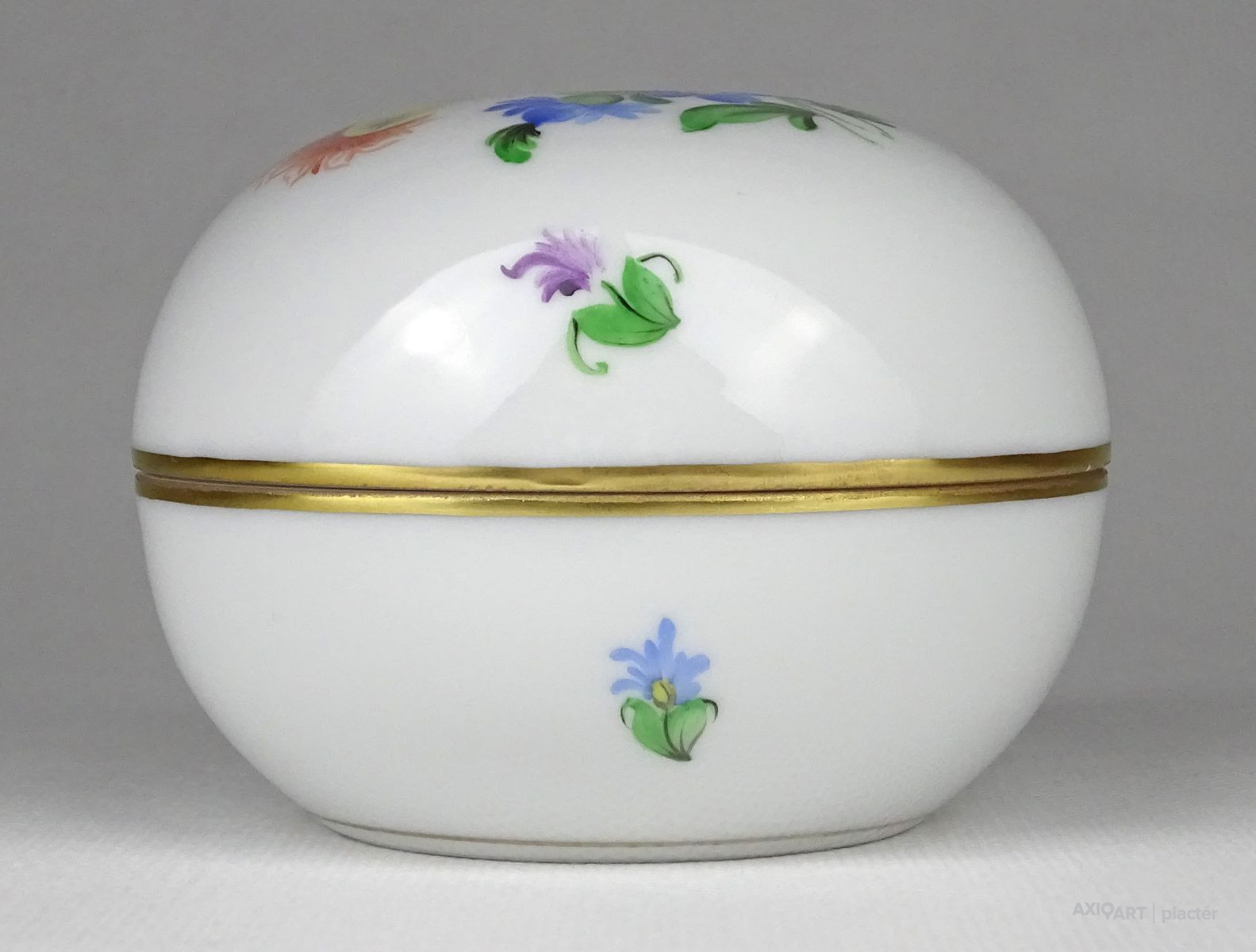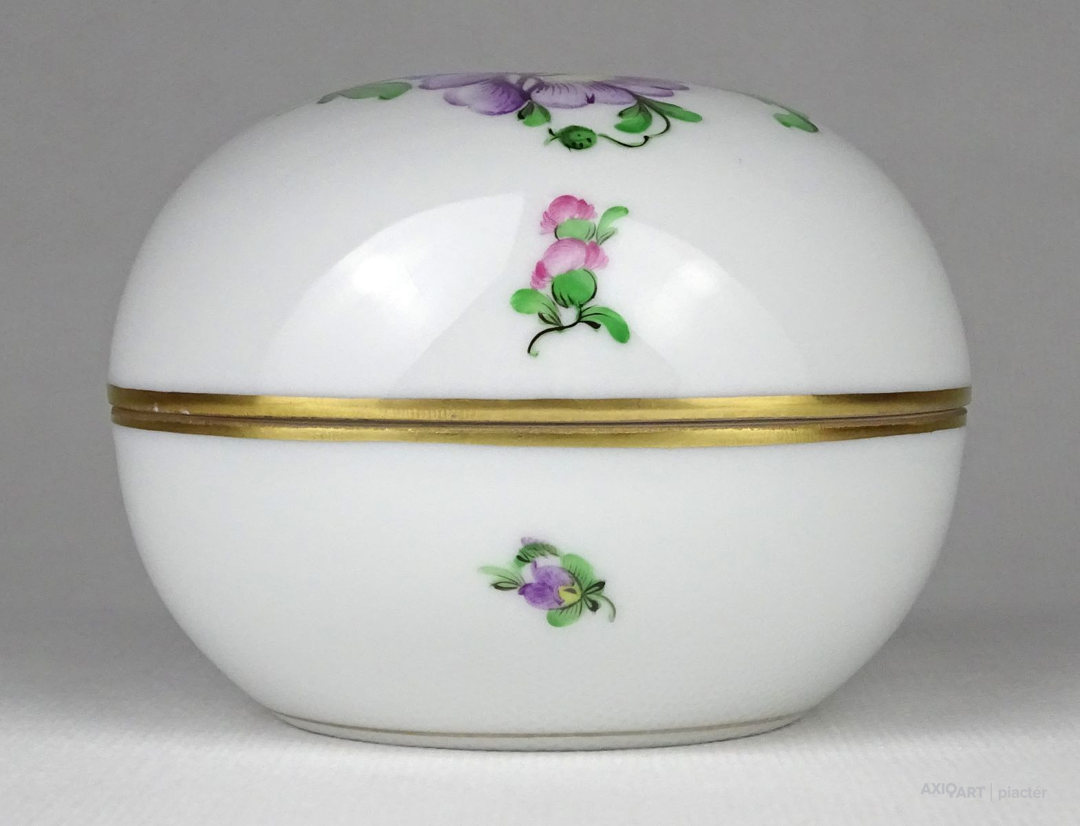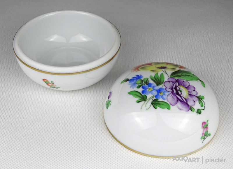 [1M854/VTR-12] Hibátlan állapotú kézi festésű virágmintával díszített porcelán gyűrűtartó ékszertartó bonbonier. Alján ecsetes kék Herendi márkajelzés: HEREND Mellette formaszám: 6032 Magasság: 7.3 cm Szélesség: 9.5 cm Súly: 0.25 kg