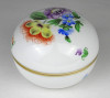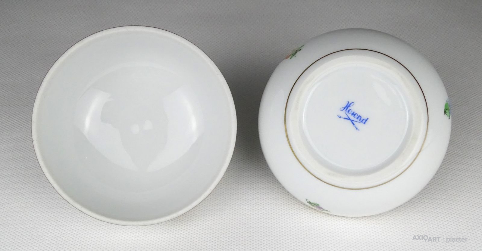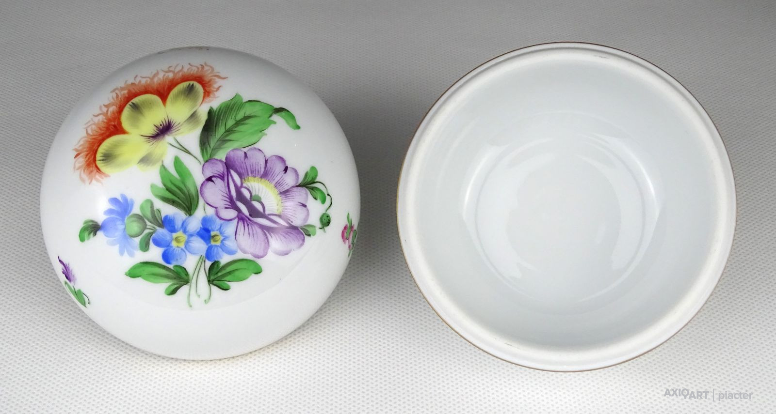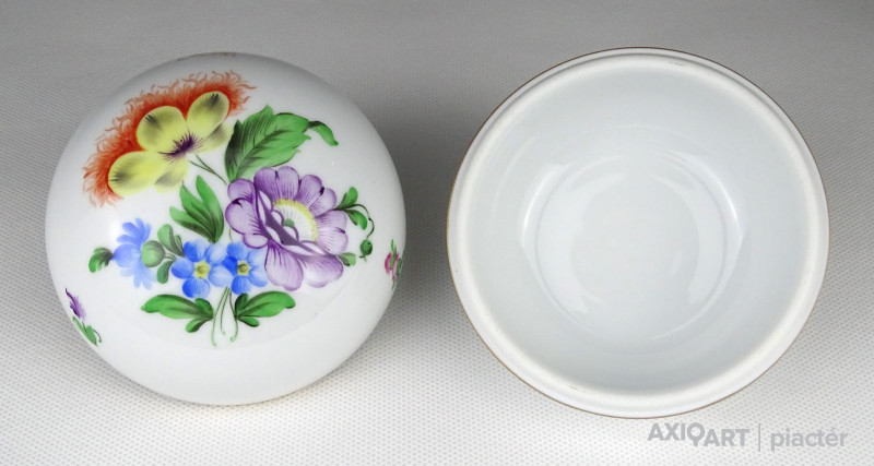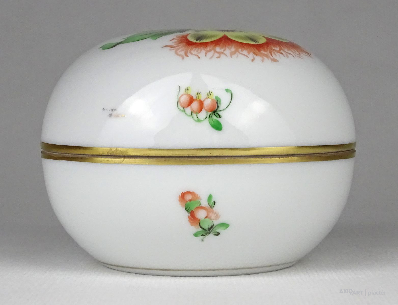 [1M854/VTR-12] Hibátlan állapotú kézi festésű virágmintával díszített porcelán gyűrűtartó ékszertartó bonbonier. Alján ecsetes kék Herendi márkajelzés: HEREND Mellette formaszám: 6032 Magasság: 7.3 cm Szélesség: 9.5 cm Súly: 0.25 kg