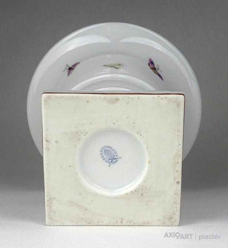 [1H511/BX-8] Régi, hibátlan állapotú, jelzett, oroszlán karmos Herendi porcelán virágkaspó, díszkaspó. A II. világháború alatt készült, az erre jellemző aranyozást helyettesítő barna csíkozással. Alján kék Herendi datált jelzés: HEREND HUNGARIA 1944 Mélynyomással: HEREND Formaszám: 6402 Magasság: 13 cm Szélesség: 14.5 cm Súly: 0.535 kg