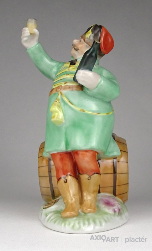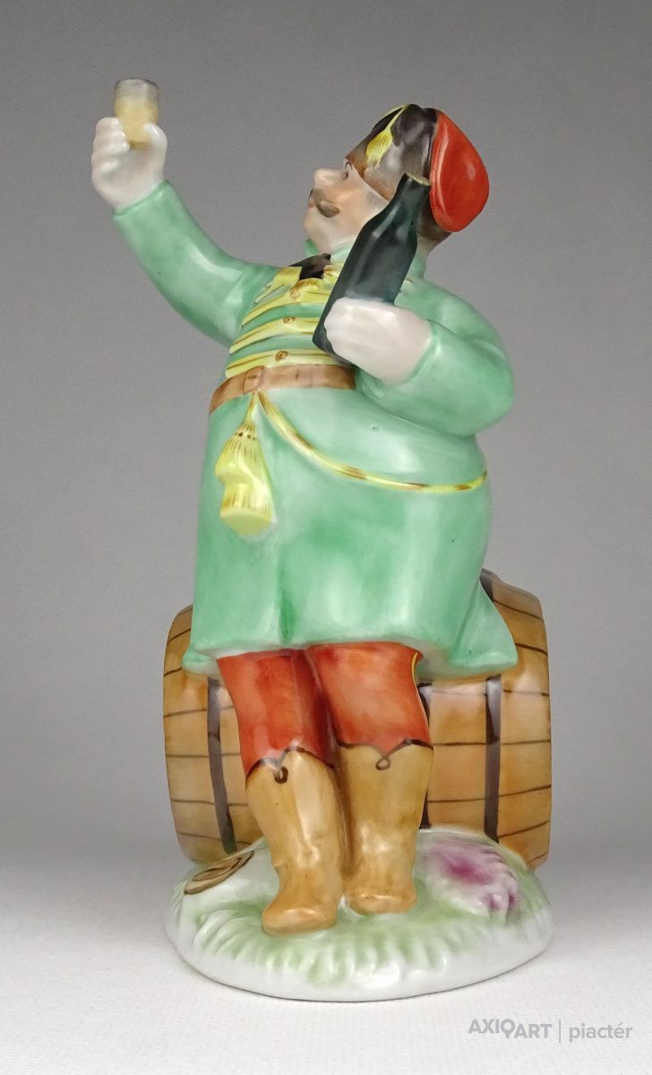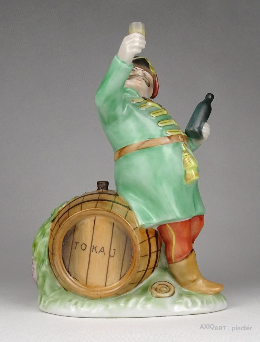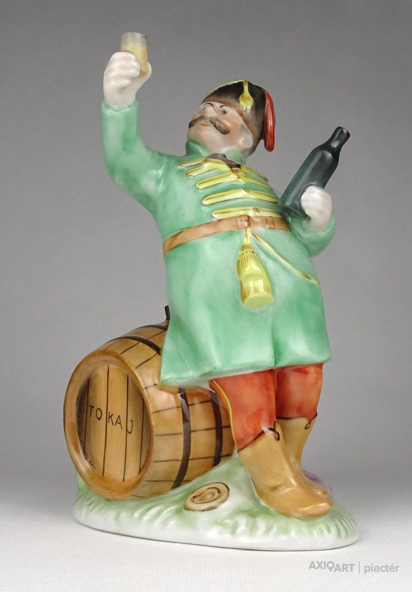 Hibátlan állapotú, Herendi porcelán figura. Magyar egyenruhás katona hordónak támaszkodva, a tokaji bort dicsérve.