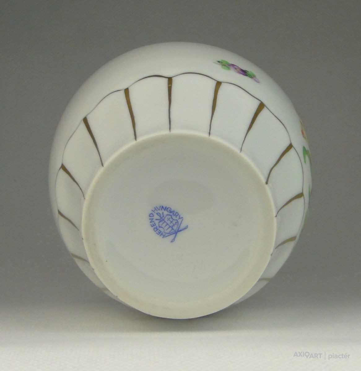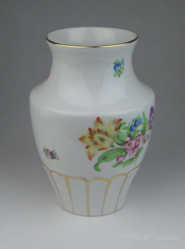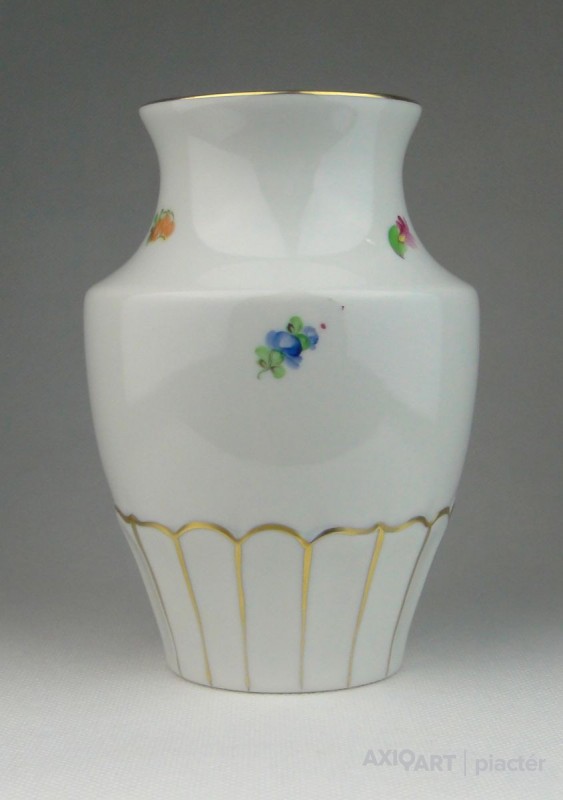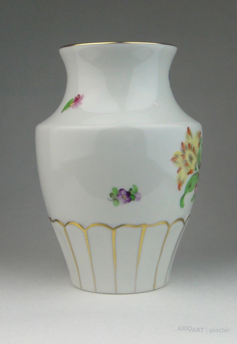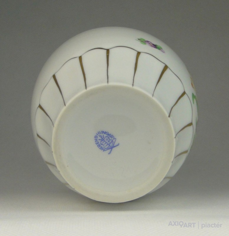[0R057/X325] Régi, hibátlan állapotú, jelzett, virágmintás, aranyozott, Herendi váza, díszváza. Alján kék Herendi márkajelzés: HEREND HUNGARY Mélynyomással: HEREND Formaszám: 7184 Magasság: 15.5 cm Szélesség: 11 cm Súly: 0.388 kg