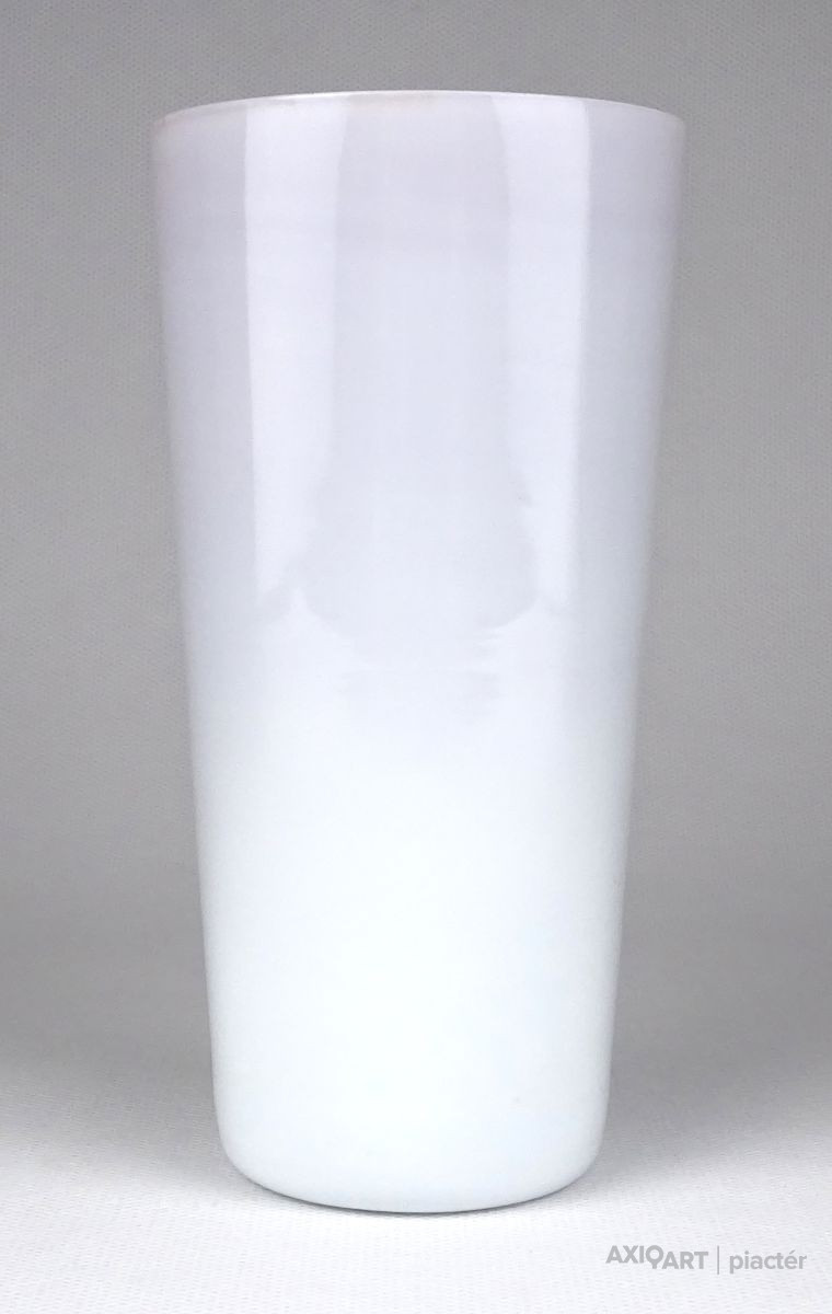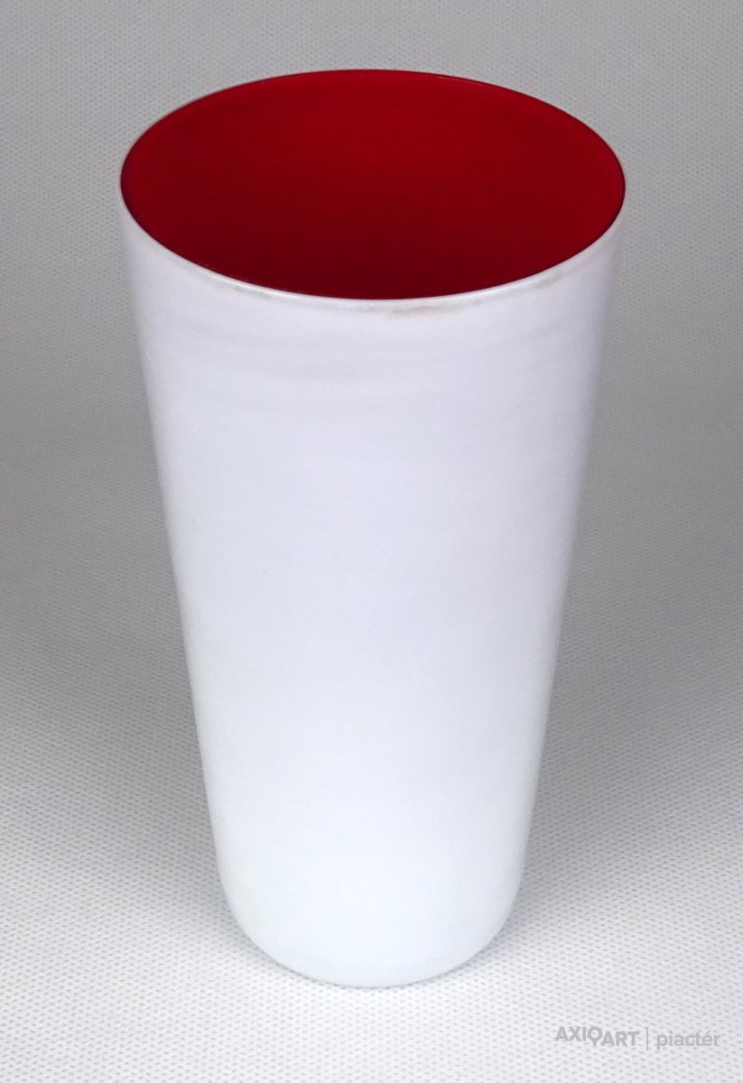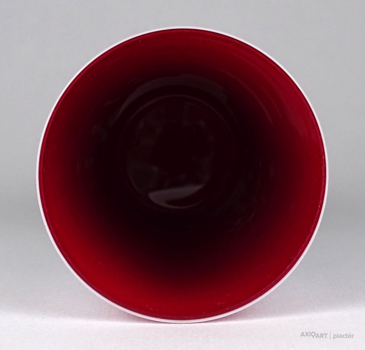 Hibátlan állapotú, piros és fehér színezett, rétegelt üveg. Pohár fazonú fújt üveg váza.