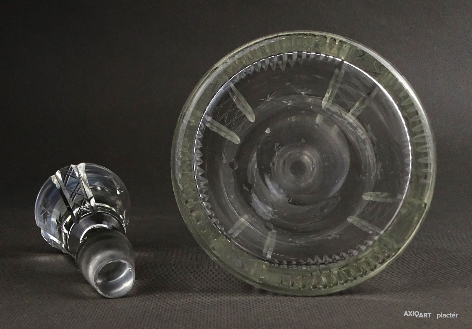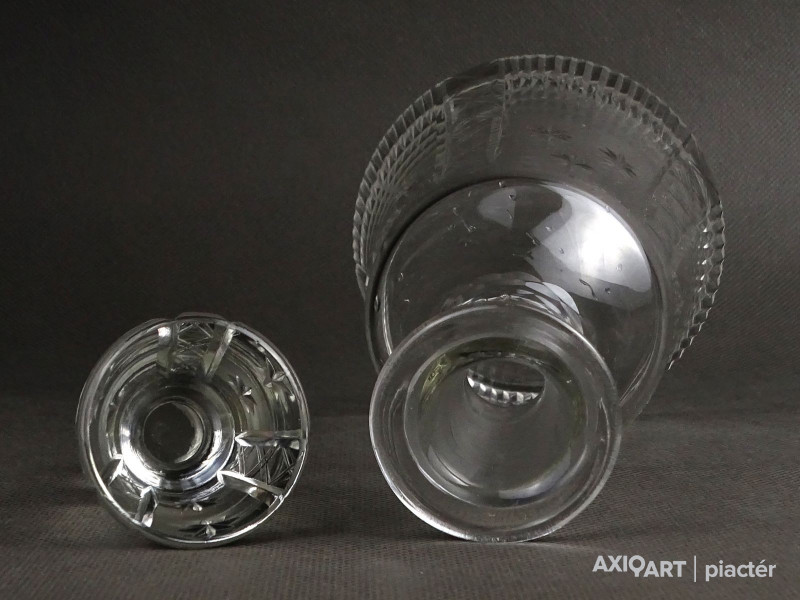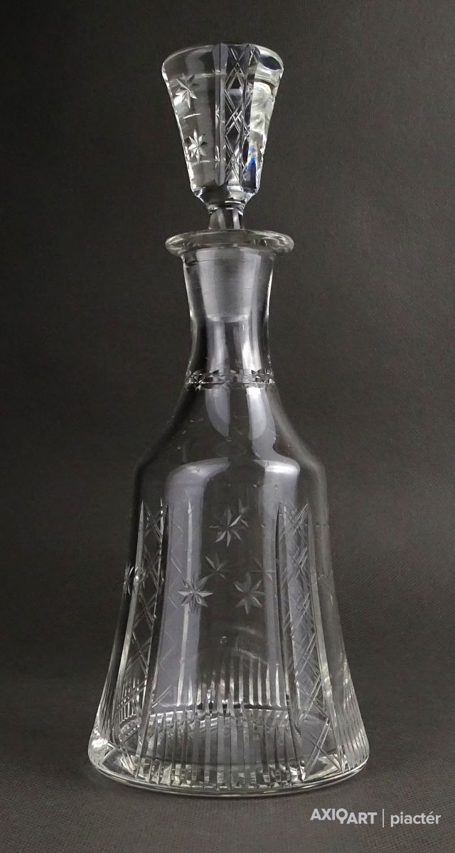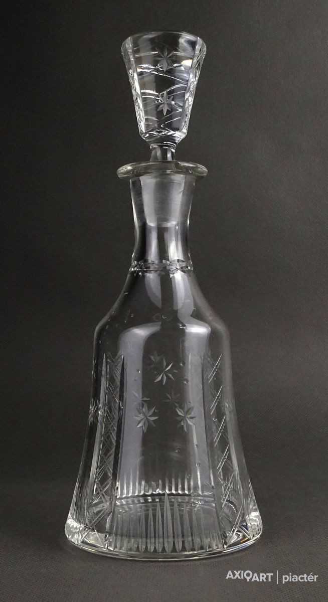 Hibátlan állapotú, csiszolatokkal díszített, kristály italkínáló üveg eredeti csiszolt dugójával.