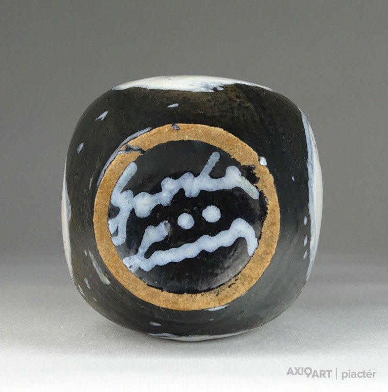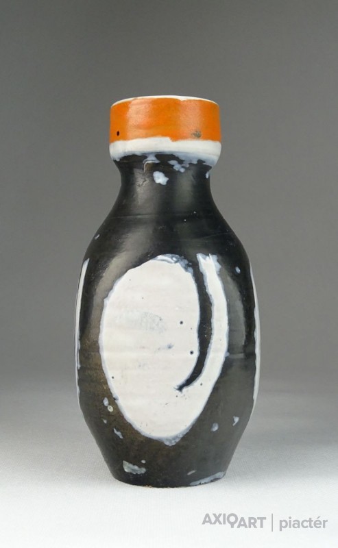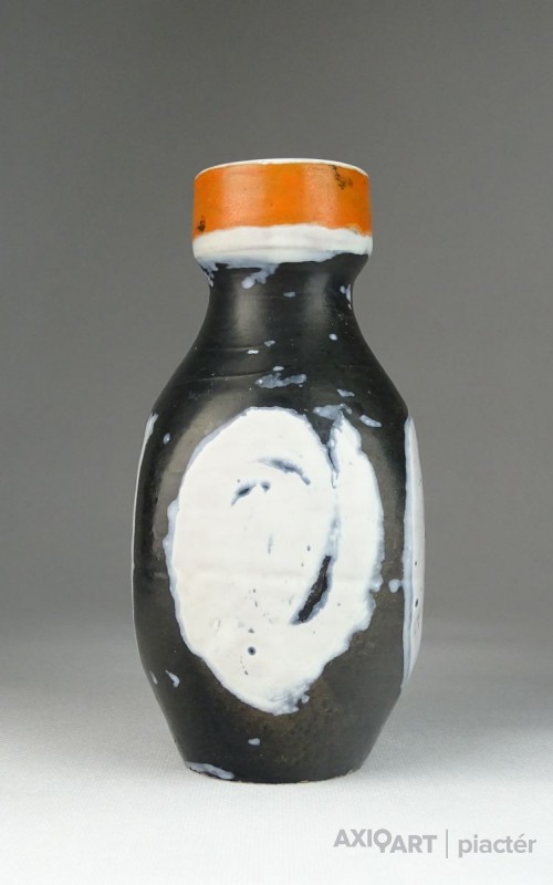 [0R415/X168] Régi, jelzett, hibátlan állapotú Gorka Lívia díszváza fekete, fehér és narancs mázzal. Alján jelzés: GORKA LÍVIA Magasság: 19 cm Szélesség: 8.5 cm Súly: 0.444 kg Gorka Lívia keramikus Születési hely: Nógrádverőce Születési dátum: 1925 Honlap: Kiállítások az adatbázisban:  Gorka Lívia keramikusművész életműkiállítása Mesterei: Gorka Géza. 1947-ben tett fazekas-mestervizsgát. Mestere édesapja, Gorka Géza volt. 1962: Nemzetközi Kerámia Biennálé, Prága, aranyérem; 1964: Munkácsy-díj; 1975: érdemes művész; Verőce díszpolgára. 1959-ig a verőcei Gorka-műhelyben dolgozott, azóta saját műtermében alkot. Kézműves módszerrel dolgozik, saját készítésű mázakat alkalmaz. Magas tüzű, egyéni készítésű anyagokkal dolgozik, az agyagot fémmel ötvözi. Erőteljes plasztikai hatású munkáinak színvilága visszafogott. Egyéni kiállítások 1964 • Csók Galéria, Budapest • Festőterem, Sopron • Janus Pannonius Múzeum, Pécs • Savaria Múzeum, Szombathely 1968 • Genf • Képcsarnok, Szeged 1977 • Műcsarnok, Budapest 1983 • Gülbaba köz 25. 1986 • Blaskovich Múzeum, Tápiószele 1994 • Három nemzedék, Gorka Múzeum, Nógrádverőce. Válogatott csoportos kiállítások 1955 • Fiatal iparművészek kiállítása, Ernst Múzeum, Budapest 1958 • Nemzetközi kerámia kiállítás, Gmunden 1959 • 4. Országos Iparművészeti kiállítás, Műcsarnok, Budapest 1962 • Ungerskt Konsthantverk, Stockholm 1962, 1964 • Nemzetközi Kerámia Biennálé, Prága 1963 • Modern magyar kerámia, Royal Festival Hall, London 1964 • Kortárs magyar művészek, Neue Galerie der Stadt, Linz • Nemzetközi kerámia kiállítás,Washington 1965 • 5. Országos Iparművészeti Kiállítás, Műcsarnok, Budapest 1968 • Mai magyar kerámia, Vár, Siklós 1968-1972, 1976, 1980-1988 • VI-X. Országos Kerámia Biennálé, Pécs 1970, 1975 • Jubileumi Iparművészeti kiállítás, Műcsarnok, Budapest • Magyar kerámia és textil,Moszkva • Nemzetközi kerámia kiállítás, Faenza 1995 • XX. századi magyar keramikusok. Válogatás az Iparművészeti Múzeum, Budapest gyűjteményéből, Iparművészeti Múzeum, Budapest. Művek közgyűjteményekben Kecskeméti Képtár Victoria and Albert Museum, London. Köztéri művei Zodiákus jegyek (samottos agyag, 1966, Gödöllő, GATE) Sejt nagyító alatt (kőagyag, 1979, Tatabánya, Kórház) Kerámiakompozíció (1983, Tatabánya, Megyei Kórház). Irodalom Vallomás, Budapest, 1979 ~-FOCHT G.: Három nemzedék. A Gorka Múzeum Verőcén, Budapest, 1994 Fiatal iparművészek, Szabad Művészet, 1955/9. FRANK J.: ~, Élet és Irodalom, 1964/5. MAJOR M.: ~ kiállítása elé, Magyar Építőművészet, 1964/6. kiállításán, Művészet, 1964/10. HETTEŠ, K.-RODA, P.: Moderne Keramik, Prága, 1965 SZELESI Z.: ~ kiállítása Szegeden, Művészet, 1968/12.  ~val, Műgyűjtő, 1970/2. N. DVORSZKY H.: ~, Művészet, 1973/3. kiállítása, Ipari Művészet, 1973/3. VADAS J.: Kiállítások, Élet és Irodalom, 1973. március 27. Forma Hungarica, Budapest, 1974 VADAS J.: Küklopsz edényei, Élet és Irodalom, 1987. október 9. Ős pottery, New Hungarian Quarterly, 1988/3. Három nemzedék. Gorka Géza, ~, Focht Géza, Magyar Iparművészet, 1994/5. Laczkó Ibolya Forrás: artportal.hu