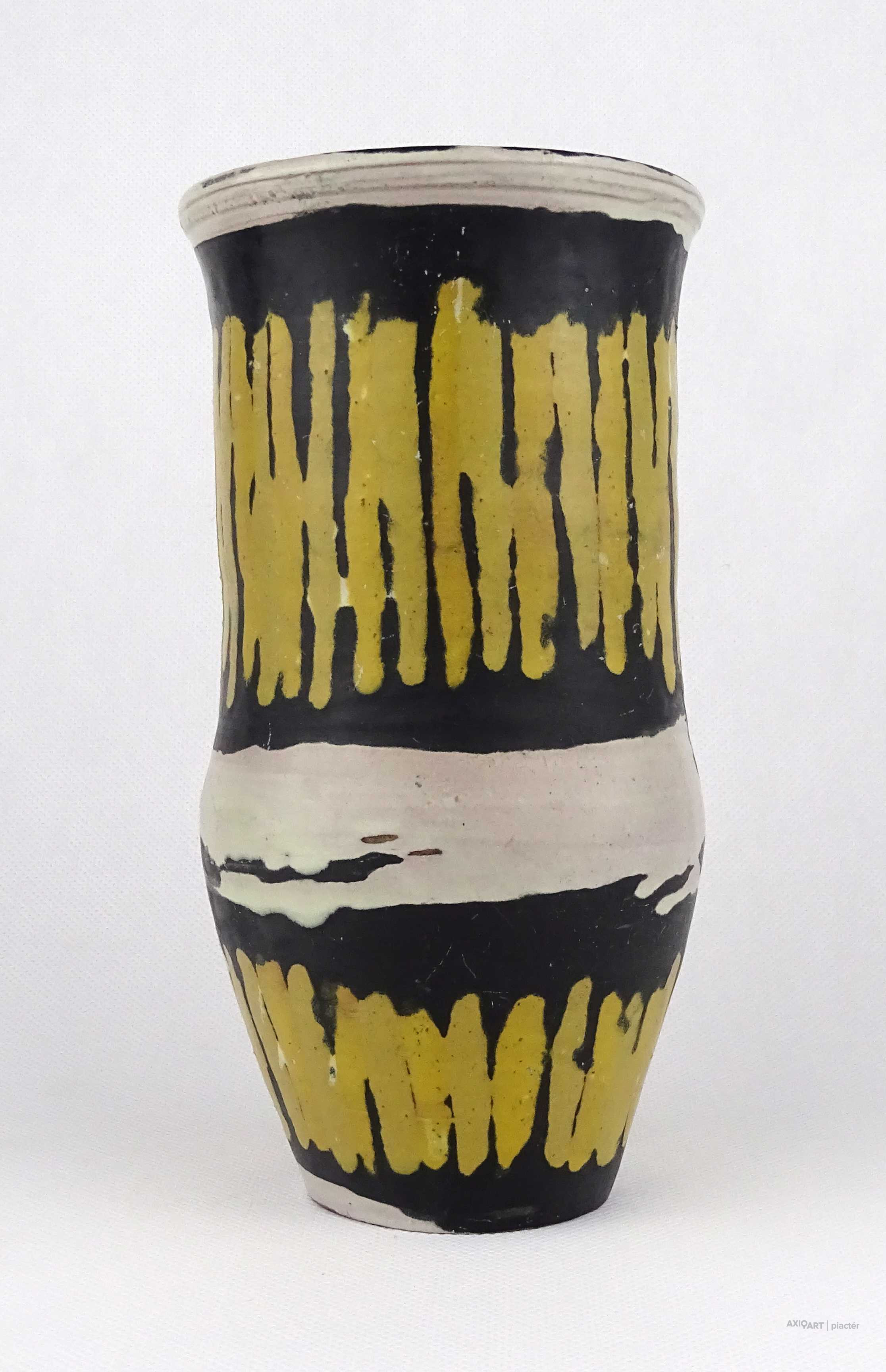[1X661/Z028] Régi, jelzett, hibátlan állapotú, fekete sárga mázas Gorka Lívia kerámia díszváza. Alján jelzés: GORKA LÍVIA Magasság: 20.4 cm Szélesség: 11 cm Súly: 0.635 kg Gorka Lívia keramikus Születési hely: Nógrádverőce Születési dátum: 1925 Honlap: Kiállítások az adatbázisban:  Gorka Lívia keramikusművész életműkiállítása Mesterei: Gorka Géza. 1947-ben tett fazekas-mestervizsgát. Mestere édesapja, Gorka Géza volt. 1962: Nemzetközi Kerámia Biennálé, Prága, aranyérem; 1964: Munkácsy-díj; 1975: érdemes művész; Verőce díszpolgára. 1959-ig a verőcei Gorka-műhelyben dolgozott, azóta saját műtermében alkot. Kézműves módszerrel dolgozik, saját készítésű mázakat alkalmaz. Magas tüzű, egyéni készítésű anyagokkal dolgozik, az agyagot fémmel ötvözi. Erőteljes plasztikai hatású munkáinak színvilága visszafogott. Egyéni kiállítások 1964 • Csók Galéria, Budapest • Festőterem, Sopron • Janus Pannonius Múzeum, Pécs • Savaria Múzeum, Szombathely 1968 • Genf • Képcsarnok, Szeged 1977 • Műcsarnok, Budapest 1983 • Gülbaba köz 25. 1986 • Blaskovich Múzeum, Tápiószele 1994 • Három nemzedék, Gorka Múzeum, Nógrádverőce. Válogatott csoportos kiállítások 1955 • Fiatal iparművészek kiállítása, Ernst Múzeum, Budapest 1958 • Nemzetközi kerámia kiállítás, Gmunden 1959 • 4. Országos Iparművészeti kiállítás, Műcsarnok, Budapest 1962 • Ungerskt Konsthantverk, Stockholm 1962, 1964 • Nemzetközi Kerámia Biennálé, Prága 1963 • Modern magyar kerámia, Royal Festival Hall, London 1964 • Kortárs magyar művészek, Neue Galerie der Stadt, Linz • Nemzetközi kerámia kiállítás,Washington 1965 • 5. Országos Iparművészeti Kiállítás, Műcsarnok, Budapest 1968 • Mai magyar kerámia, Vár, Siklós 1968-1972, 1976, 1980-1988 • VI-X. Országos Kerámia Biennálé, Pécs 1970, 1975 • Jubileumi Iparművészeti kiállítás, Műcsarnok, Budapest • Magyar kerámia és textil,Moszkva • Nemzetközi kerámia kiállítás, Faenza 1995 • XX. századi magyar keramikusok. Válogatás az Iparművészeti Múzeum, Budapest gyűjteményéből, Iparművészeti Múzeum, Budapest. Művek közgyűjteményekben Kecskeméti Képtár Victoria and Albert Museum, London. Köztéri művei Zodiákus jegyek (samottos agyag, 1966, Gödöllő, GATE) Sejt nagyító alatt (kőagyag, 1979, Tatabánya, Kórház) Kerámiakompozíció (1983, Tatabánya, Megyei Kórház). Irodalom Vallomás, Budapest, 1979 ~-FOCHT G.: Három nemzedék. A Gorka Múzeum Verőcén, Budapest, 1994 Fiatal iparművészek, Szabad Művészet, 1955/9. FRANK J.: ~, Élet és Irodalom, 1964/5. MAJOR M.: ~ kiállítása elé, Magyar Építőművészet, 1964/6. kiállításán, Művészet, 1964/10. HETTEŠ, K.-RODA, P.: Moderne Keramik, Prága, 1965 SZELESI Z.: ~ kiállítása Szegeden, Művészet, 1968/12.  ~val, Műgyűjtő, 1970/2. N. DVORSZKY H.: ~, Művészet, 1973/3. kiállítása, Ipari Művészet, 1973/3. VADAS J.: Kiállítások, Élet és Irodalom, 1973. március 27. Forma Hungarica, Budapest, 1974 VADAS J.: Küklopsz edényei, Élet és Irodalom, 1987. október 9. Ős pottery, New Hungarian Quarterly, 1988/3. Három nemzedék. Gorka Géza, ~, Focht Géza, Magyar Iparművészet, 1994/5. Laczkó Ibolya Forrás: artportal.hu