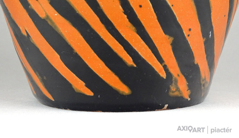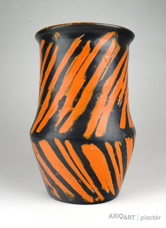 [0R415/X168] Régi, jelzett, hibátlan állapotú Gorka Lívia díszváza fekete, fehér és narancs mázzal. Alján jelzés: GORKA LÍVIA Magasság: 19 cm Szélesség: 8.5 cm Súly: 0.444 kg Gorka Lívia keramikus Születési hely: Nógrádverőce Születési dátum: 1925 Honlap: Kiállítások az adatbázisban:  Gorka Lívia keramikusművész életműkiállítása Mesterei: Gorka Géza. 1947-ben tett fazekas-mestervizsgát. Mestere édesapja, Gorka Géza volt. 1962: Nemzetközi Kerámia Biennálé, Prága, aranyérem; 1964: Munkácsy-díj; 1975: érdemes művész; Verőce díszpolgára. 1959-ig a verőcei Gorka-műhelyben dolgozott, azóta saját műtermében alkot. Kézműves módszerrel dolgozik, saját készítésű mázakat alkalmaz. Magas tüzű, egyéni készítésű anyagokkal dolgozik, az agyagot fémmel ötvözi. Erőteljes plasztikai hatású munkáinak színvilága visszafogott. Egyéni kiállítások 1964 • Csók Galéria, Budapest • Festőterem, Sopron • Janus Pannonius Múzeum, Pécs • Savaria Múzeum, Szombathely 1968 • Genf • Képcsarnok, Szeged 1977 • Műcsarnok, Budapest 1983 • Gülbaba köz 25. 1986 • Blaskovich Múzeum, Tápiószele 1994 • Három nemzedék, Gorka Múzeum, Nógrádverőce. Válogatott csoportos kiállítások 1955 • Fiatal iparművészek kiállítása, Ernst Múzeum, Budapest 1958 • Nemzetközi kerámia kiállítás, Gmunden 1959 • 4. Országos Iparművészeti kiállítás, Műcsarnok, Budapest 1962 • Ungerskt Konsthantverk, Stockholm 1962, 1964 • Nemzetközi Kerámia Biennálé, Prága 1963 • Modern magyar kerámia, Royal Festival Hall, London 1964 • Kortárs magyar művészek, Neue Galerie der Stadt, Linz • Nemzetközi kerámia kiállítás,Washington 1965 • 5. Országos Iparművészeti Kiállítás, Műcsarnok, Budapest 1968 • Mai magyar kerámia, Vár, Siklós 1968-1972, 1976, 1980-1988 • VI-X. Országos Kerámia Biennálé, Pécs 1970, 1975 • Jubileumi Iparművészeti kiállítás, Műcsarnok, Budapest • Magyar kerámia és textil,Moszkva • Nemzetközi kerámia kiállítás, Faenza 1995 • XX. századi magyar keramikusok. Válogatás az Iparművészeti Múzeum, Budapest gyűjteményéből, Iparművészeti Múzeum, Budapest. Művek közgyűjteményekben Kecskeméti Képtár Victoria and Albert Museum, London. Köztéri művei Zodiákus jegyek (samottos agyag, 1966, Gödöllő, GATE) Sejt nagyító alatt (kőagyag, 1979, Tatabánya, Kórház) Kerámiakompozíció (1983, Tatabánya, Megyei Kórház). Irodalom Vallomás, Budapest, 1979 ~-FOCHT G.: Három nemzedék. A Gorka Múzeum Verőcén, Budapest, 1994 Fiatal iparművészek, Szabad Művészet, 1955/9. FRANK J.: ~, Élet és Irodalom, 1964/5. MAJOR M.: ~ kiállítása elé, Magyar Építőművészet, 1964/6. kiállításán, Művészet, 1964/10. HETTEŠ, K.-RODA, P.: Moderne Keramik, Prága, 1965 SZELESI Z.: ~ kiállítása Szegeden, Művészet, 1968/12.  ~val, Műgyűjtő, 1970/2. N. DVORSZKY H.: ~, Művészet, 1973/3. kiállítása, Ipari Művészet, 1973/3. VADAS J.: Kiállítások, Élet és Irodalom, 1973. március 27. Forma Hungarica, Budapest, 1974 VADAS J.: Küklopsz edényei, Élet és Irodalom, 1987. október 9. Ős pottery, New Hungarian Quarterly, 1988/3. Három nemzedék. Gorka Géza, ~, Focht Géza, Magyar Iparművészet, 1994/5. Laczkó Ibolya Forrás: artportal.hu