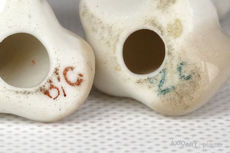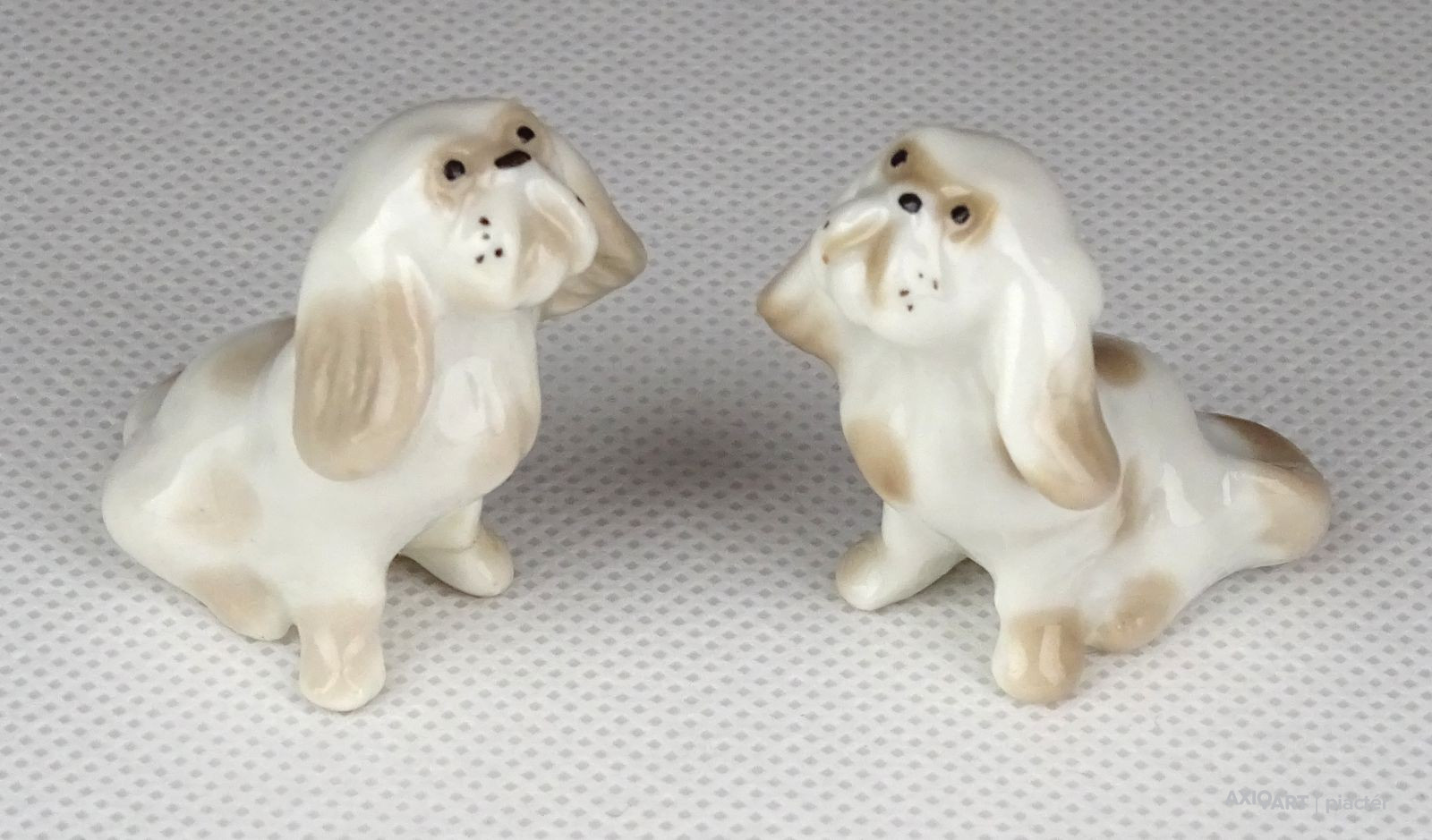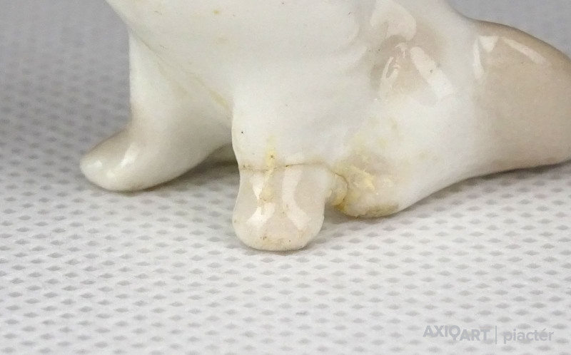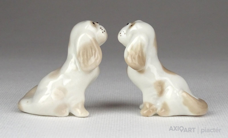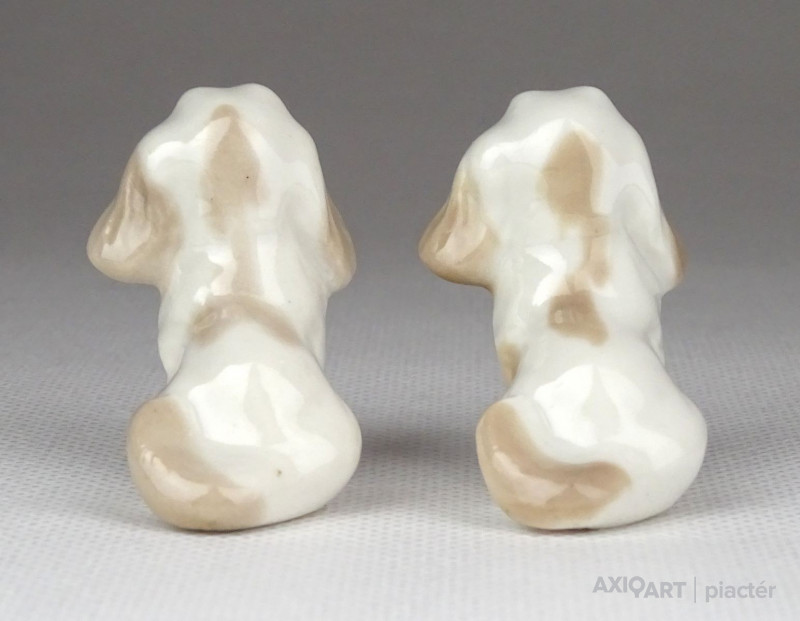 [1E982/X010] Régi hibátlan állapotú két darab kis méretű porcelán kutya. Pekingi palotakutya, palotapincsi. Alján jelzés, lásd fotó. Magasság: 3.8 cm Szélesség: 2.5 cm Hosszúság: 3.5 cm Súly: 0.03 kg
