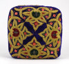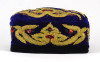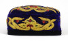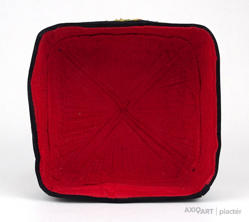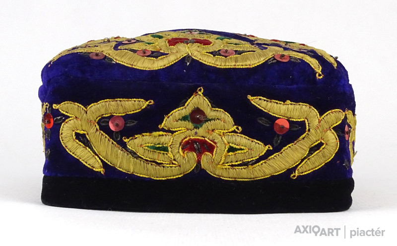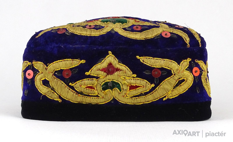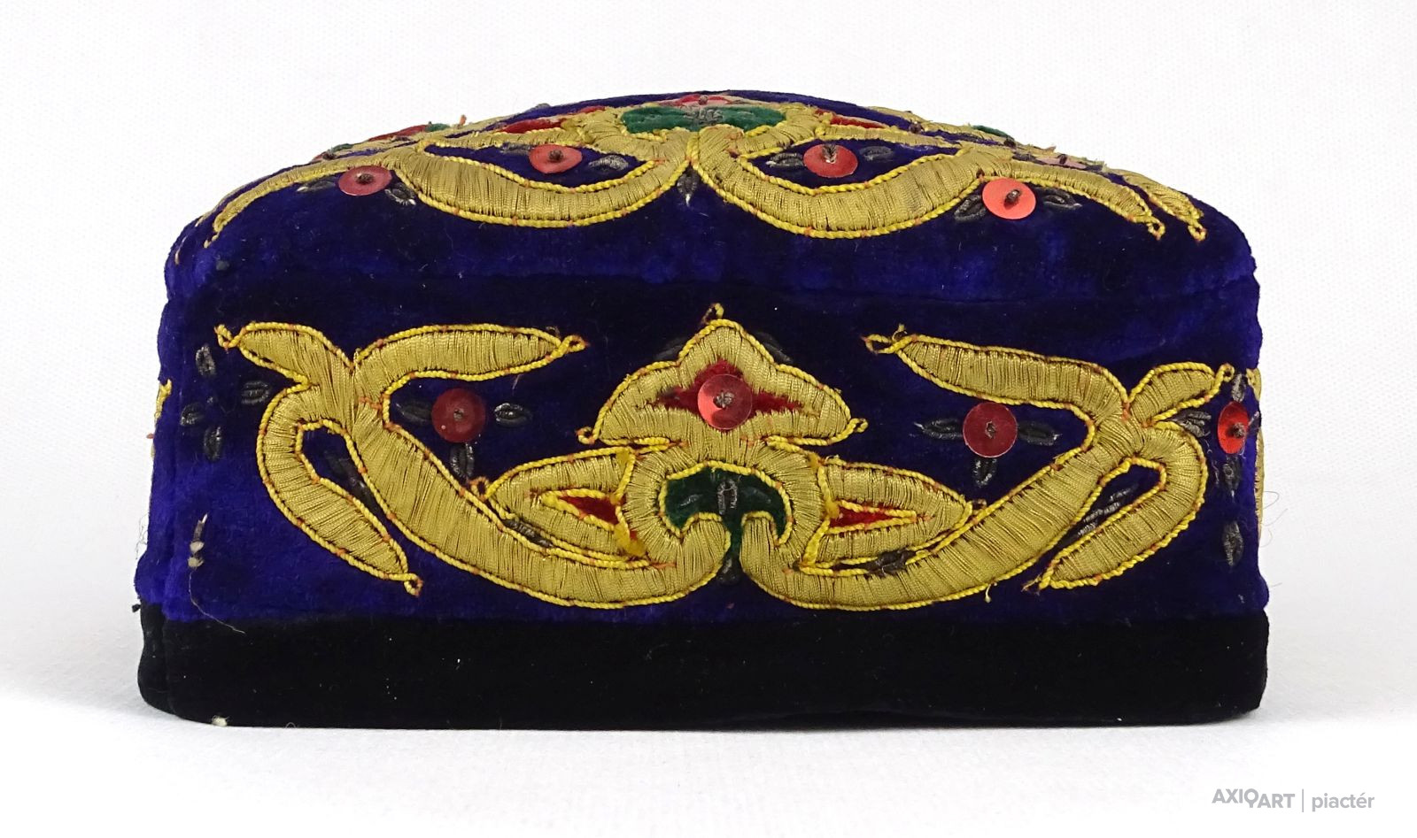 Régi, szép állapotú, belül piros, kívül lila, aranysárga mintákkal díszített, hímzett tubetejka fejfedő. Szögletes alakú, kemény kalap.