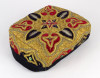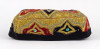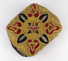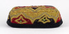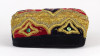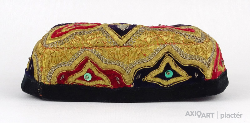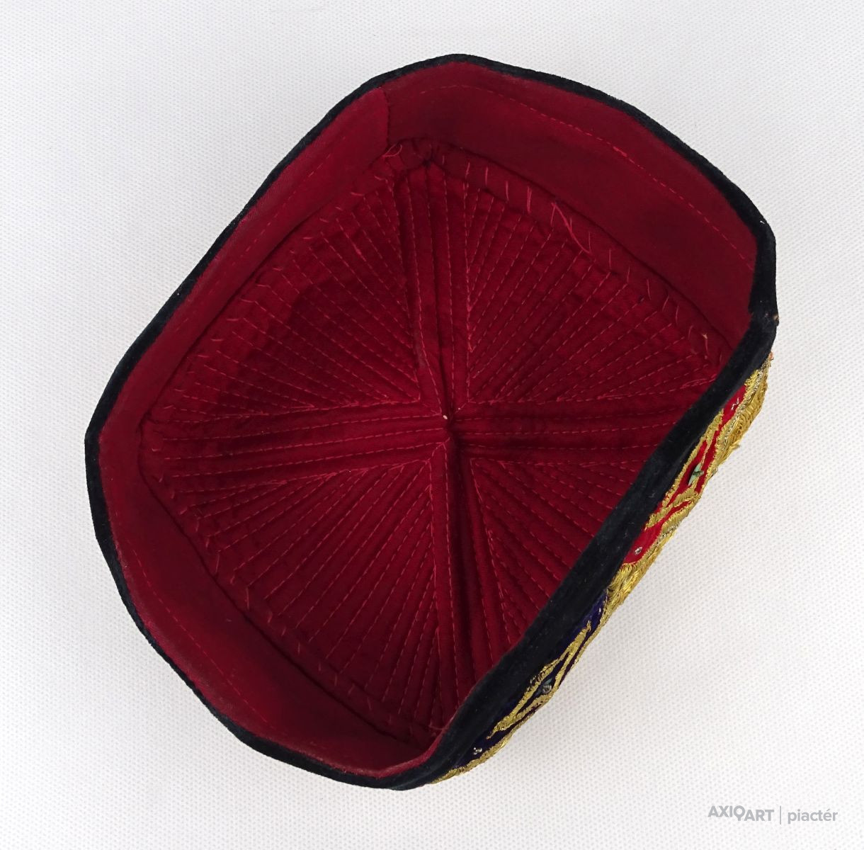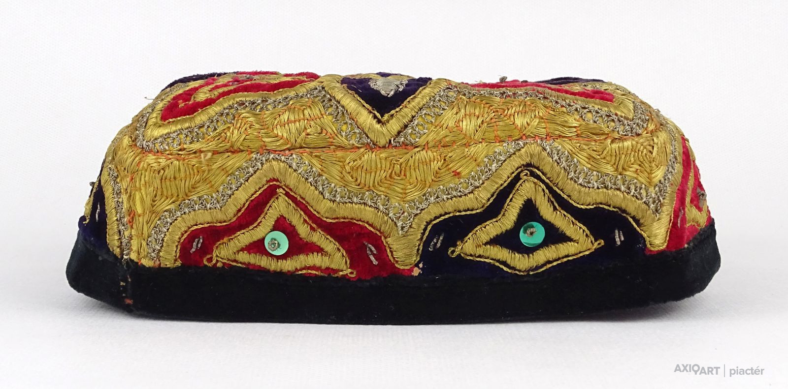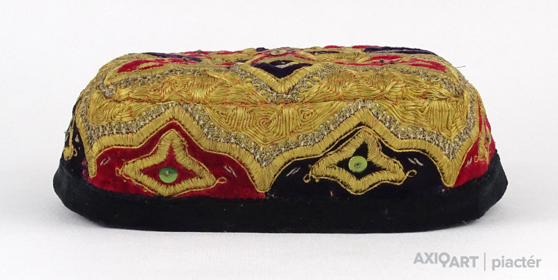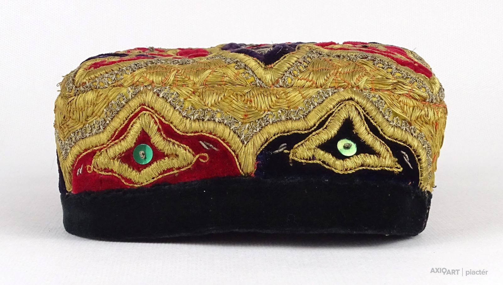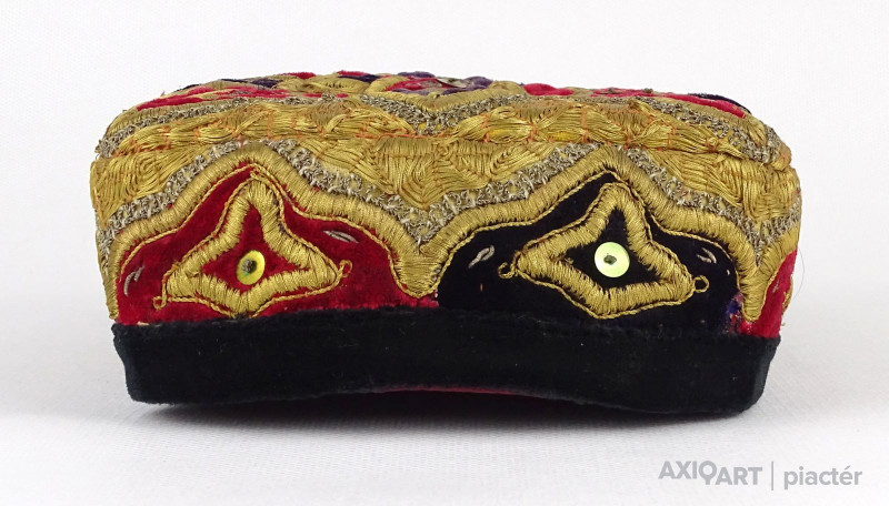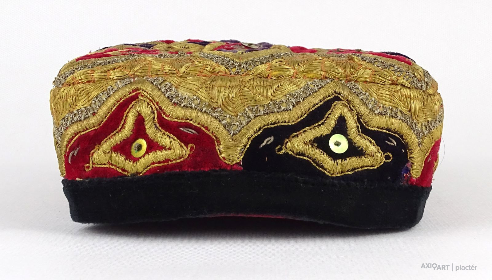 Régi, szép állapotú, belül piros, kívül gazdag aranysárga mintákkal díszített, hímzett tubetejka fejfedő. Szögletes alakú, kemény kalap.