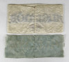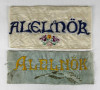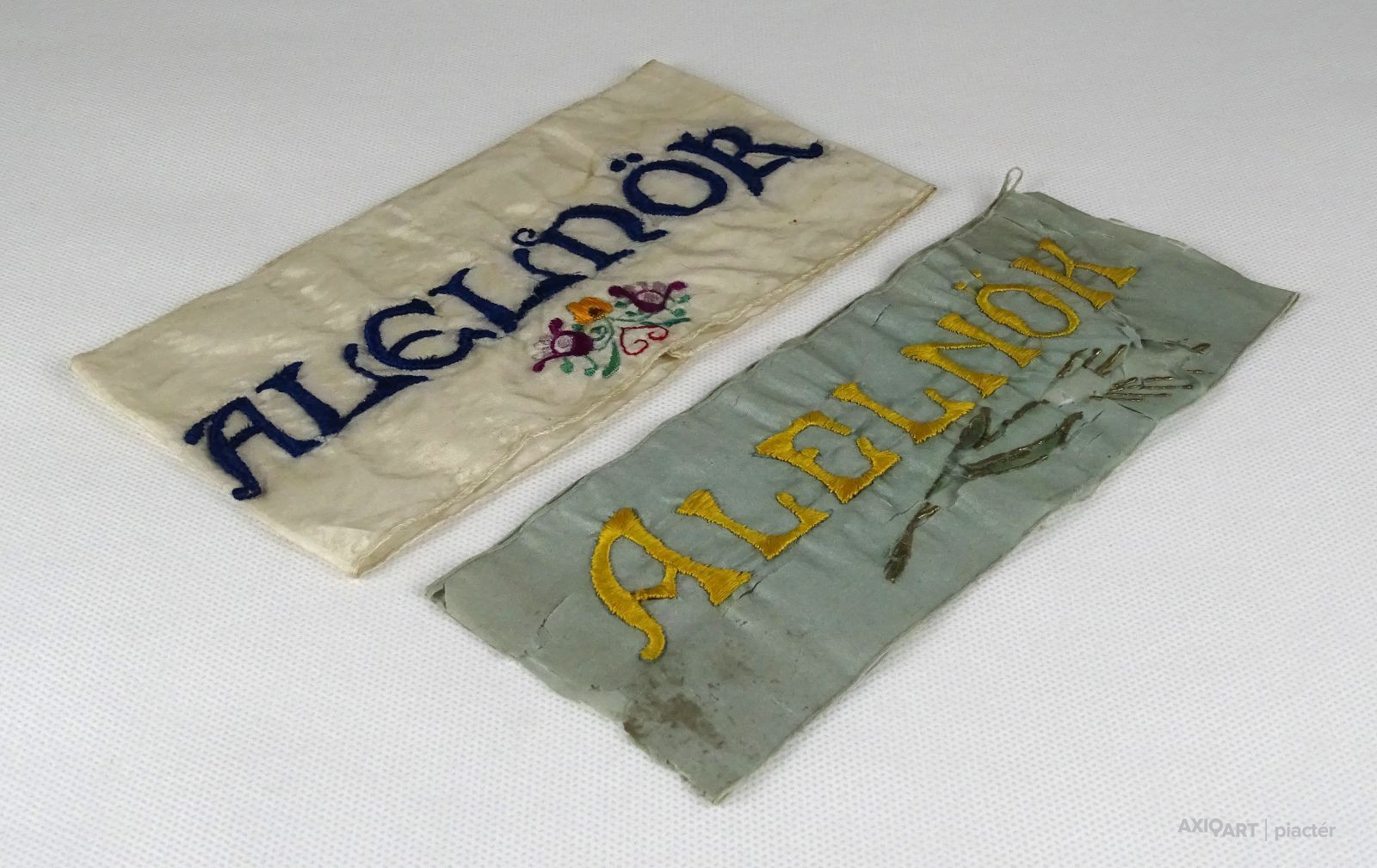 [1L679/X248] Régi, selyemre hímzett karszalag, kettő darab. Virágokkal díszített selyem karszalagok. A fehér szép állapotban megmaradt, míg a világoskék anyaga erősen viseltes. Felirat: ALELNÖK Súly: 0.01 kg