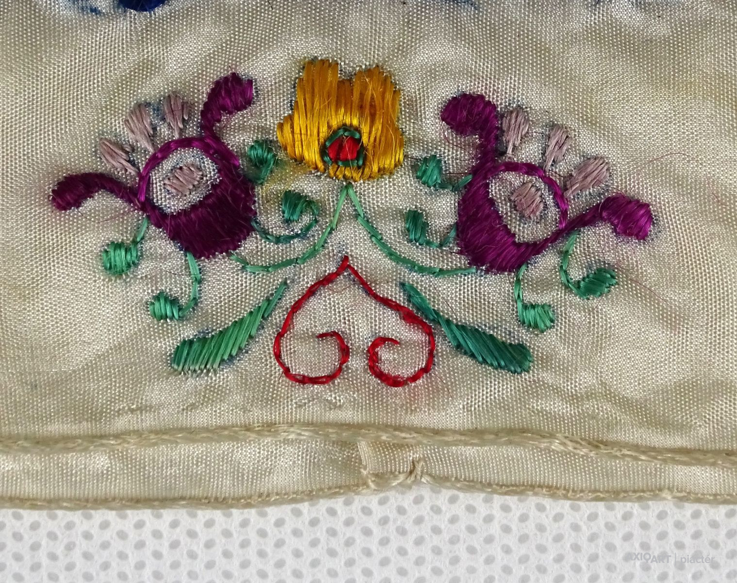 Régi, selyemre hímzett karszalag, kettő darab. Virágokkal díszített selyem karszalagok. A fehér szép állapotban megmaradt, míg a világoskék anyaga erősen viseltes.