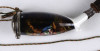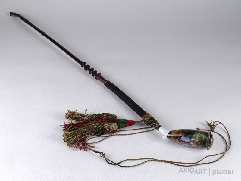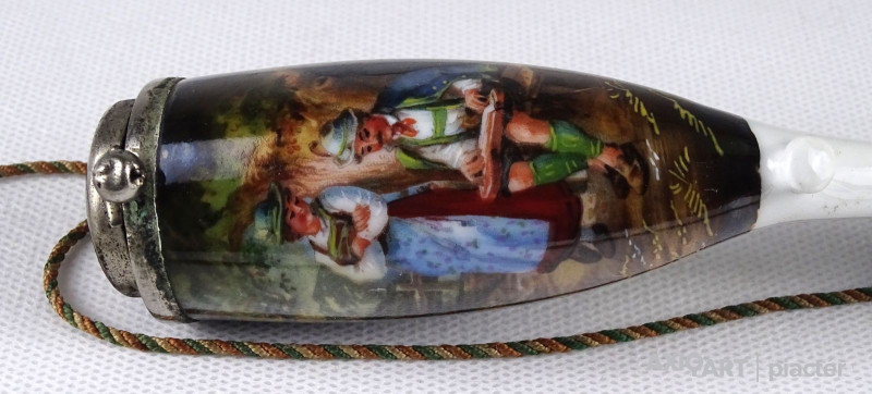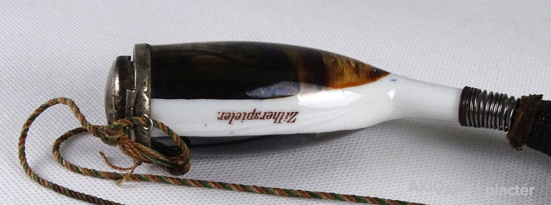 Régi, hosszú fa szárral rendelkező porcelánfejes, fém fedeles pipa. A pipát bajor kétalakos jelenet, citerázó férfi és zenét hallgató népviseletes női alak díszíti. A fa szár végén szaru szipka található.