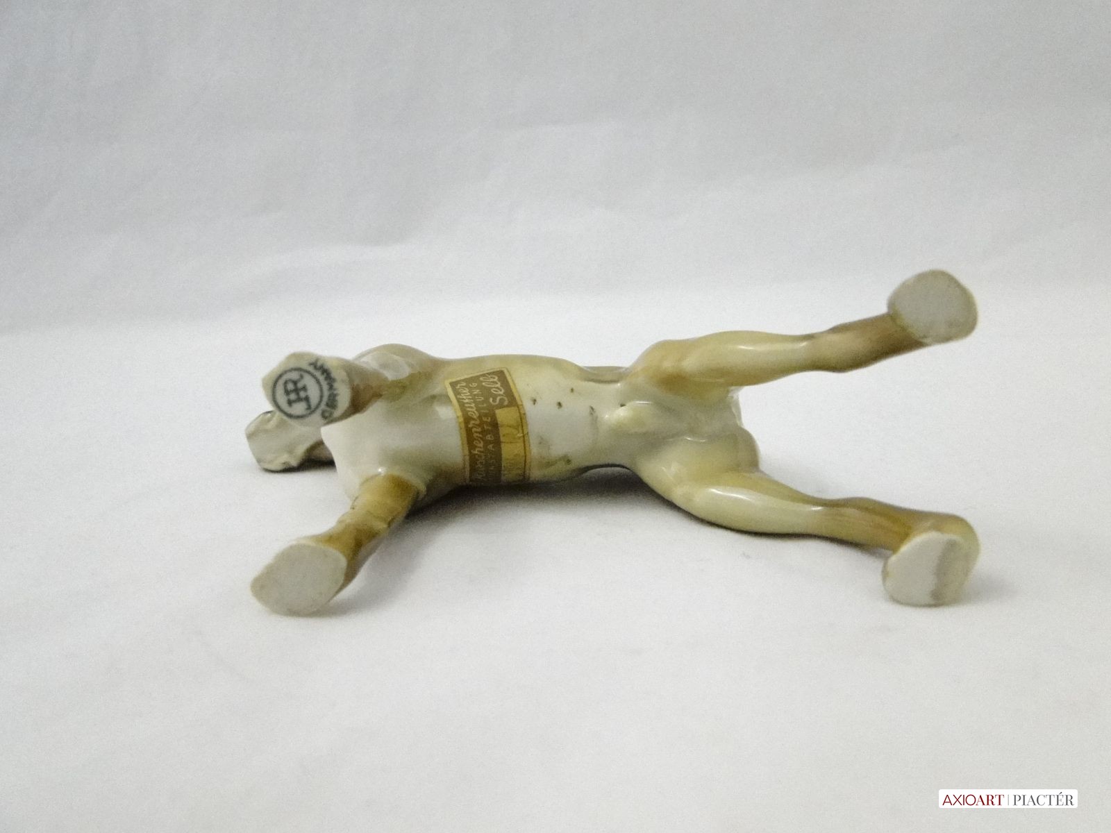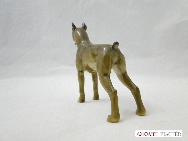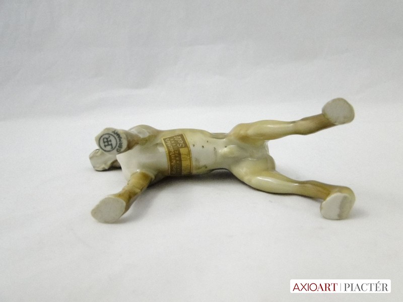 [8461/UZ-K] Régi hibátlan állapotú jelzett szép élethű német porcelán boxer kutya szobor, kézi festésű. Bal mellső mancsán zöld márkajelzés. HR GERMANY Hasán papírvignetta rajta felirat: HUTSCHENREUTHER KUNSTABTEILUNG SELB 2046/28 Magasság: 12.5 cm Szélesség: 4.5 cm Hosszúság: 13 cm Súly: 0.14 kg