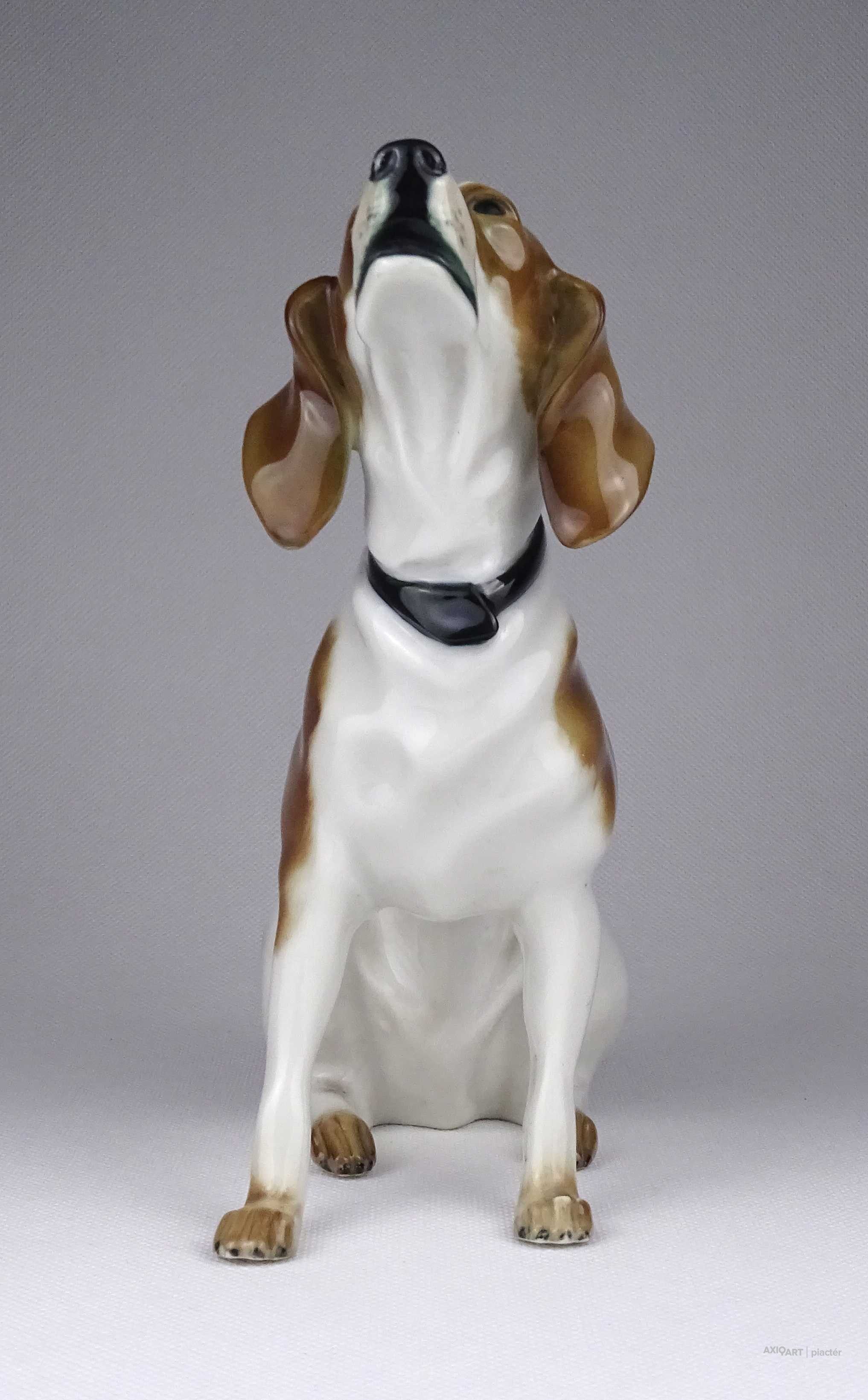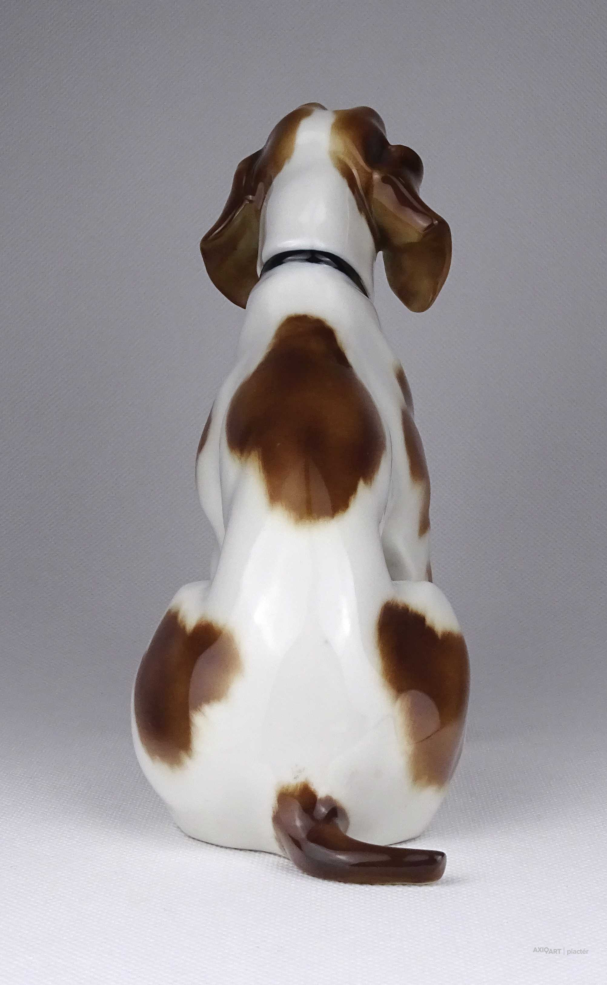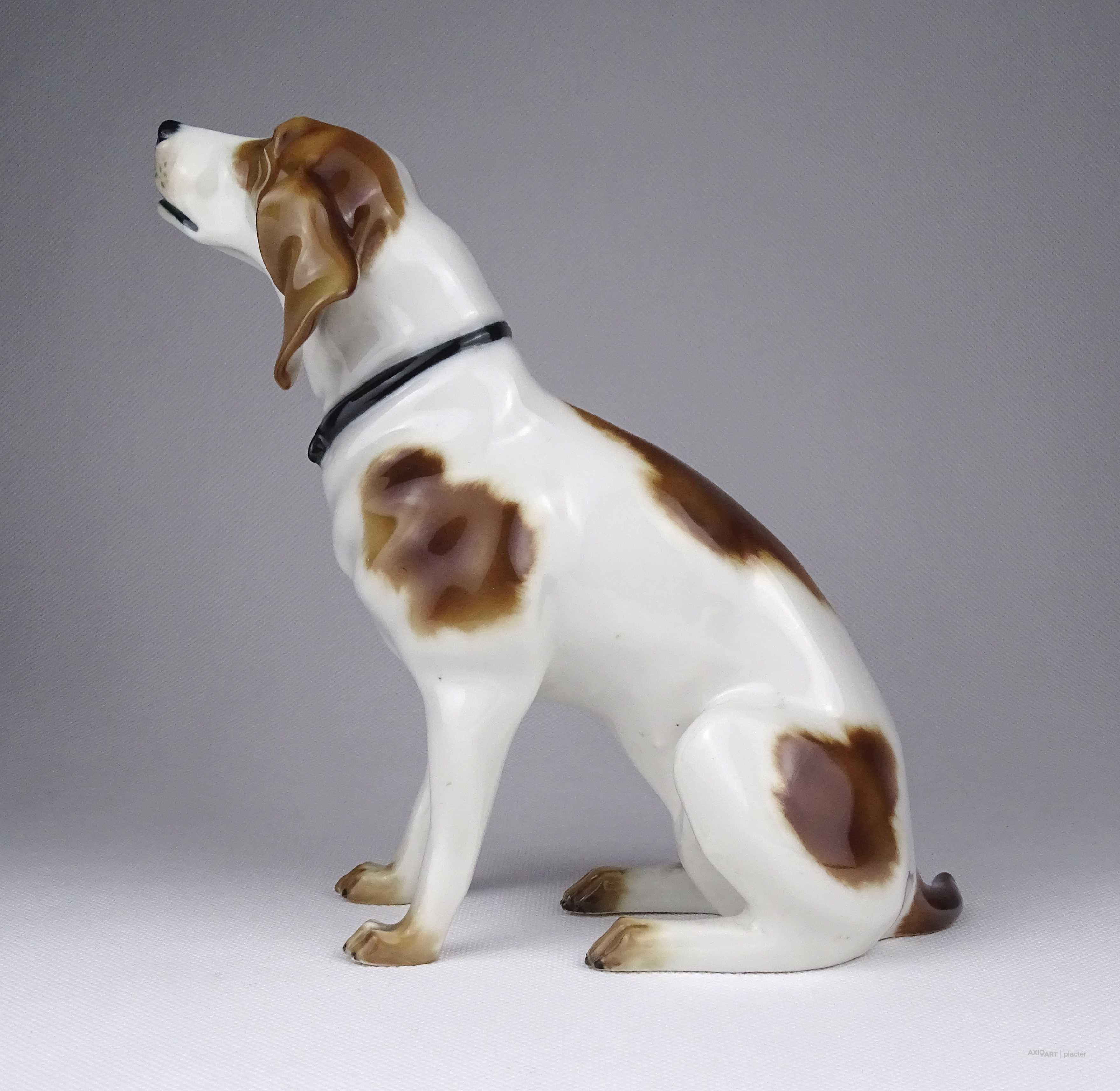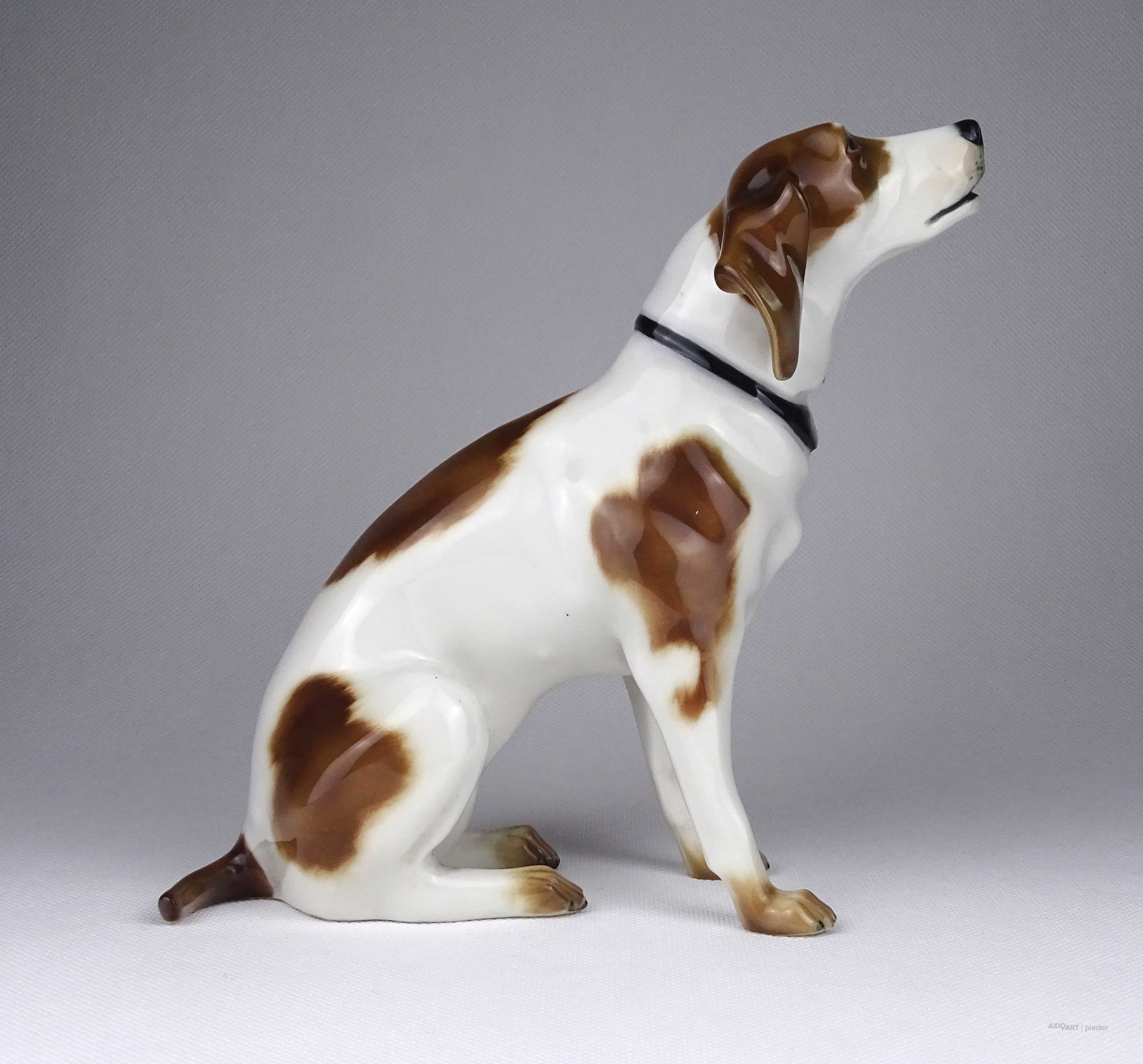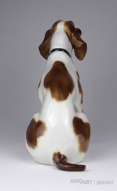 Régi, hibátlan állapotú, nagyméretű, jelzett, élethű, kézi festésű német Hutschenreuther porcelán vadász kutya szobor, porcelánfigura.