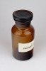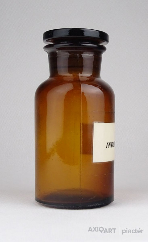 [0Y788/Z047] Régi, szép állapotú, barna patika üveg, gyógyszerészeti tároló üveg. Oldalán címke, rajta felirat: INDOMETACINUM Magasság: 13.5 cm Szélesség: 6.5 cm Súly: 0.26 kg