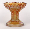 [1Q781/X158] Régi, sárgás színű, irizáló felületű kínáló kehely. Oldala körben gyönyörűen díszített. Formába préselt, gyönyörű irizáló üveg dísztárgy. Magasság: 13.5 cm Szélesség: 14 cm Súly: 0.68 kg