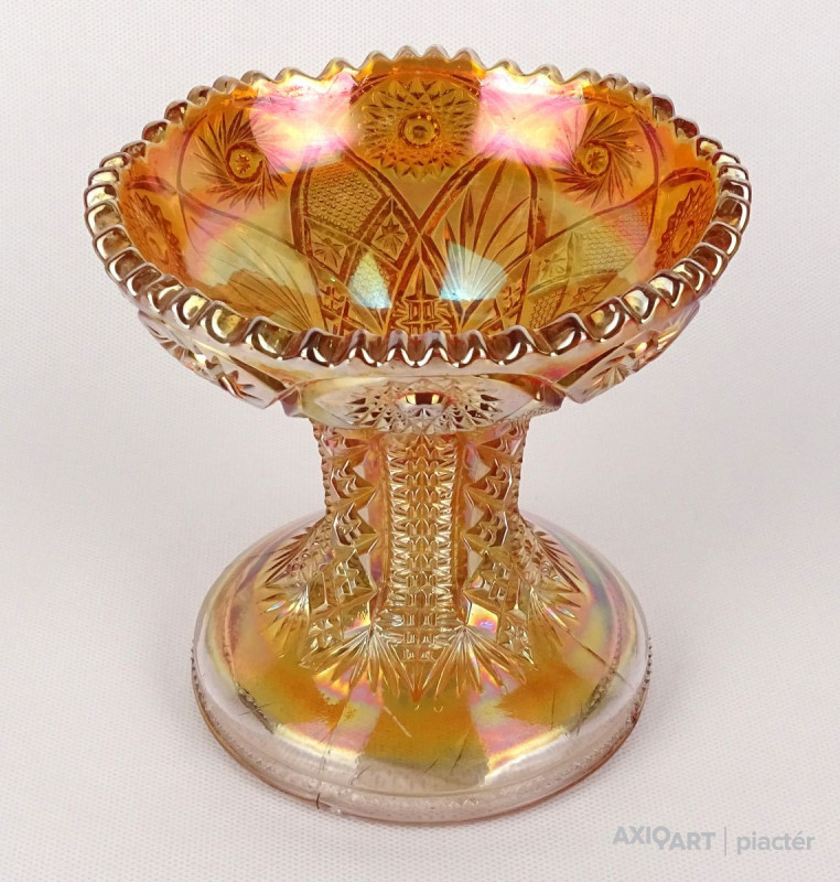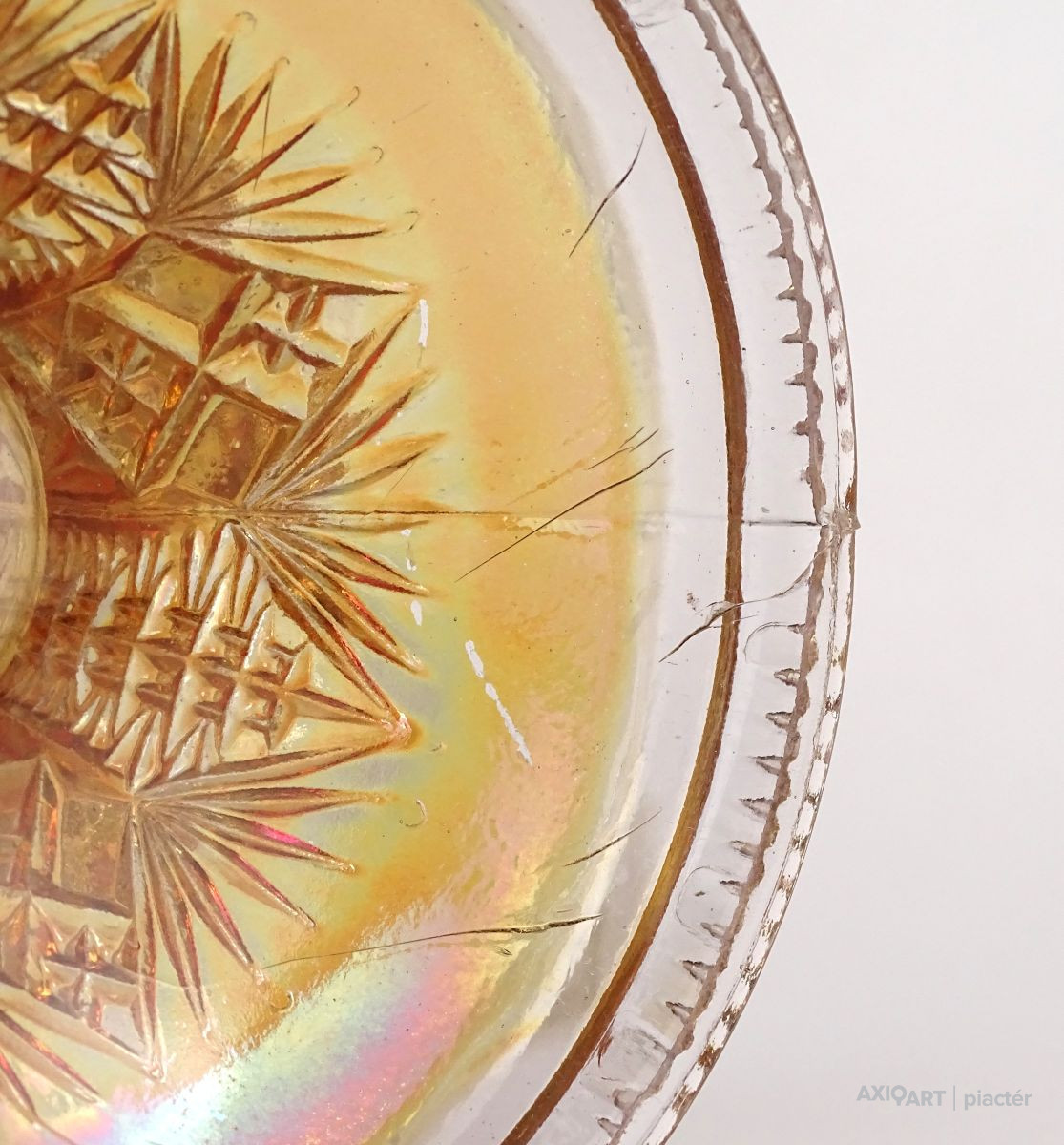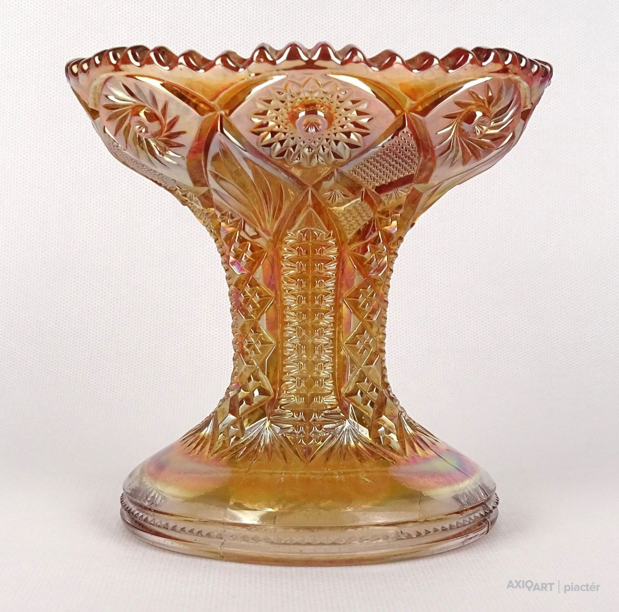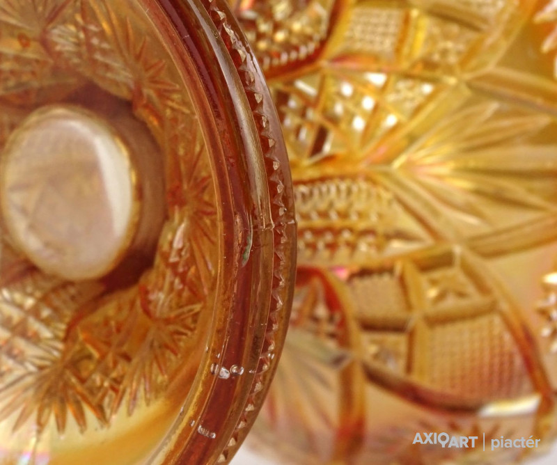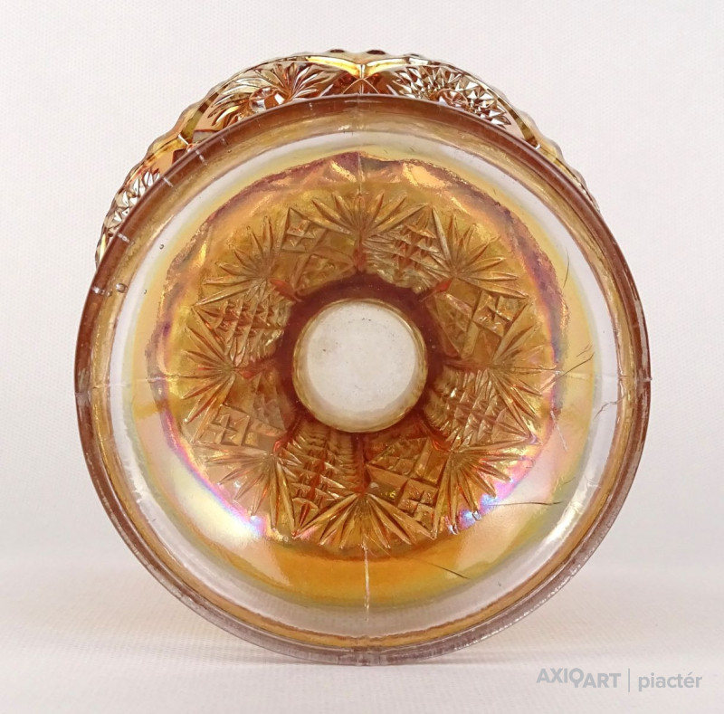 Régi, sárgás színű, irizáló felületű kínáló kehely. Oldala körben gyönyörűen díszített. Formába préselt, gyönyörű irizáló üveg dísztárgy.