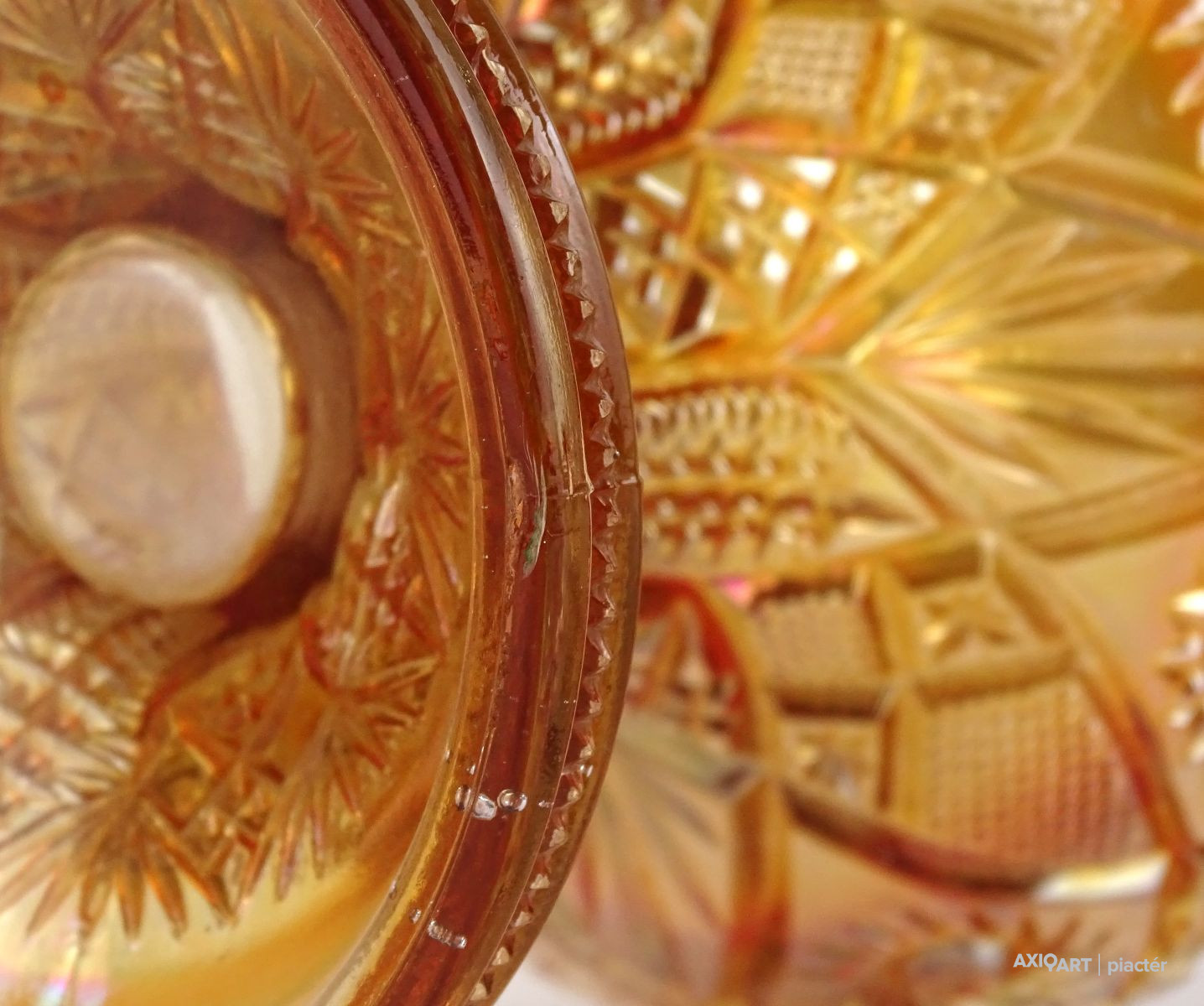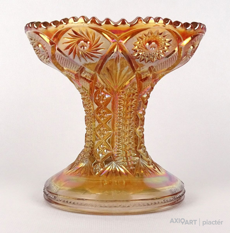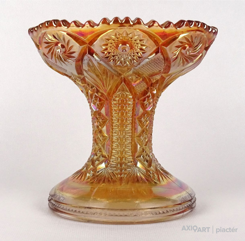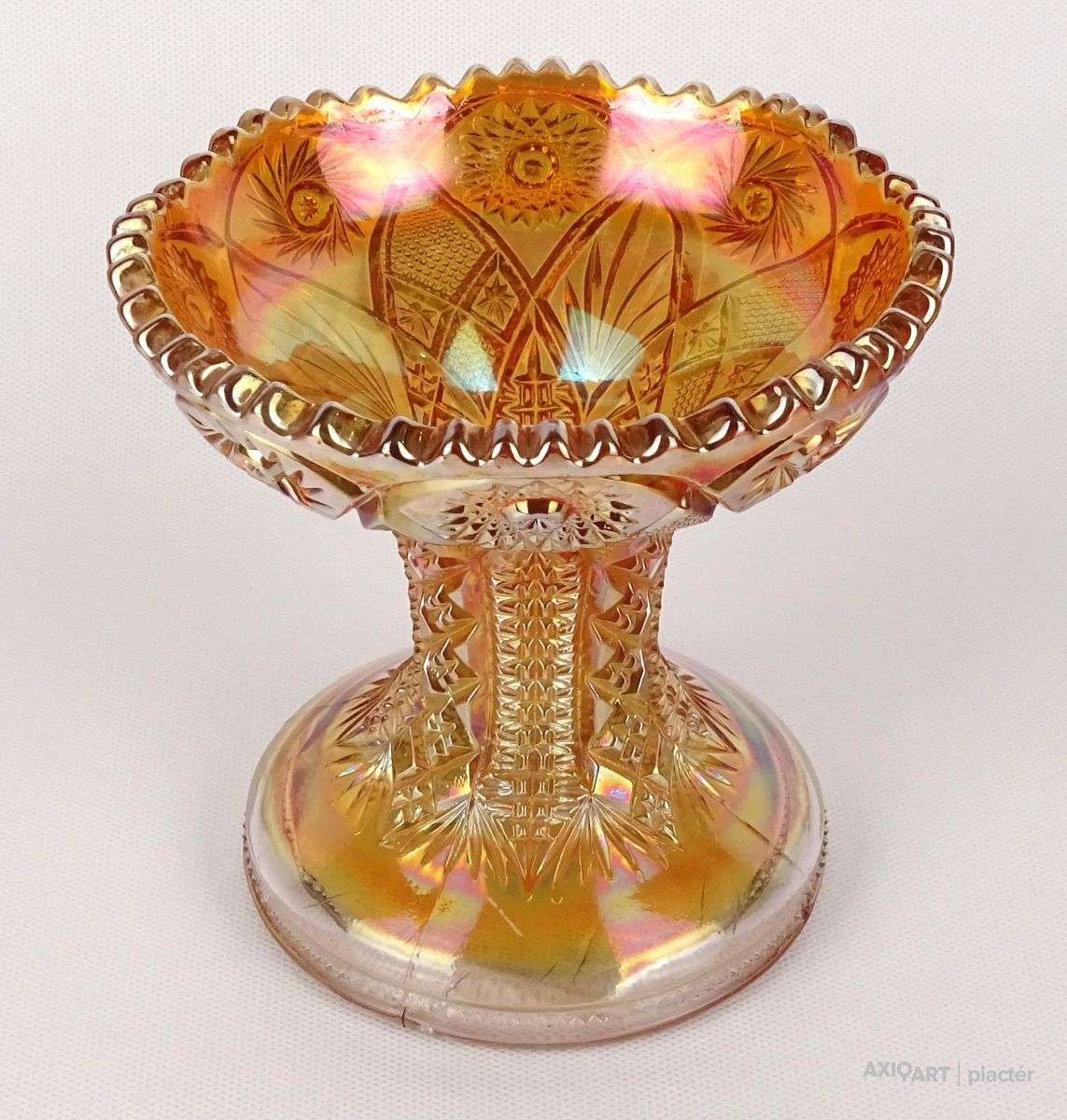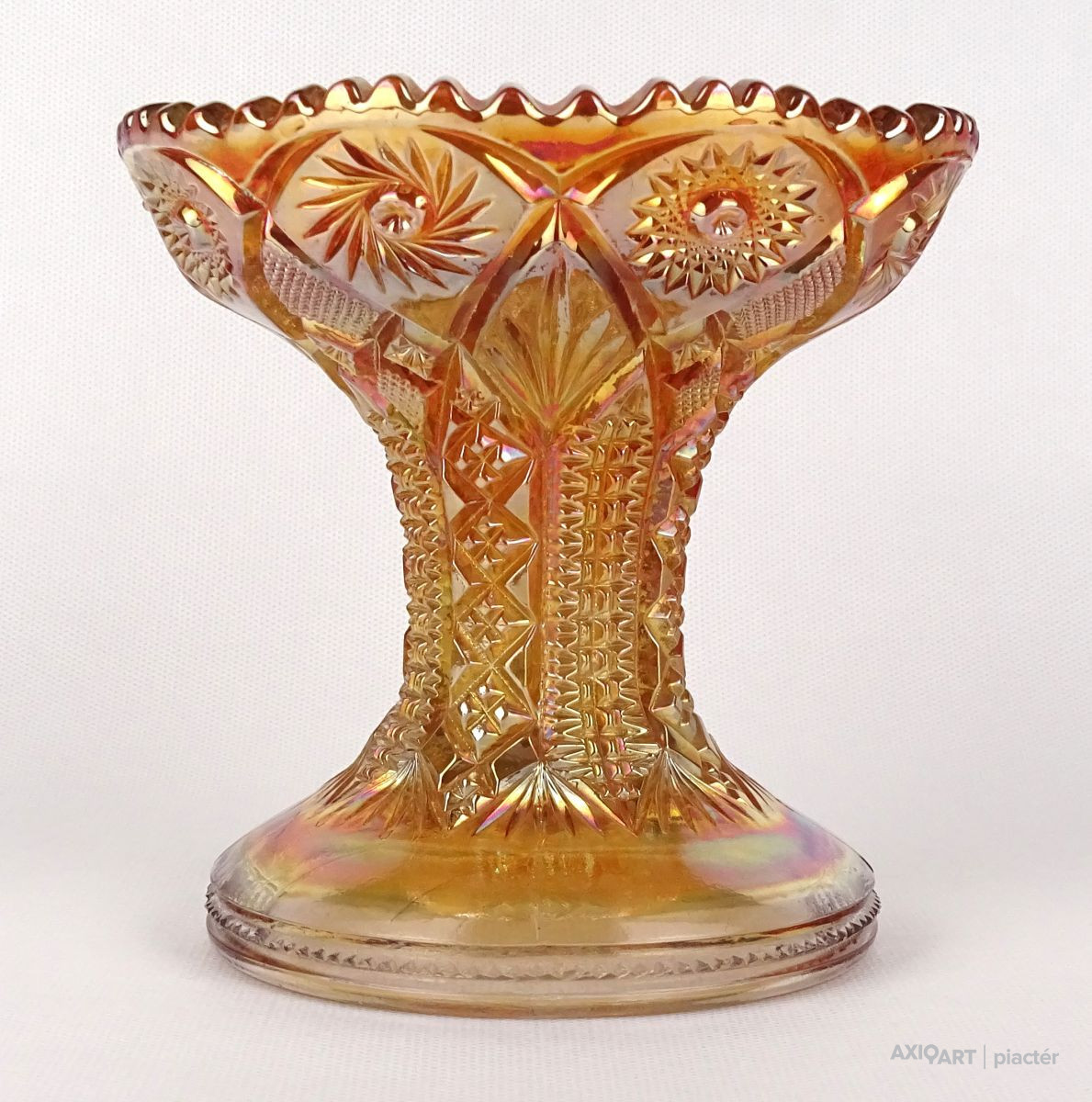 Régi, sárgás színű, irizáló felületű kínáló kehely. Oldala körben gyönyörűen díszített. Formába préselt, gyönyörű irizáló üveg dísztárgy.