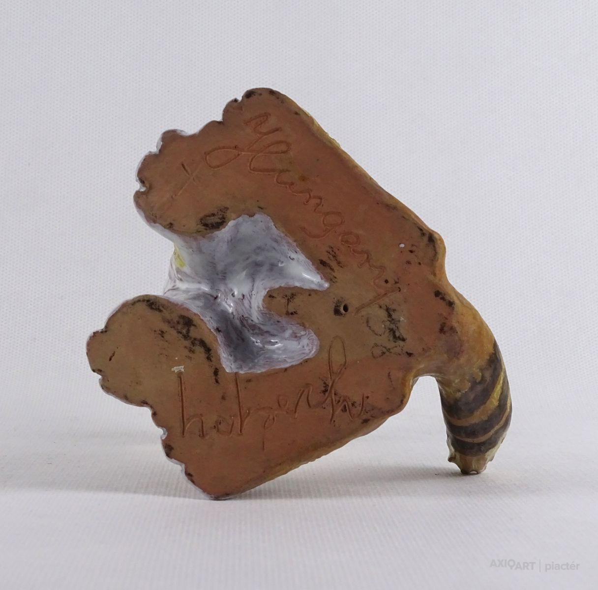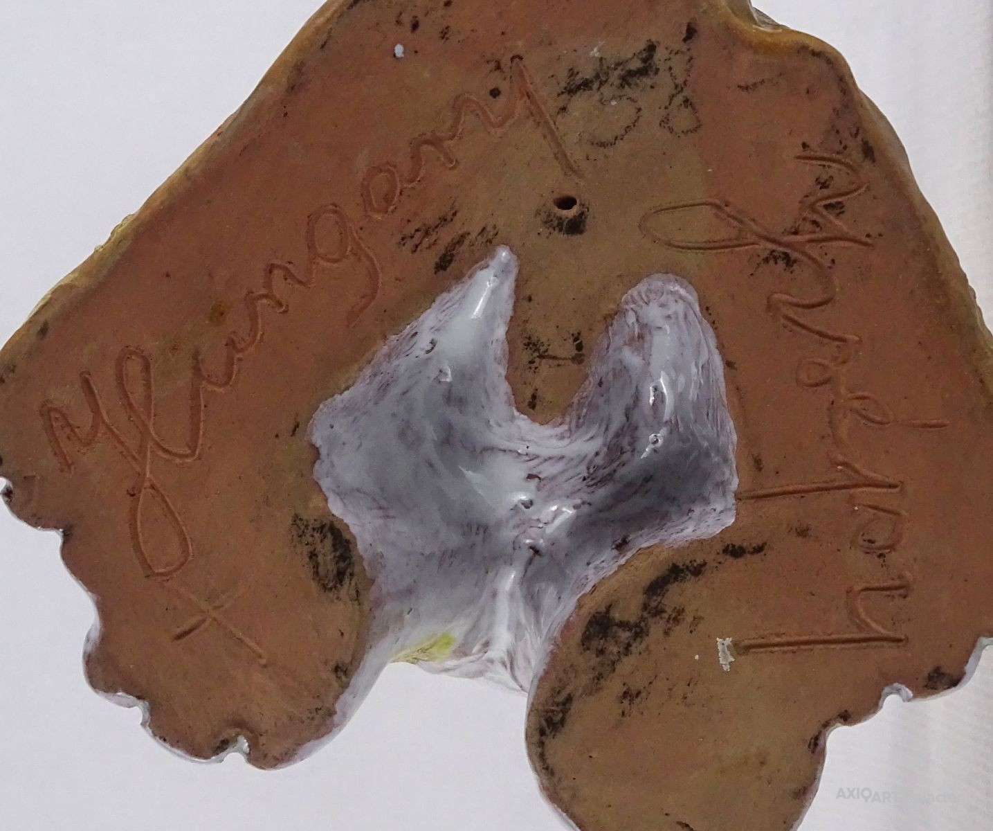 [1S294/Z059] Jelzett Kis Roóz Ilona kerámia figura. Felső peremén néhány kisebb elfestett lepattanás található, lásd fotó. Alján jelzés: KISS ROÓZ Magasság: 12.5 cm Szélesség: 11 cm Súly: 0.485 kg Kiss Roóz Ilona keramikus Születési hely: Szatmárnémeti [Satu Mare, RO] Születési dátum: 1920 Kiállítások az adatbázisban:  Kiss Roóz Ilona életműkiállítása Mesterei: Orbán Antal, Ohmann Béla. 1939-43: Iparművészeti Iskola, mesterei: Orbán Antal, Ohmann Béla. 1956, 1962: Munkácsy-díj; 1980: érdemes művész; 1984: SZOT-díj; 1994: MSZOSZ díja; 1995: Magyar Köztársasági Érdemrend Középkeresztje. A magyar kerámia Kovács Margit által teremtett naiv-népies irányzatának jeles művelője. Edényeit, kisplasztikáit, ill. murális alkotásait vidám színvilág és kedves humor jellemzi. 1948 és 1952 között tanított az Iparművészeti Főiskolán, azóta szabadfoglalkozású. Egyéni kiállítások 1964 ? Katona József Múzeum, Kecskemét 1973 ? Derkovits Galéria, Szombathely 1977 ? Csepel Vas és Fémművek, Budapest 1981 ? Kaesz Gyula Szakmunkásképző Intézet, Budapest 1983 ? Nógrádi Sándor Múzeum, Salgótarján 1987 ? Petőfi Művelődési Ház, Tiszaluc 1994 ? Petőfi Művelődési Ház, Tiszaluc 1995 ? Csók Galéria, Budapest [Pannonhalmi Zsuzsával és Sarkantyu Judittal] Válogatott csoportos kiállítások 1952 ? Iparművészeti kiállítás, Ernst Múzeum, Budapest IV. Országos Iparművészeti Kiállítás, Műcsarnok, Budapest Országos Iparművészeti Kiállítás, Műcsarnok, Budapest I., II. Országos Kerámia Biennálé, Pécs Magyar kerámia, Ankara, Isztambul XX. századi magyar keramikusok, Iparművészeti Múzeum, Budapest ? Az agyag mesterei, Vigadó Galéria, Budapest Őszi Kerámia Kiállítás, Olaf Palme Ház, Budapest Művek közgyűjteményekben Déri Múzeum, Debrecen ? Iparművészeti Múzeum, Budapest ? Janus Pannonius Múzeum, Pécs ? Kispréposti Palota, önálló gyűjtemény, Eger. Köztéri művei kerámia dombormű (1958, Pereces, bölcsőde) kerámia napóra (1959, Székesfehérvár, Béke téri iskola) csempeburkolat (1961, Szeged, rendelőintézet) falikép (kerámia, 1962, Sopron, Gyermekszanatórium) kerámia falikép (1966, Békéscsaba, bölcsőde) Irodalom GÁL J.: ~ 77 éves. Beszélgetés a művésszel, Magyar Iparművészet, 1997/4. KESZTHELYI K.-LACZKÓ I.: A magyar kerámiaművészet I., Alkotók, adatok 1945-1998, Budapest, 1999. Vadas József + MAOE Forrás: artportal