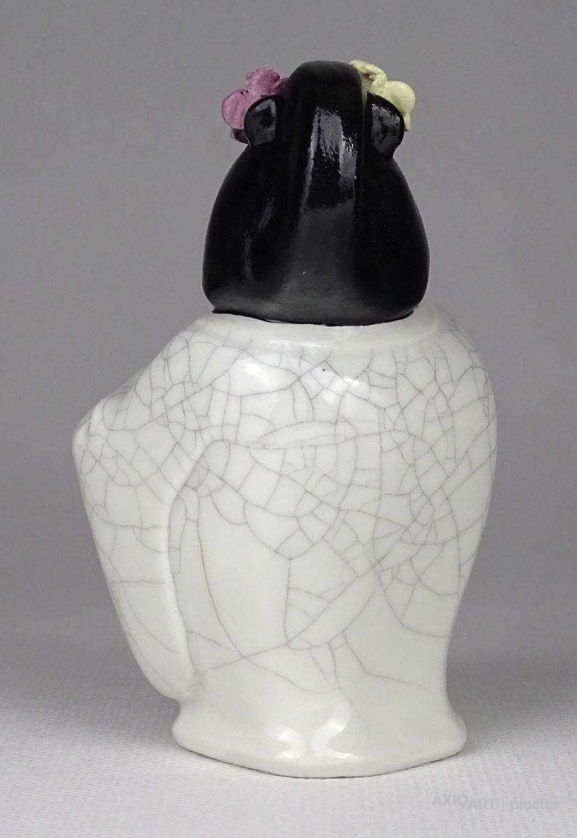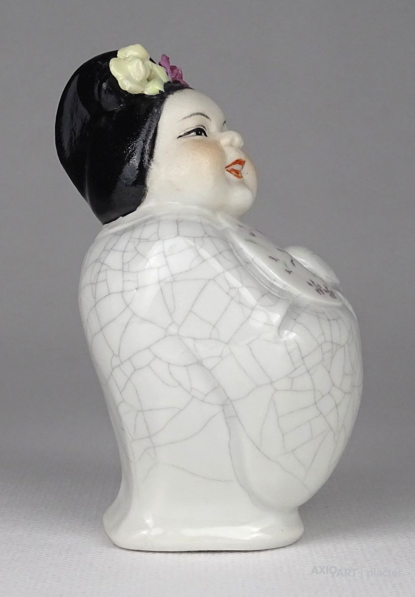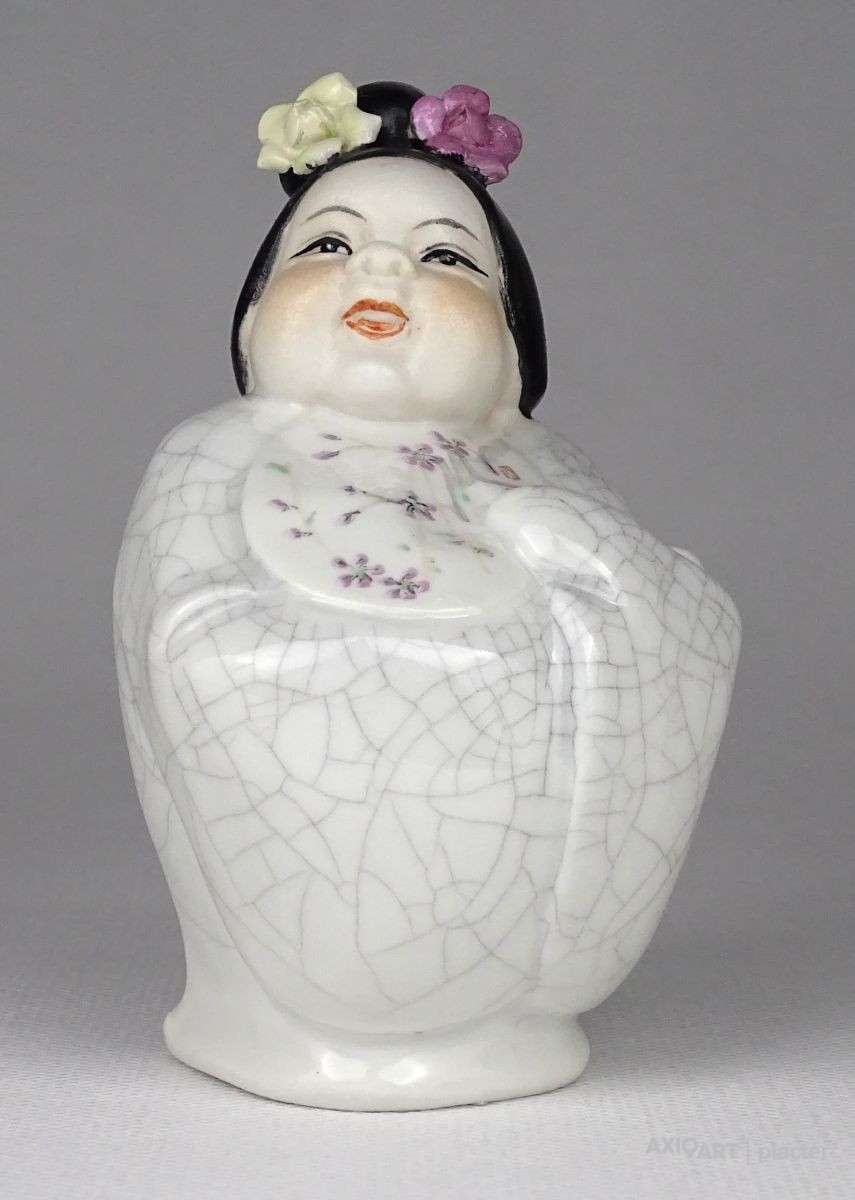 [1Q349/Z017] Régi ritka art deco porcelán figura. Kis méretű mosolygós japán nő porcelán figura. A virág hajdíszek javítottak. Magasság: 10 cm Szélesség: 6 cm Súly: 0.145 kg