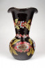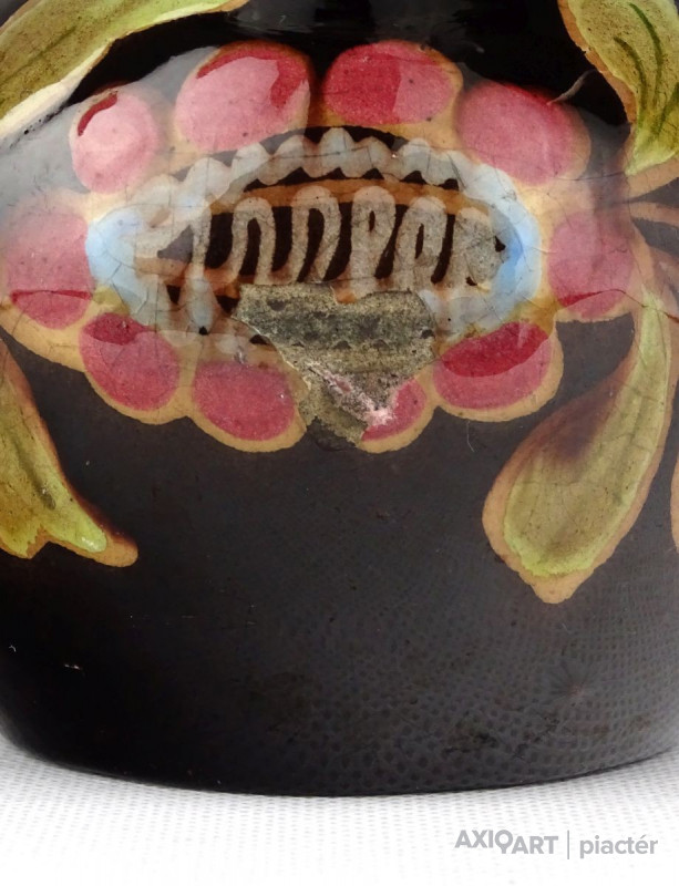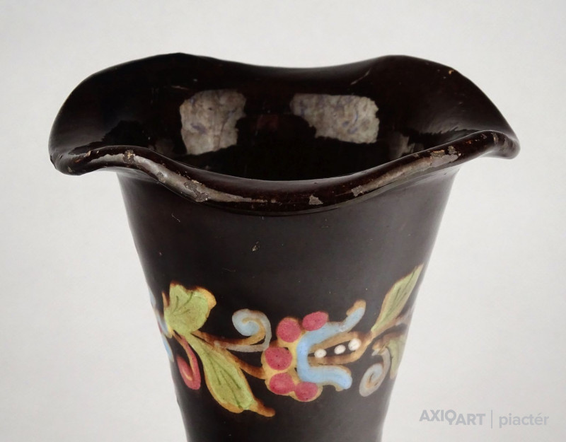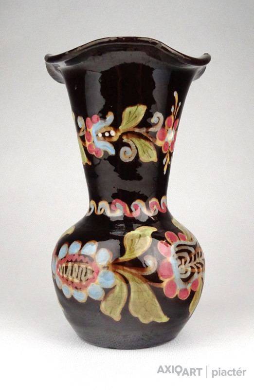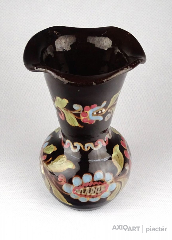 Régi, gyönyörű, kézzel festett, kis méretű, fodros szélű, jelzett vásárhelyi kerámia váza. A vázán mázhibák találhatók.