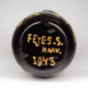 [1F867/UZ-N] Szép állapotú, jelzett extra nagy méretű, népi motívumokkal díszített gazdagon díszített, madaras, zöld mázas kerámia pálinkás butella. Oldalán felirat: "AZ EMBERNEK MEGJELENIK EGY REGÉNYE, ÉS HA TEHET RÓLA, HA NEM DE ÍRÓ LESZ AZONNAL, AKIRE EZENTÚL EGYRE MÉLYEBB SODRÁSSAL ÁRAD A VILÁG. NINCS IRGALOM MERT NINCS MEGÁLLÁS..." (SZABÓ PÁL) KÉSZÜLT A BUTELLA KÁRÁSZ JÓZSEF RÉSZÉRE, HÓDMEZŐVÁSÁRHELYEN 1984-BEN MÓNUS F. Magasság: 36 cm Szélesség: 14.5 cm Súly: 1.775 kg Mónus Ferenc Hódmezővásárhelyen született 1931-ben, ugyanott hunyt el 1999-ben. Fazekas apja 12 gyermeke közül az utolsó előttiként született. Sándor bátyja 22 évvel volt idősebb nála. Ő is a fazekas műhelyben nevelkedett. 12 évesen már hajtotta a korongot. 1945-48 között végezte az ipariskolát, közben apjánál volt tanuló. Szabadulása után apja műhelyében maradt. Használati és díszedényeket készítettek és piacoztak velük.1951-ben Hódmezővásárhelyen megalakult az Agyagiparosok Háziipari Szövetkezete, ahová apjával és testvéreivel együtt lépett be, 1957-ig itt dolgozott. Mestervizsgát tett majd önálló műhelyt indított. Készített cserépkályhát, dolgozott egy üveg és porcelánértékesítő vállalatnak, majd 1969-ben tért vissza a korongolt edények készítéséhez. 1966-1992-ben a Budapesti Háziipari Szövetkezet tagja lett, az országos ismertség, elismerések ekkor kezdődtek alkotó életében. A szakmai pályázaton nívódíjat kapott, 1982-ben a Szocialista Kultúráért kitüntetéssel jutalmazták. Alkotásaival számos hazai városban szerepelt. A Háziipari Szövetkezet megszűnése után is folyamatosan zsűriztetett. Munkássága során mindvégig a vásárhelyi fazekas hagyományokat kutatta és alkalmazta. Belenőtt a 19. századi fazekasság forma és motívumvilágába, kialakítva ebből önálló stílusát. Fennálló edényei az újvárosi fazekas stílust követik, ebből alakította ki a lakásdísznek szánt nagyított butellákat, Miskákat, padlóvázáit. Étkészletei, tányérjai használati funkciójúak, szívesen alkalmazta a csúcsi fehér alapon kék írókás díszítményt. Áttört, nagyméretű edényeinek korongozása önmagában is bizonyítja magas fokú technikai tudását. Így nyilatkozott: „Fazekas vagyok, nem keramikus, mert a fazekas fogalma a korongnál kezdődik és a korongnál végződik.” Több országos díjjal jutalmazták, a Pro Urbe díjat szülővárosa 198-ben adományozta neki. 1967-ben népi iparművész címet kapott. 1976-ban kapta meg a Népművészet Mestere kitüntető címet. Forrás: http://www.studiolum.com/nm/hu/monusferenc.htm