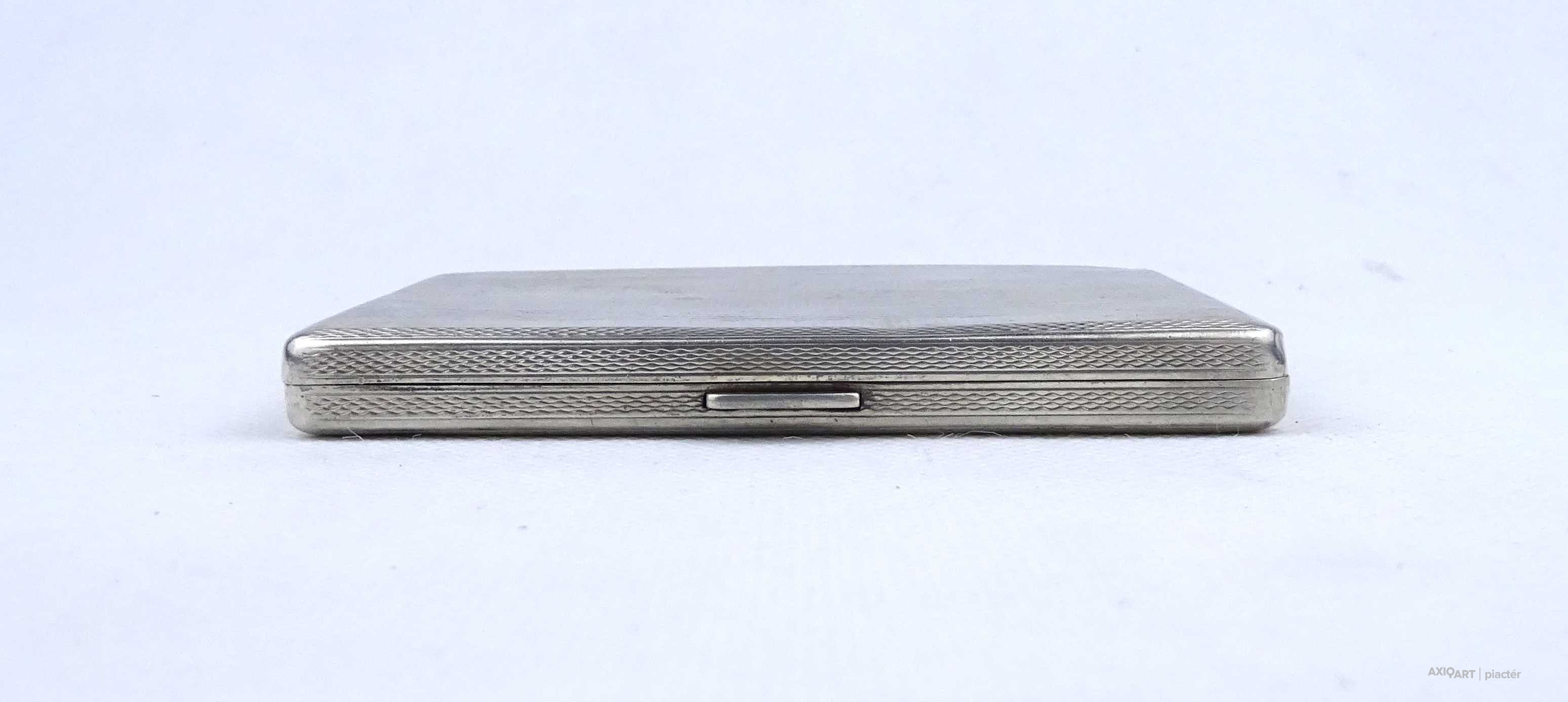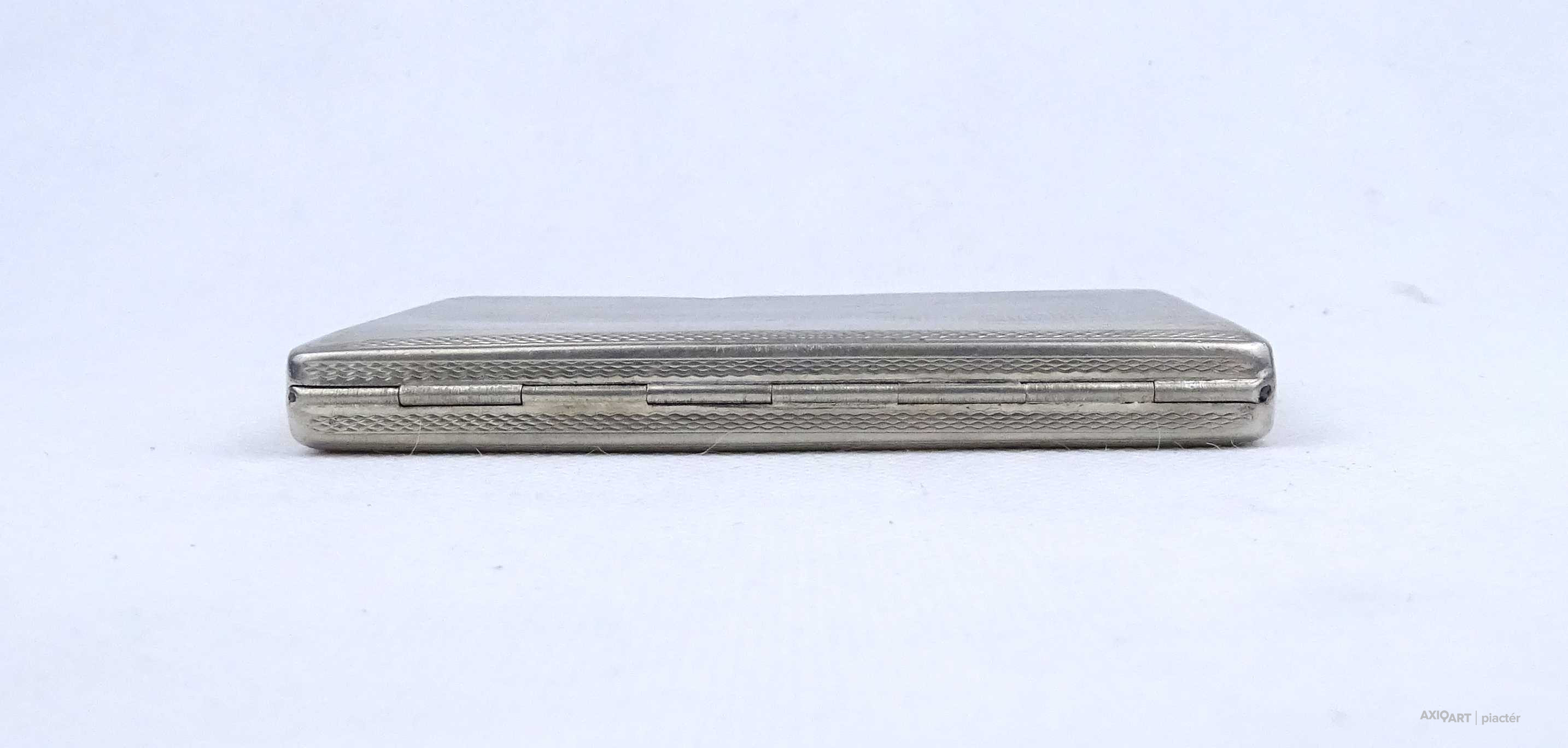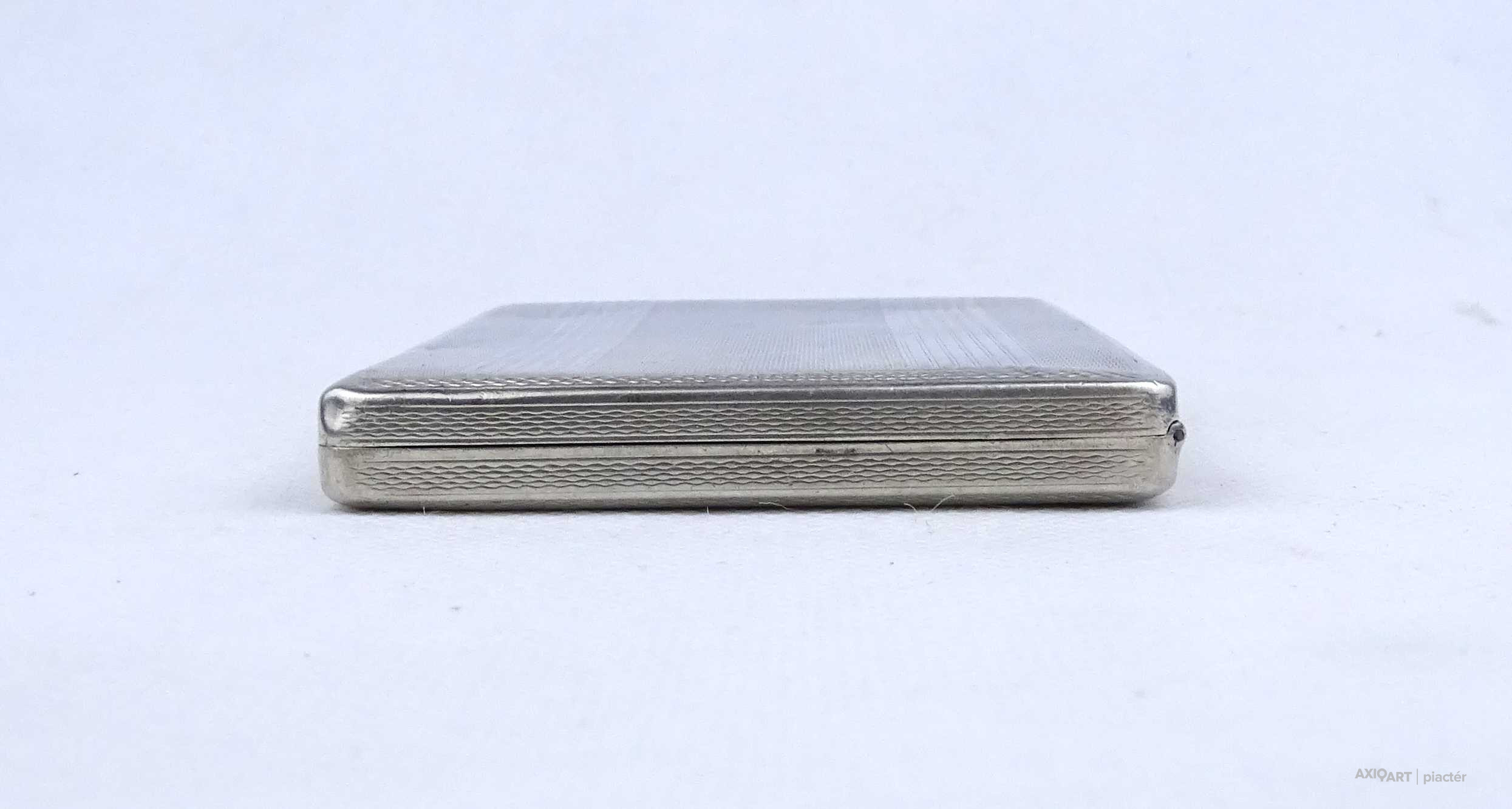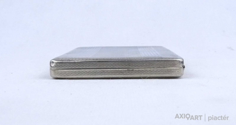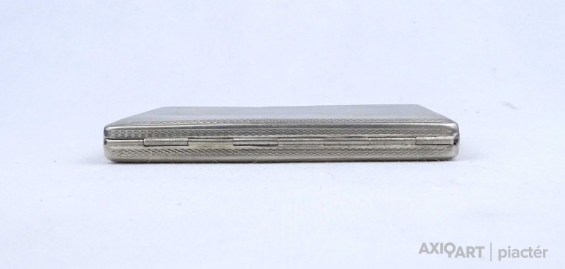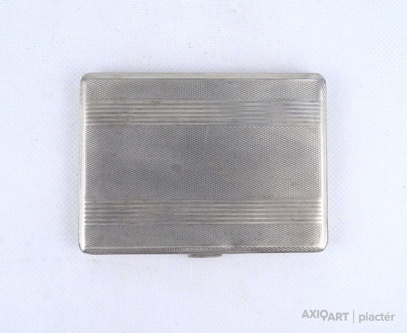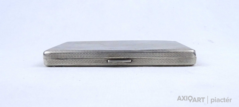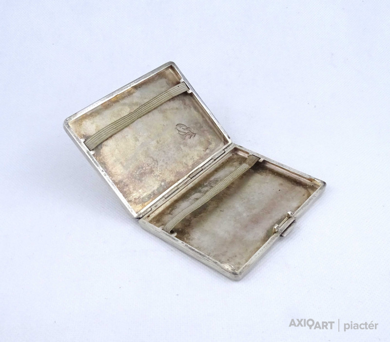 [2A057/IR] Régi, szép állapotú, jelzett, 800-as finomságú ezüst cigaretta tárca, cigaretta dózni. Peremén belül 800-as finomságú, 4-es, hátra néző gólya jelzés, mellette PV (Állami Pénzverő) gyártói jelzés. Belsejében vésett monogram található. Magasság: 1.2 cm Szélesség: 8 cm Hosszúság: 10.6 cm Súly: 0.123 kg