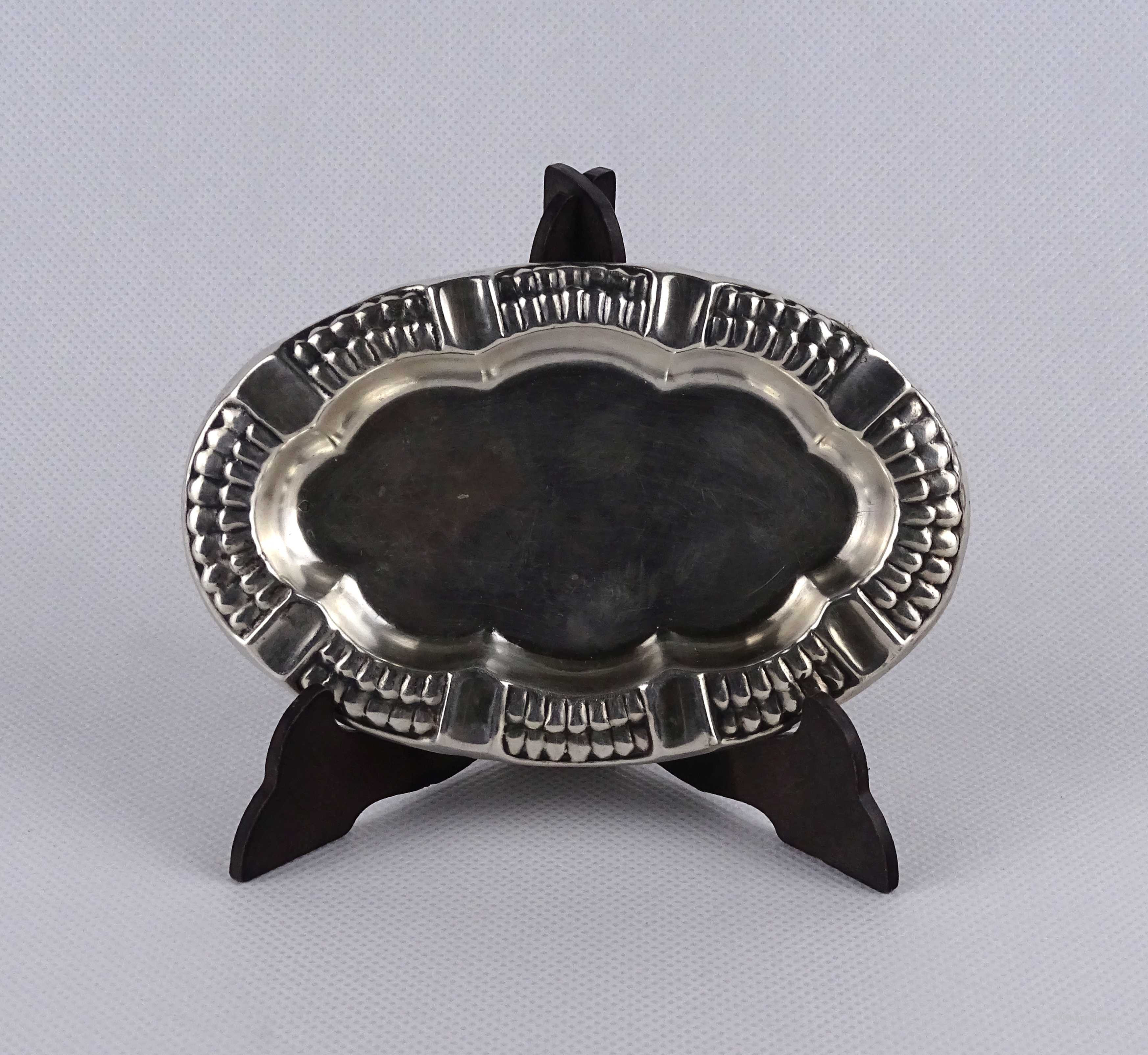 Antik, jelzett 800-as finomságú, hólyagos peremű, ovális alakú nyolc állásos ezüst hamutál.