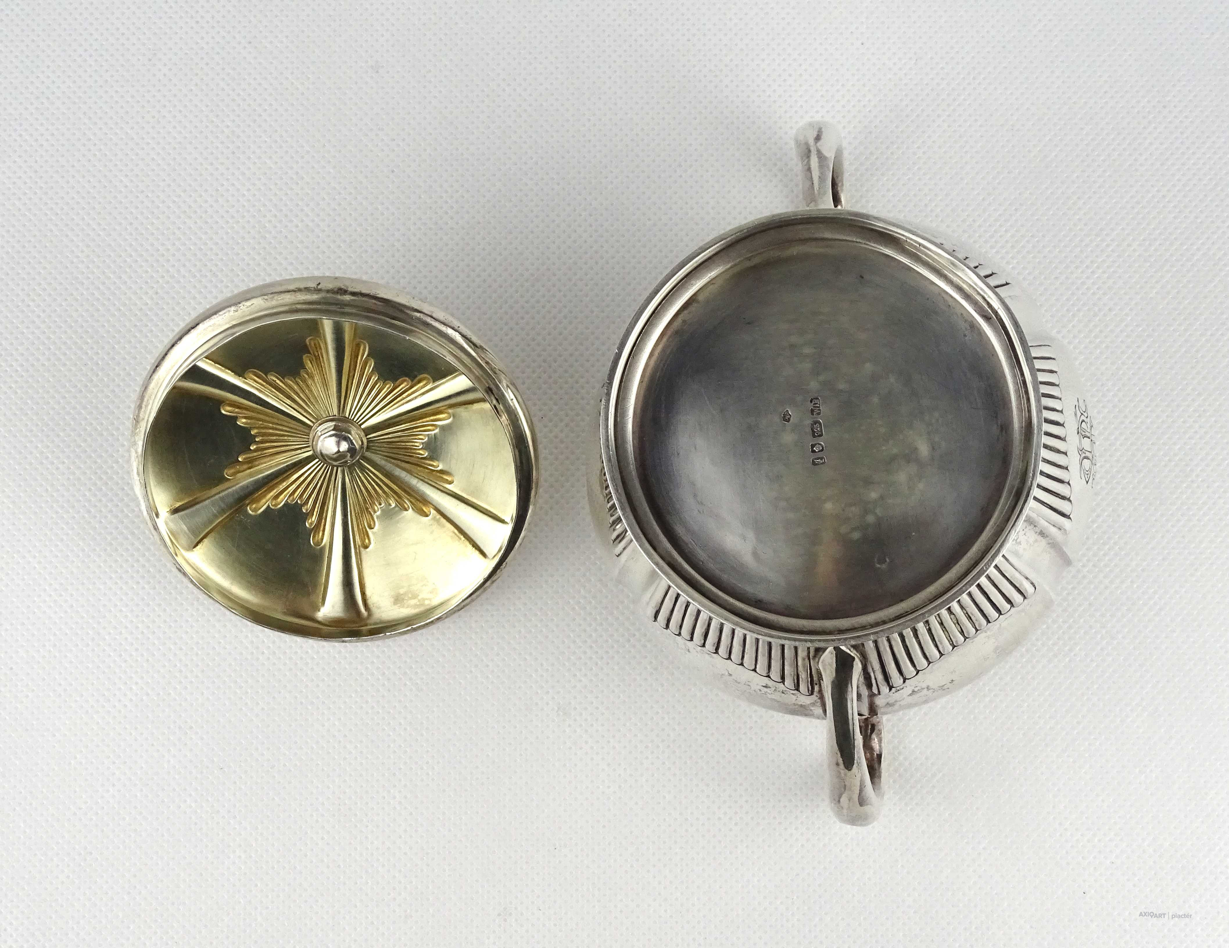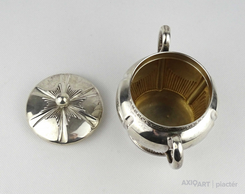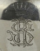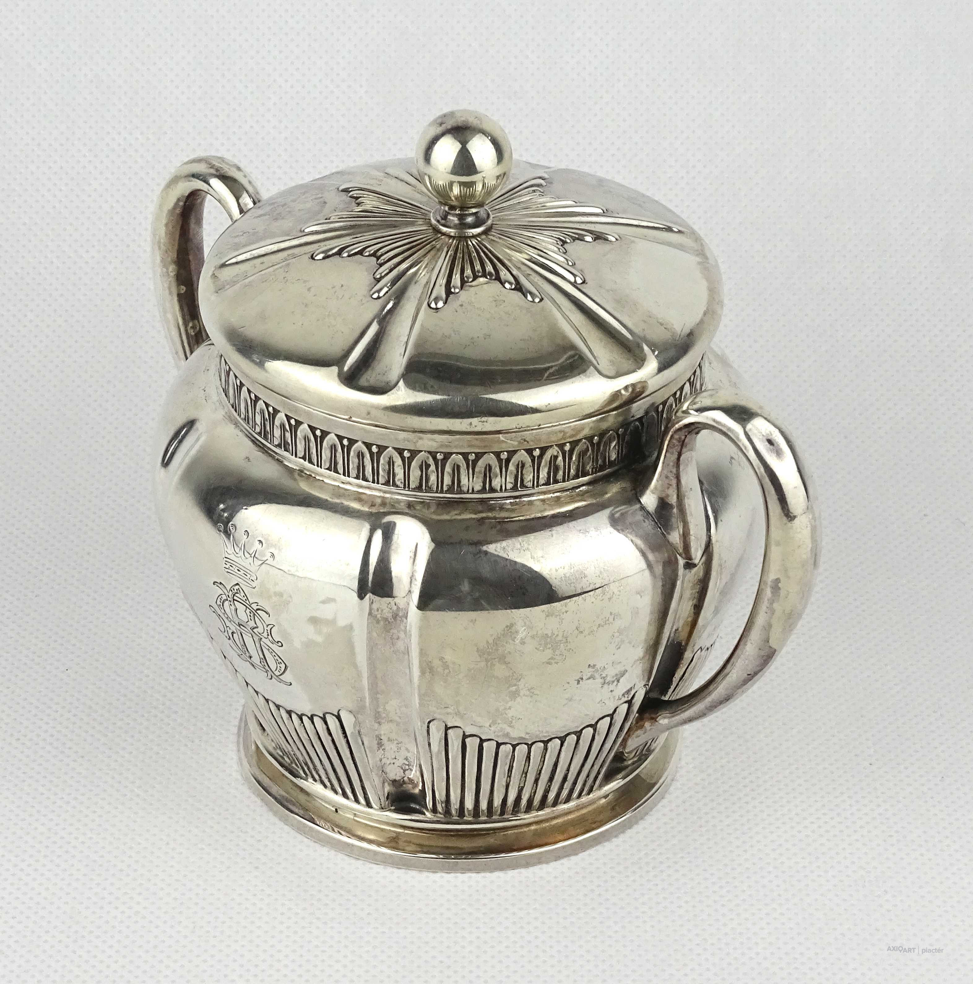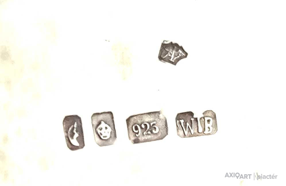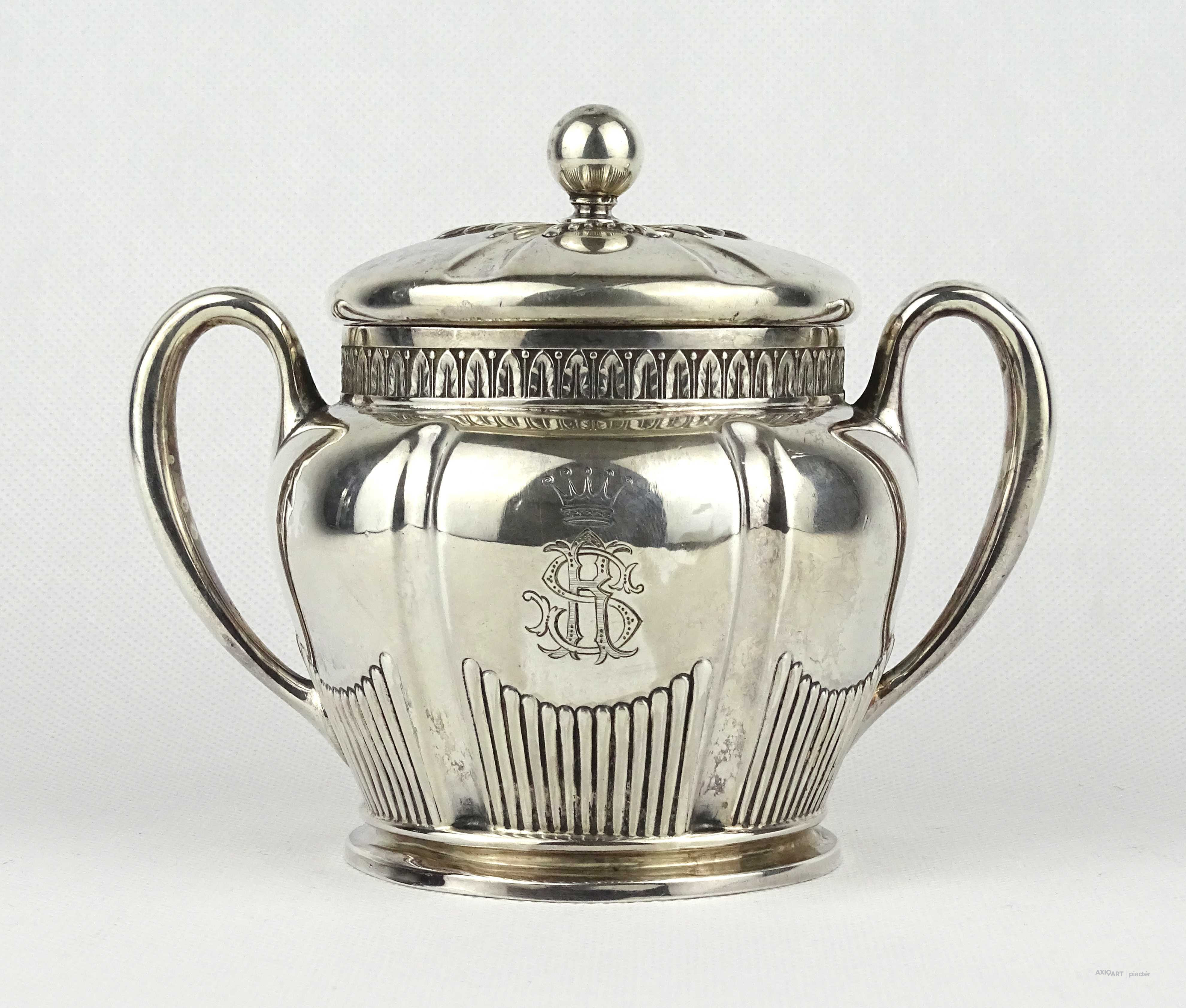 Régi, jelzett német 925-ös finomságú ezüst füles, fedeles bonbonier, oldalán vésett koronás SR monogrammal. Alján alulról beütött holdas koronás német 925 sterling jelzés és W B mesterjelzés látható. A bonbonier fedelébe és aljába beütve megtalálható még az 1937 előtti behozatali fémjel.