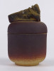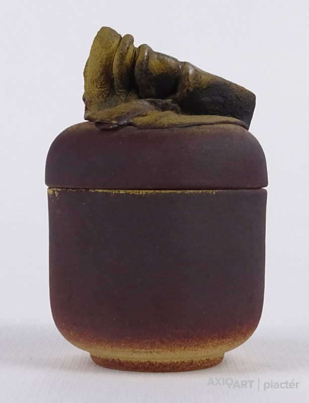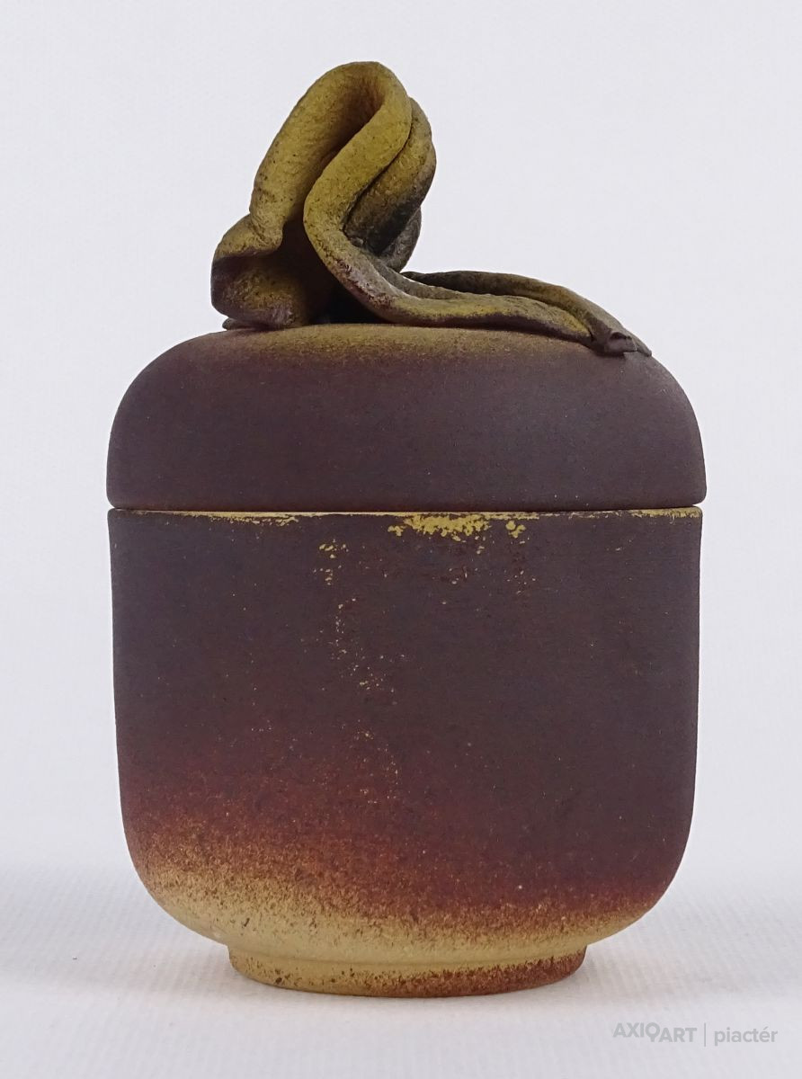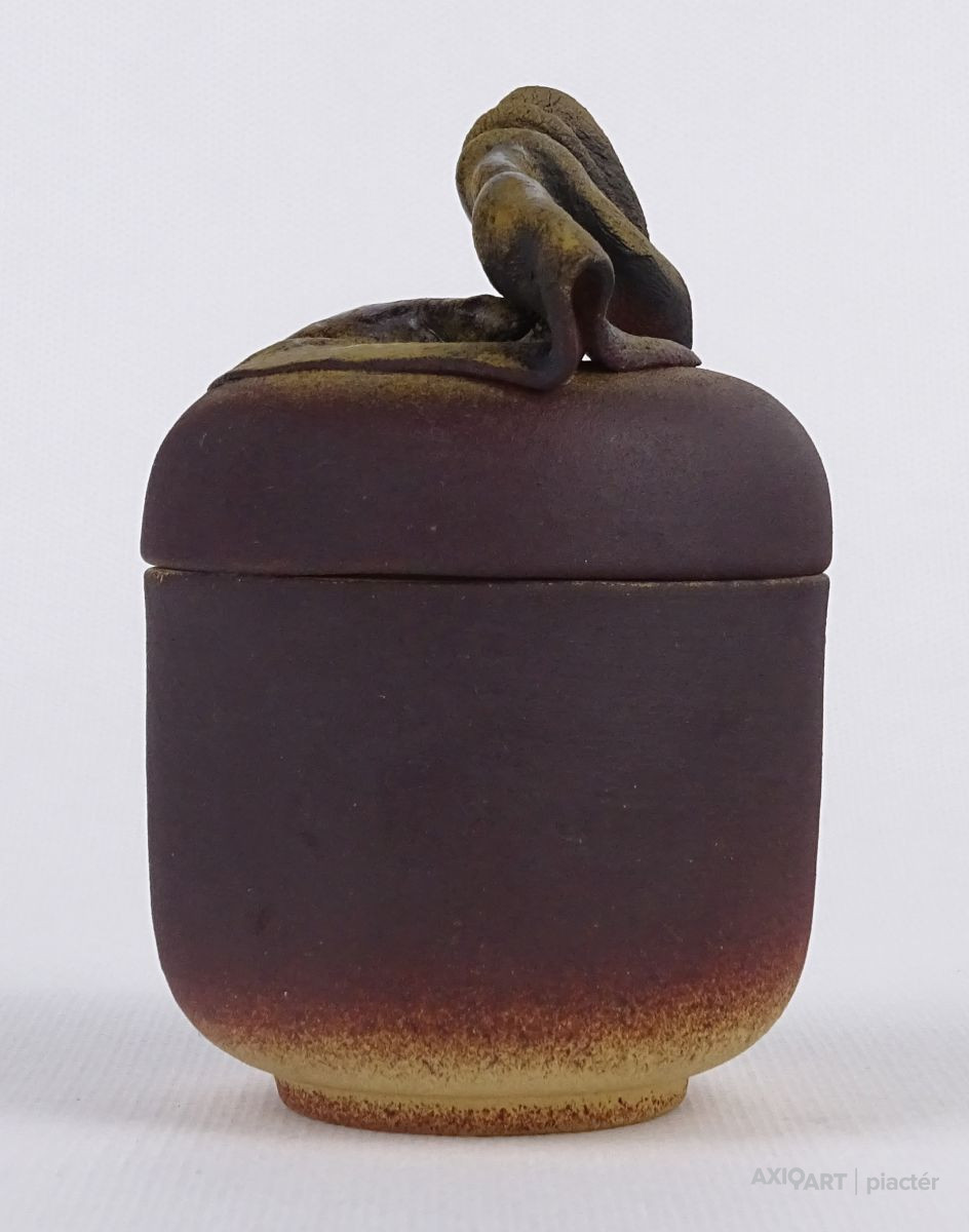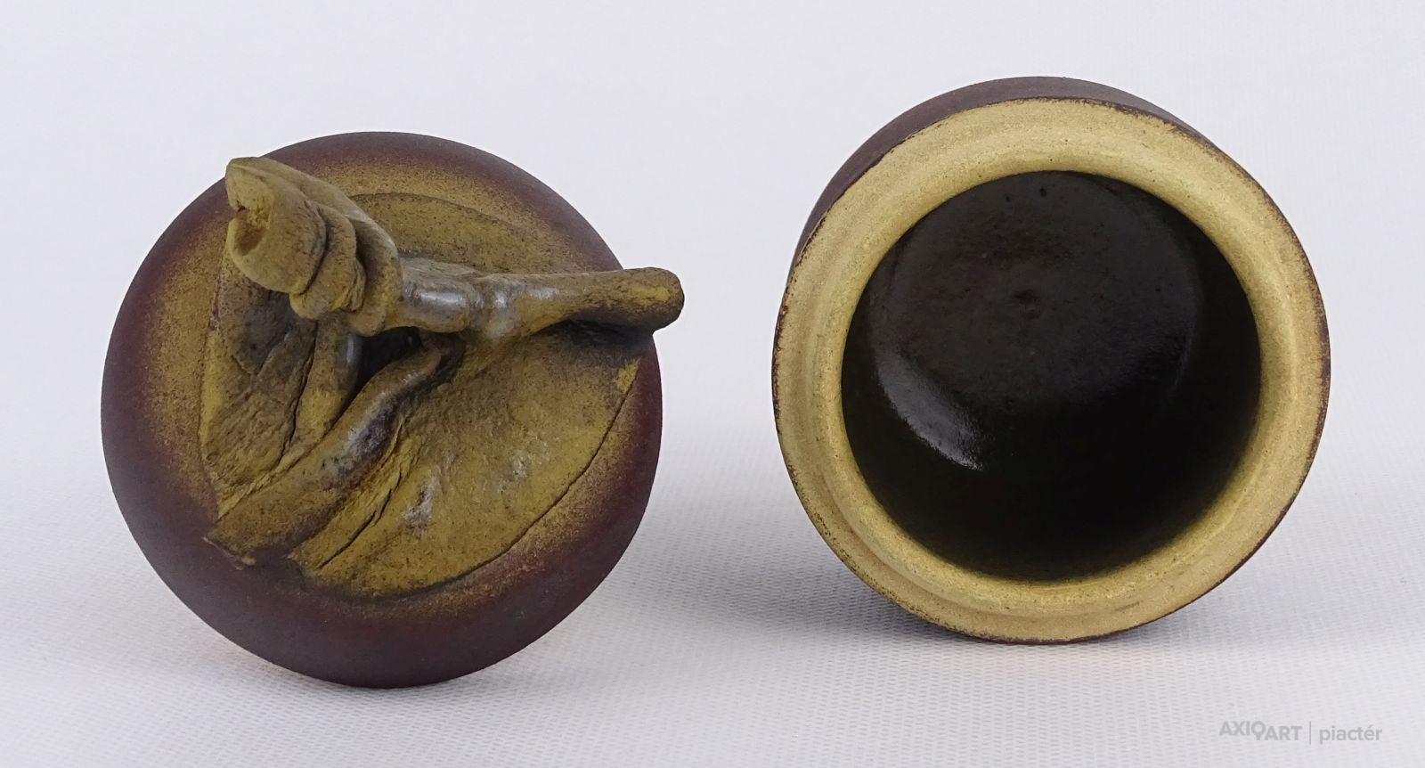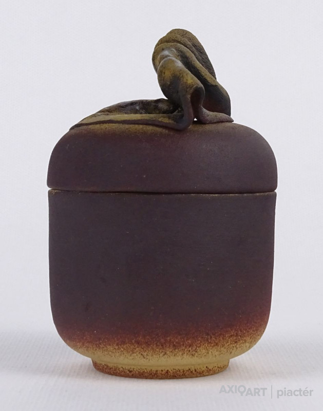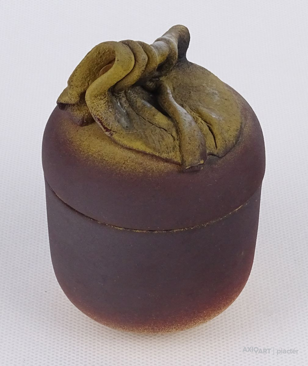 [1N826/X174] Mid century máz nélküli barna színű tetején plasztikusan díszített kerámia bonbonier. Alján karcolt jelzés, lásd fotó. Magasság: 10.5 cm Szélesség: 7 cm Súly: 0.175 kg