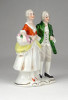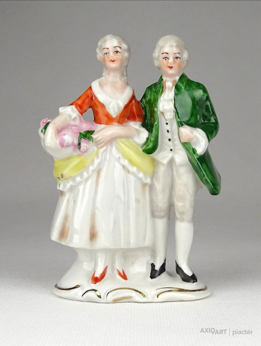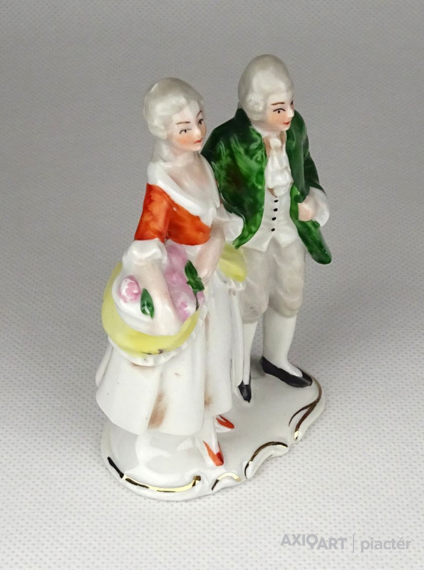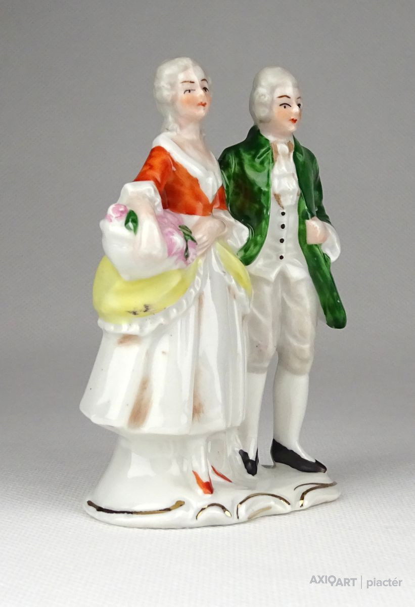 Régi kis méretű kétalakos barokk főúri páros porcelán szobor, talapzaton. Hibátlan állapotú jelzett darab. Alján kék koronás jelzés, lásd fotó.